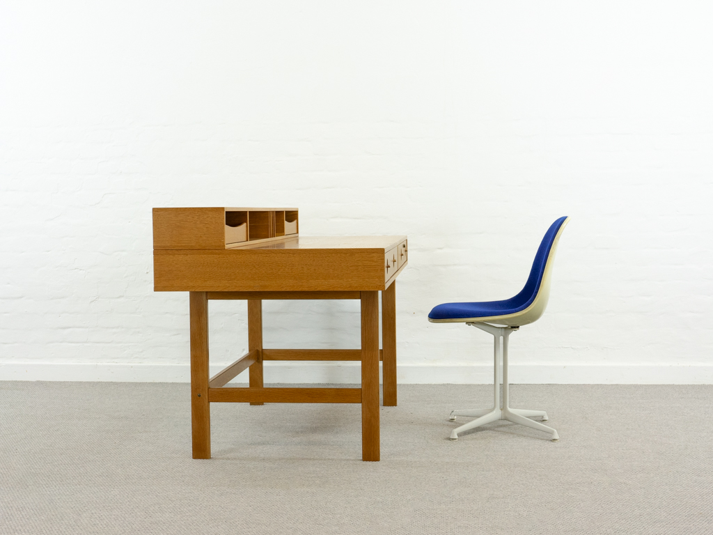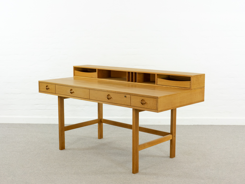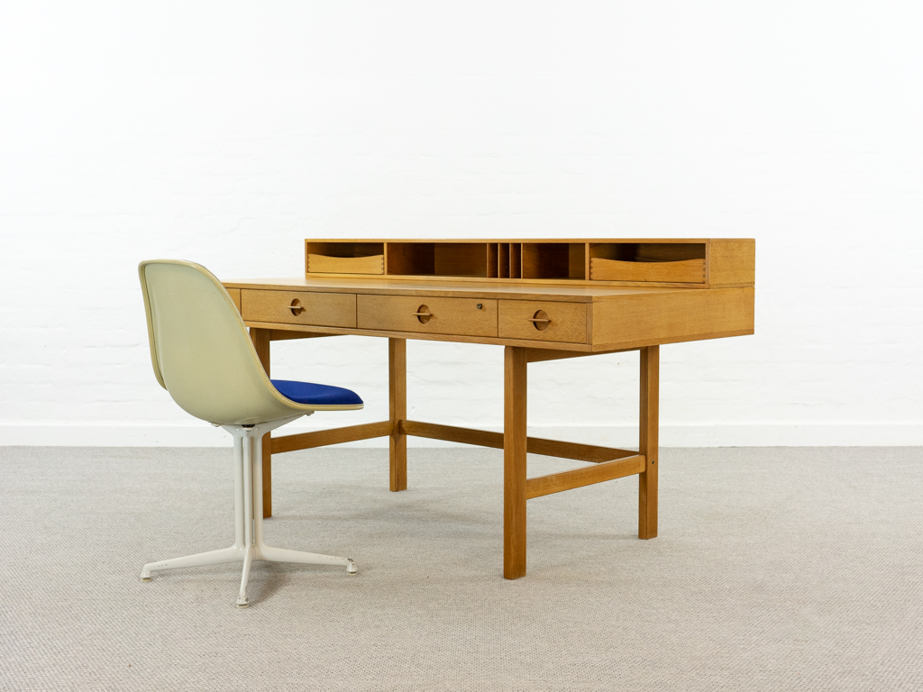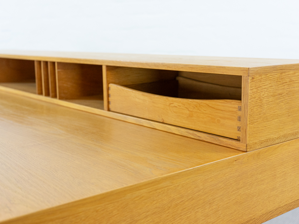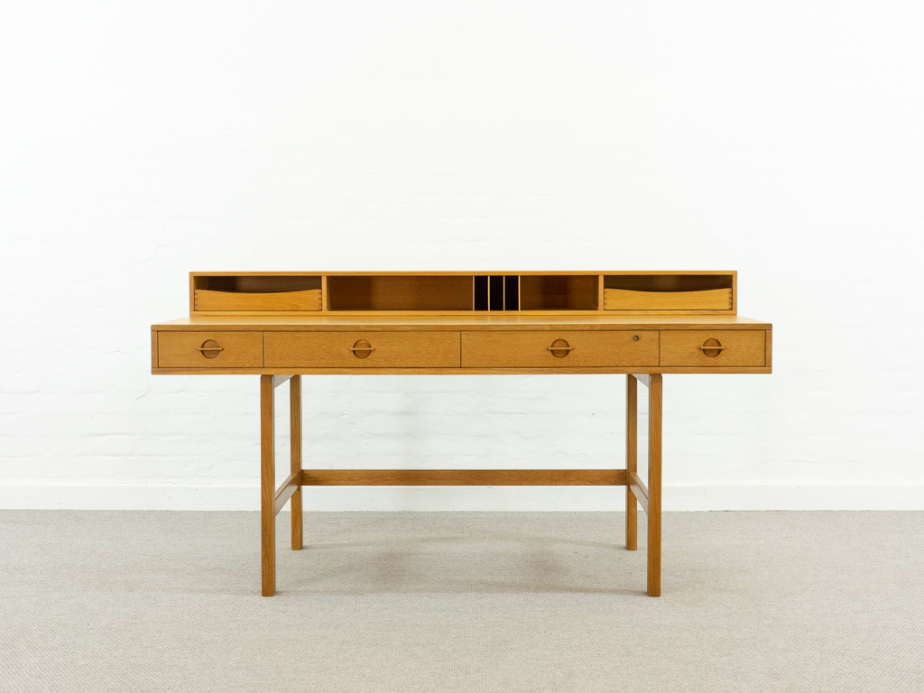 Flip-Top Desk by Jens Quistgaard for Peter Løvig Nielsen, Denmark. A top example of the mid century danish design movement. The top piece/shelf is hinged and the table can be converted in a larger working table-top for 2 people. The table is executed in oakwood. Labeled underneath with Lovig stamp and year of manufacture (1970). Very good condition. The chairs which are shown are not part of this offer.