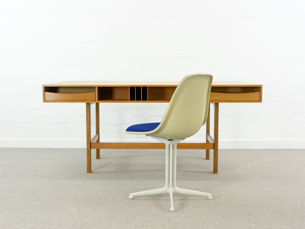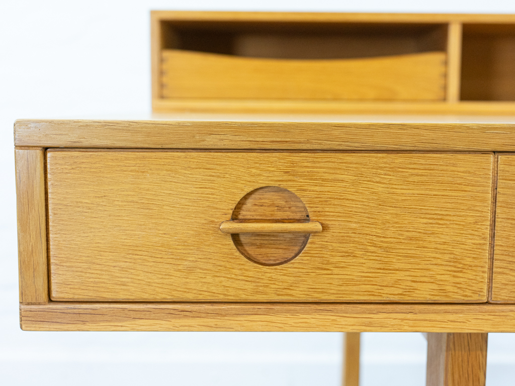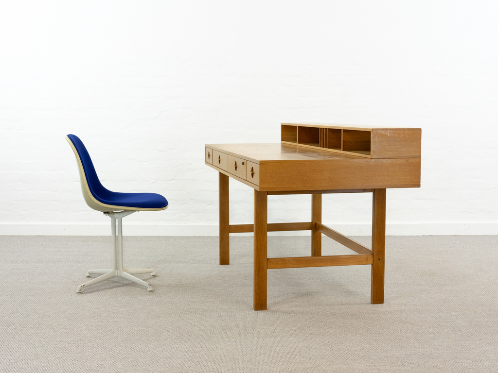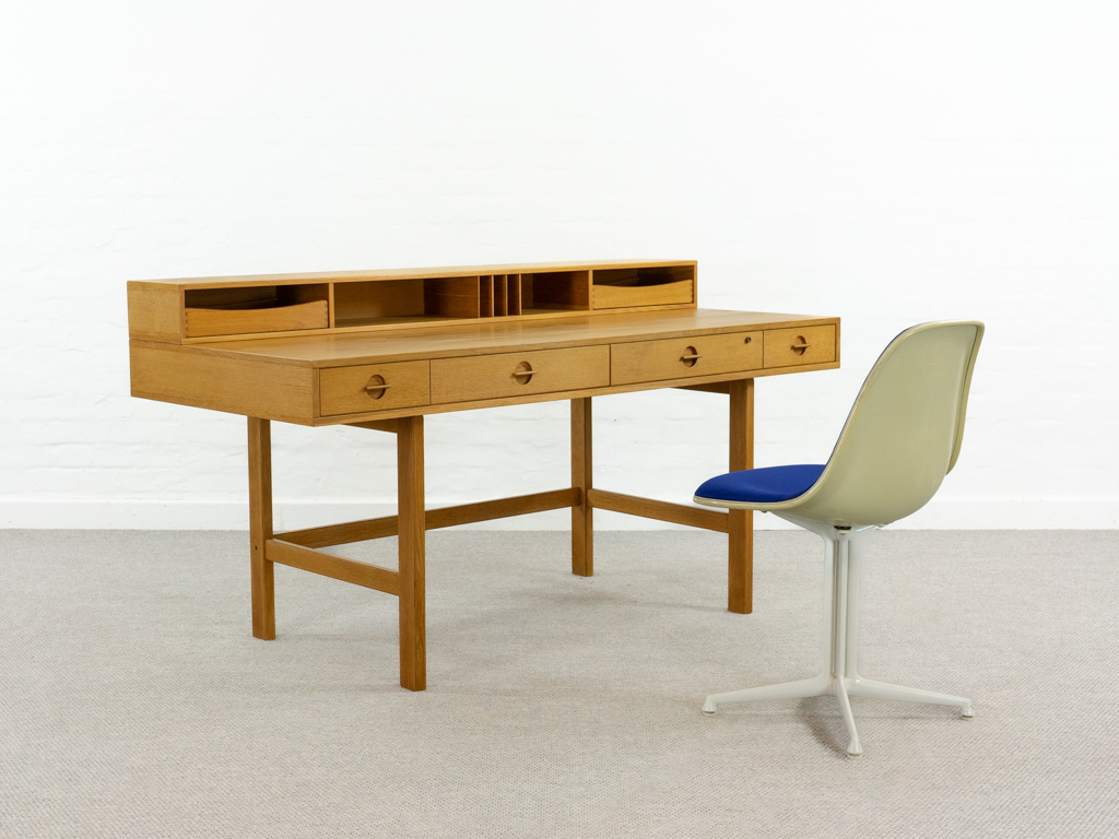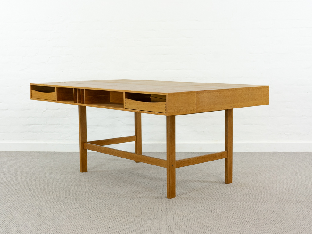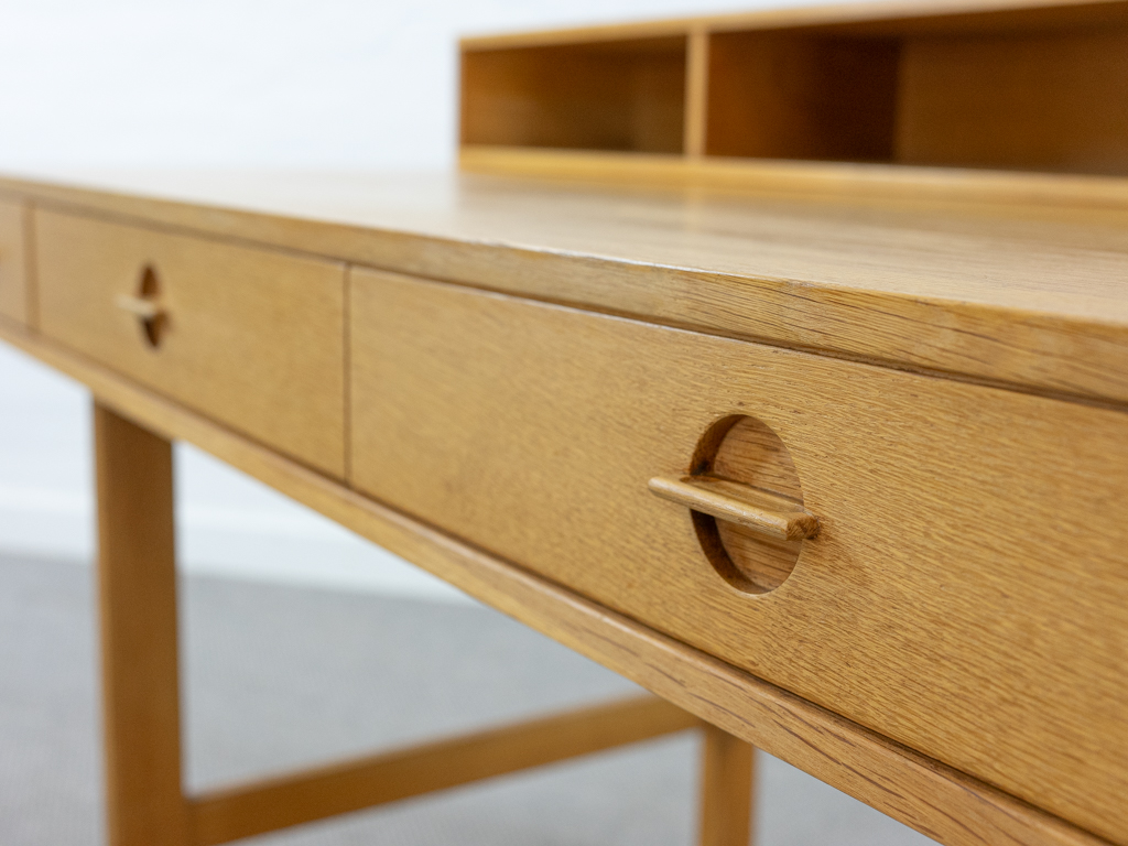 Flip-Top Desk by Jens Quistgaard for Peter Løvig Nielsen, Denmark. A top example of the mid century danish design movement. The top piece/shelf is hinged and the table can be converted in a larger working table-top for 2 people. The table is executed in oakwood. Labeled underneath with Lovig stamp and year of manufacture (1970). Very good condition. The chairs which are shown are not part of this offer.