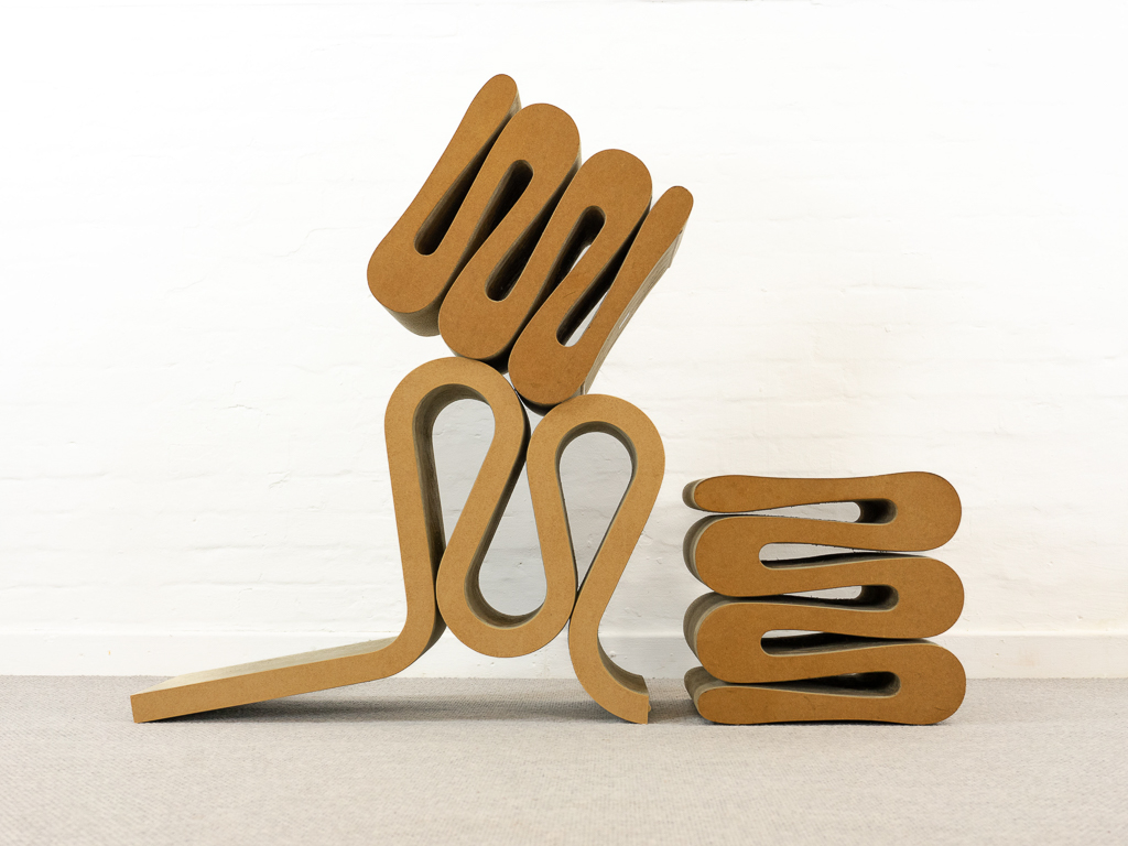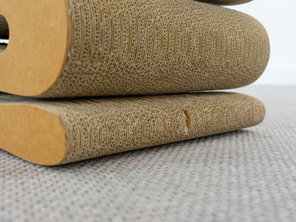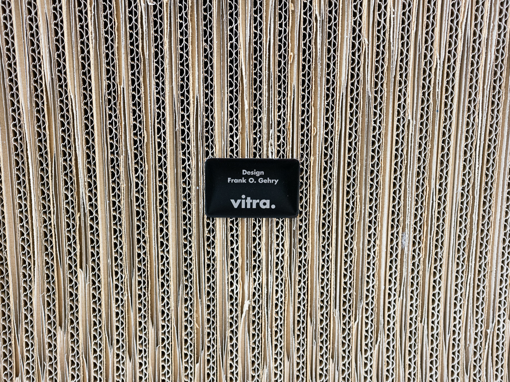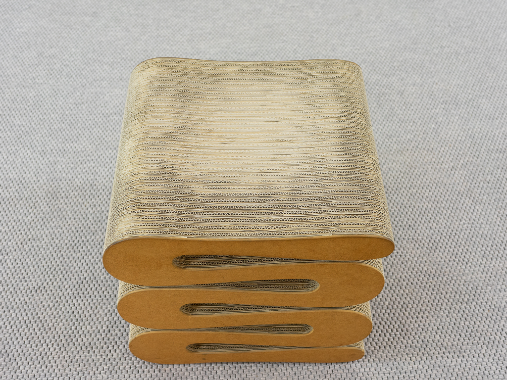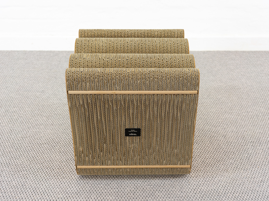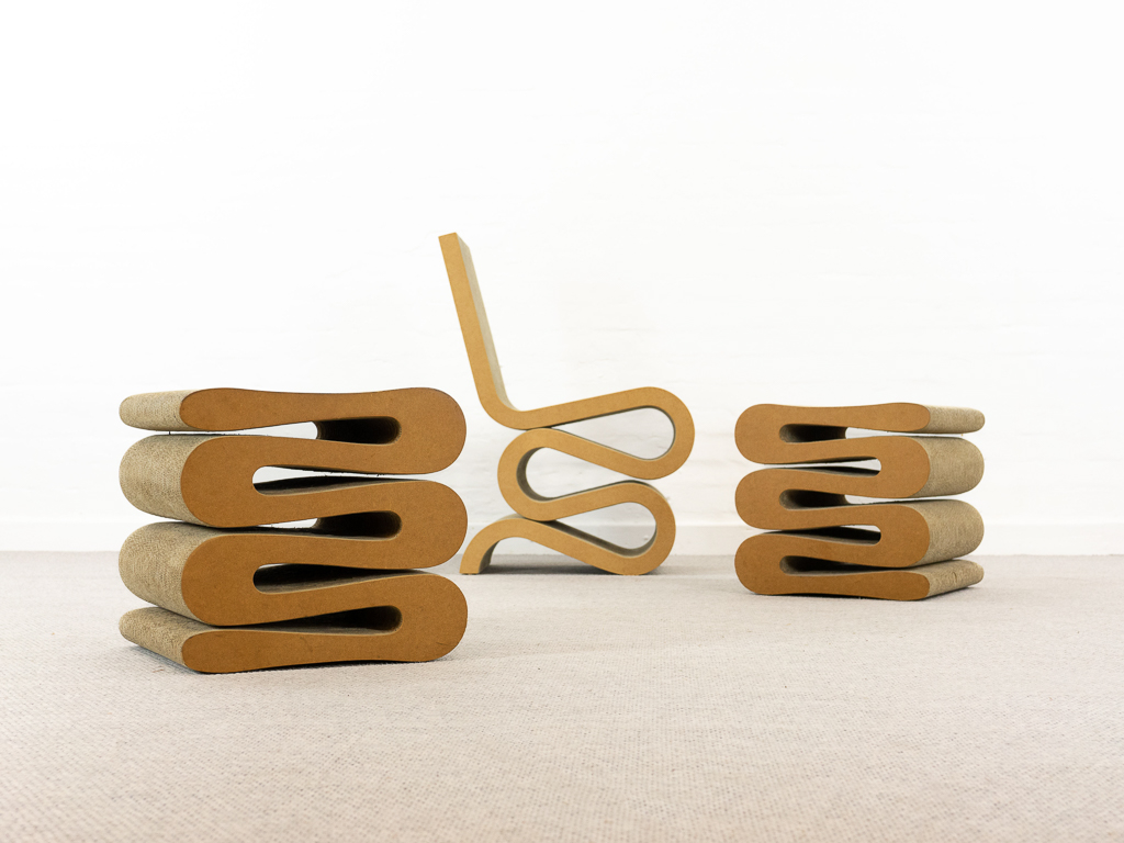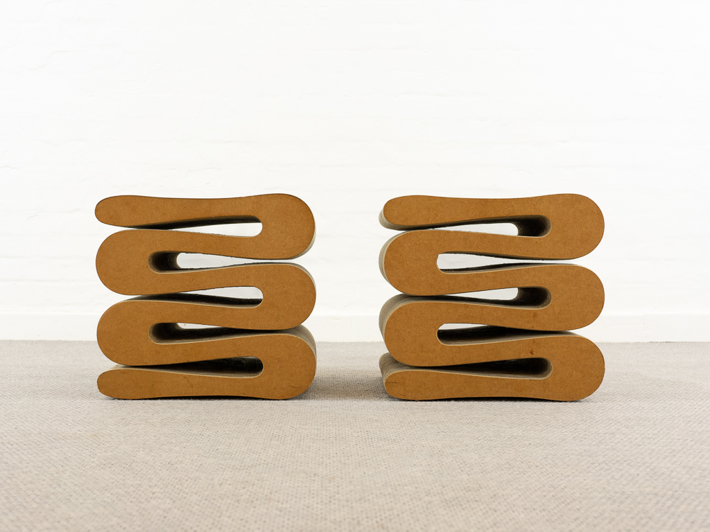 Pair of vintage Wiggle Stools by famous architect Frank O. Gehry. Manufactured by Vitra. Makes also nice nightstands or occasional side tables. The pieces are made of corrugated cardboard and hardboard to the edges. Labelled on downside. Dimensions: H:40.5cm, W: 42.5cm, D:40cm. Only 1 piece left.