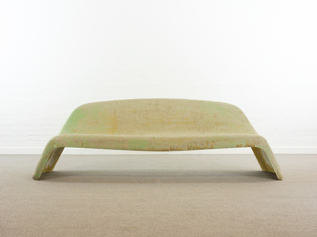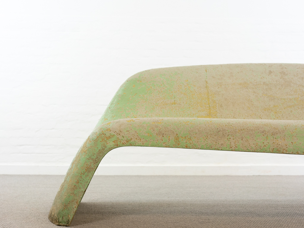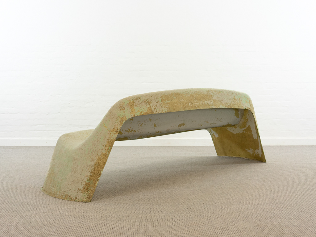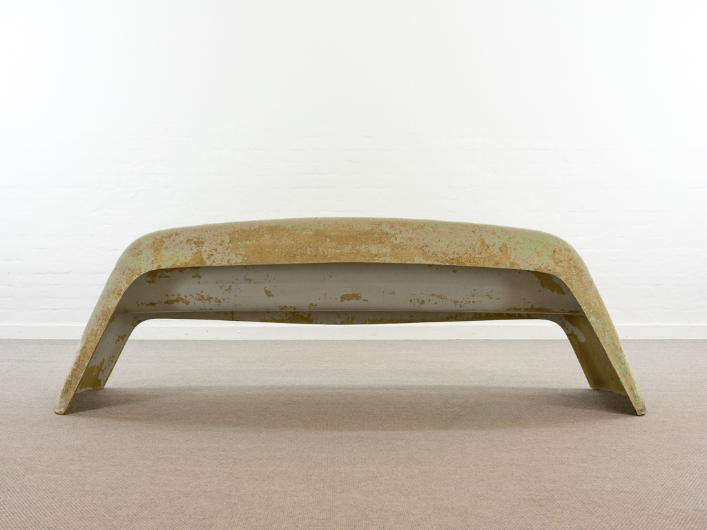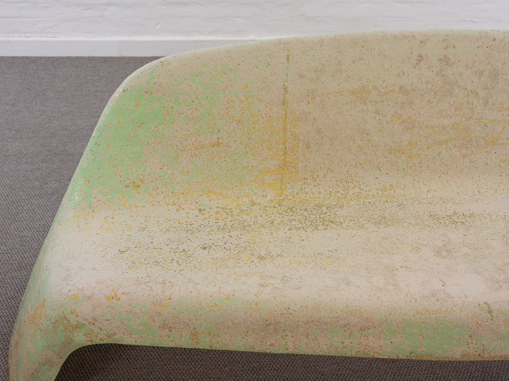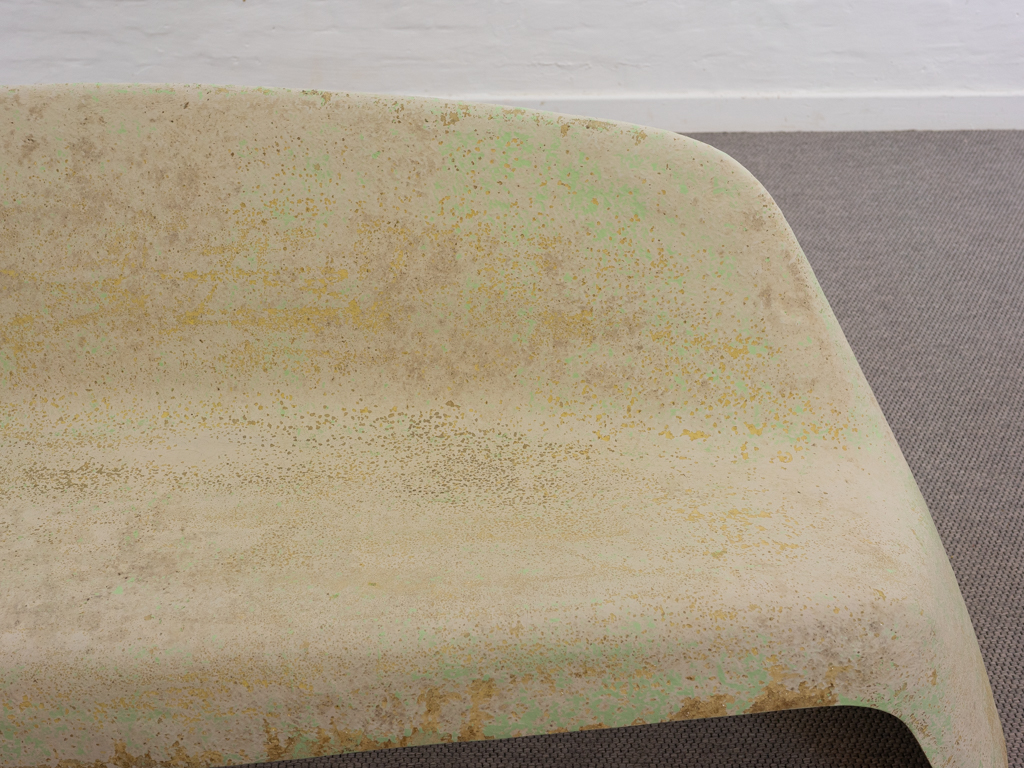 Garten Bench Model “1000”, so called “Bärenbank”. Organisch post-war design from 1964 von Walter Papst for Wilkhahn. Executed in fibreglass / fiberglass. Super durable and withstands the weather in summer and winter. Dimensions: W. 240cm, D: 70cm, H: 75cm.Strong, obvious and charming patination. Signs of use and age / remnants of paint.