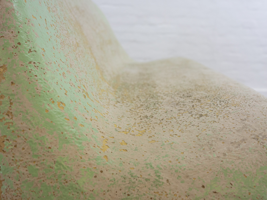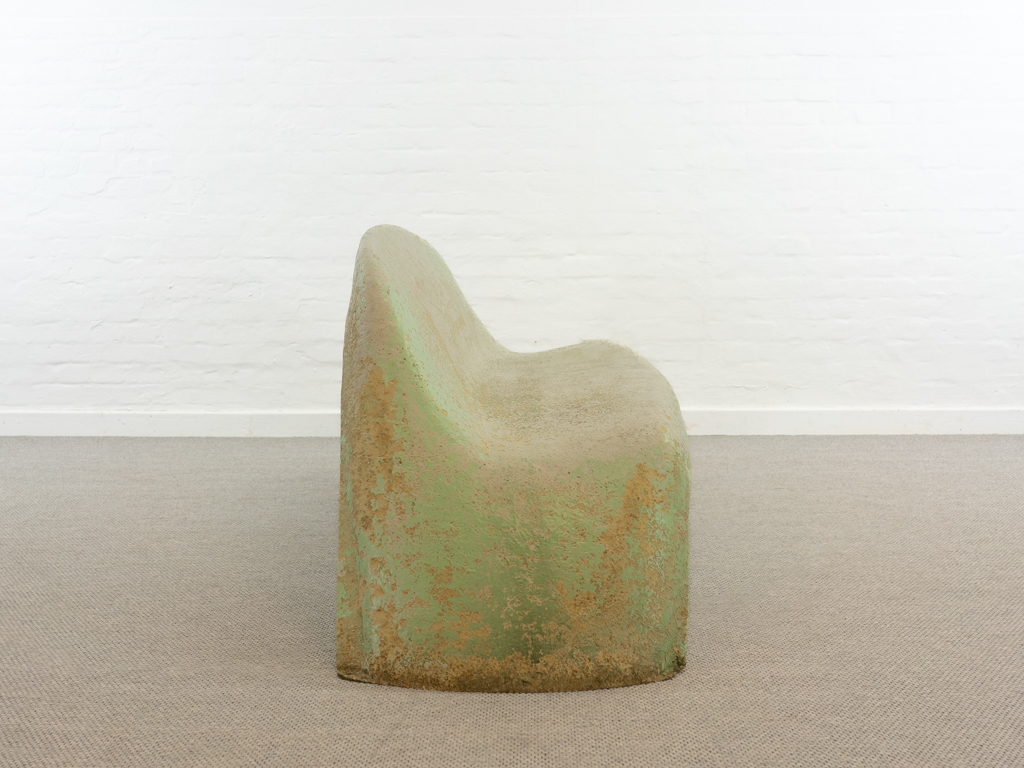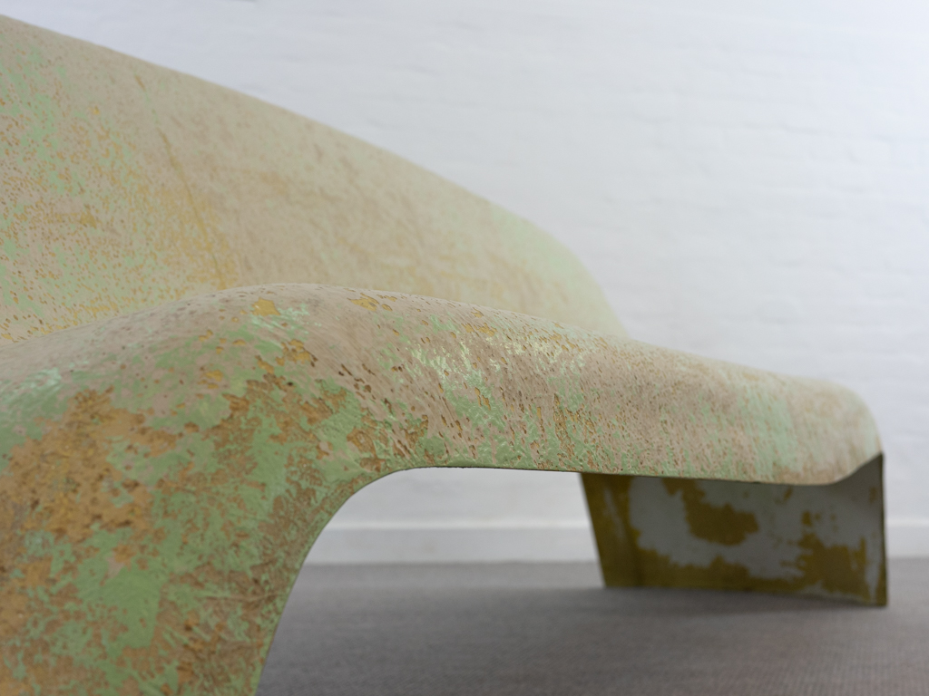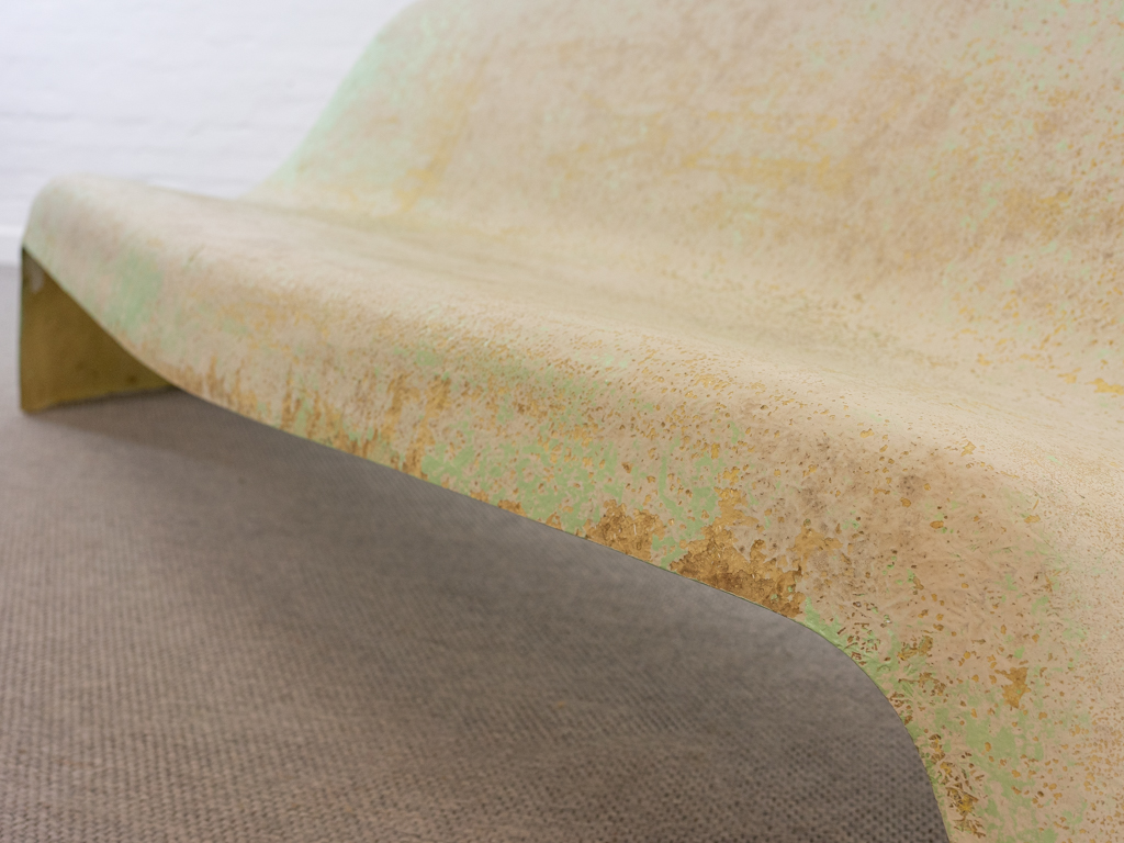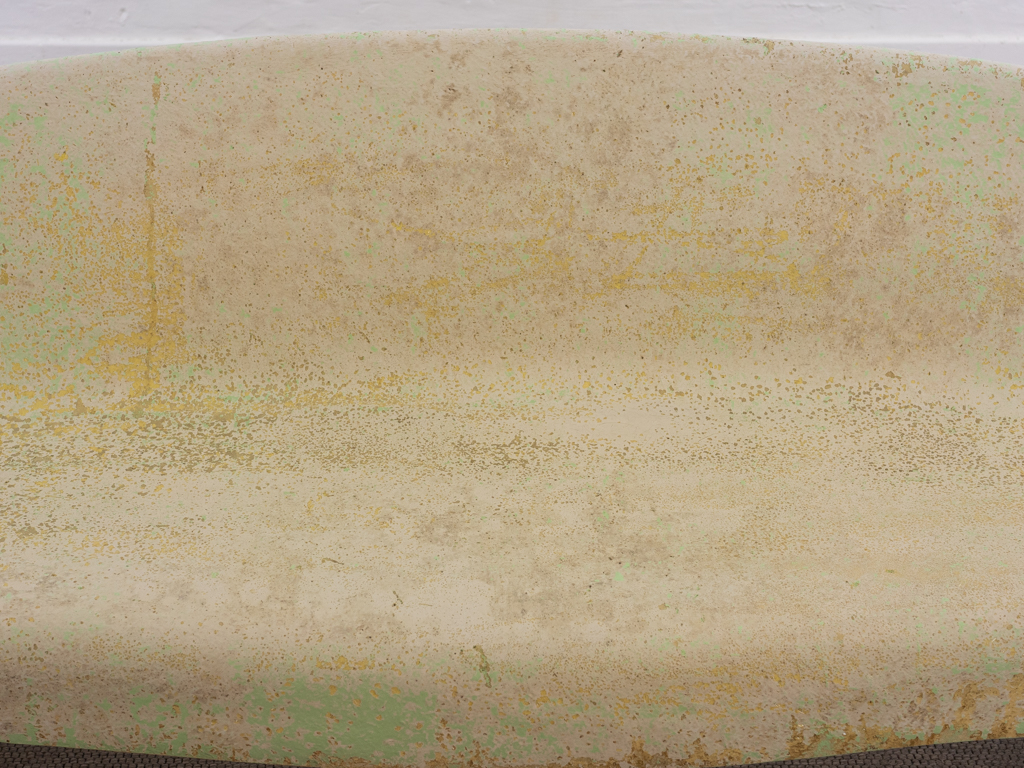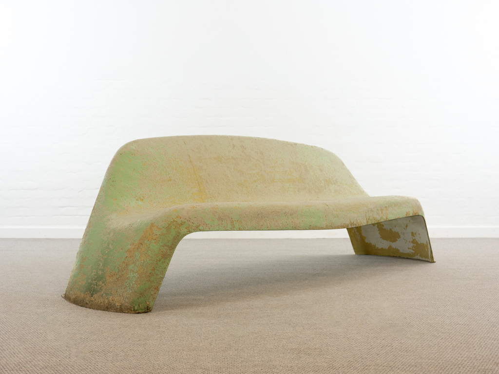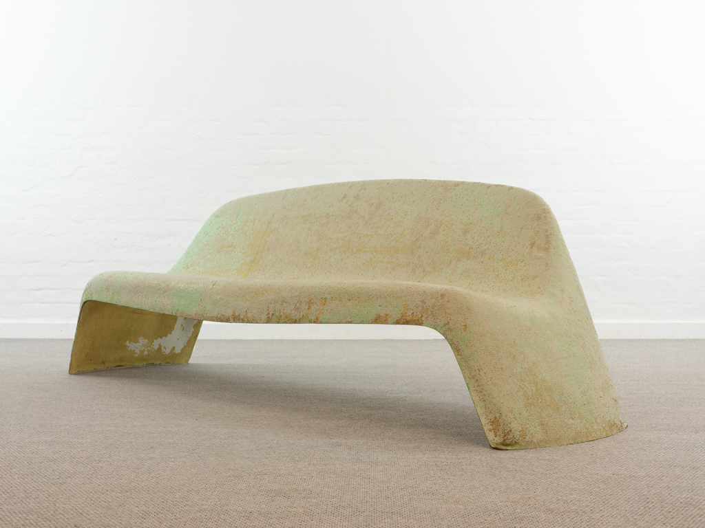 Garten Bench Model “1000”, so called “Bärenbank”. Organisch post-war design from 1964 von Walter Papst for Wilkhahn. Executed in fibreglass / fiberglass. Super durable and withstands the weather in summer and winter. Dimensions: W. 240cm, D: 70cm, H: 75cm.Strong, obvious and charming patination. Signs of use and age / remnants of paint.