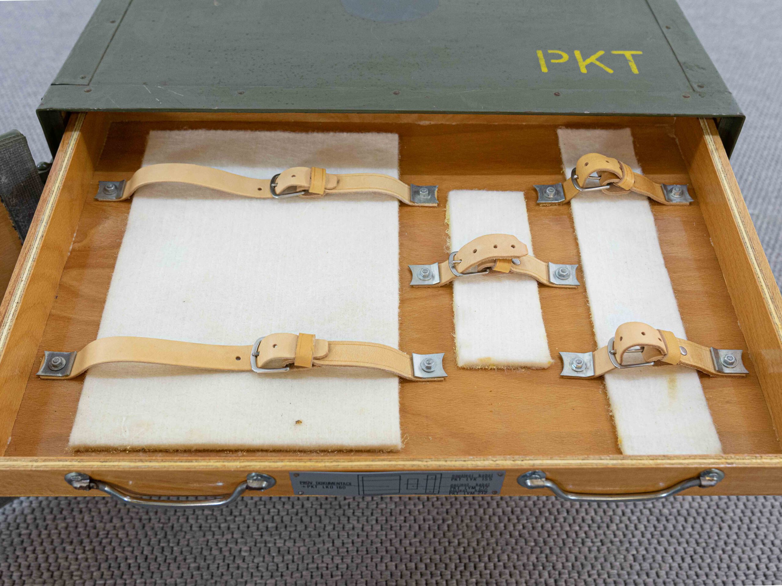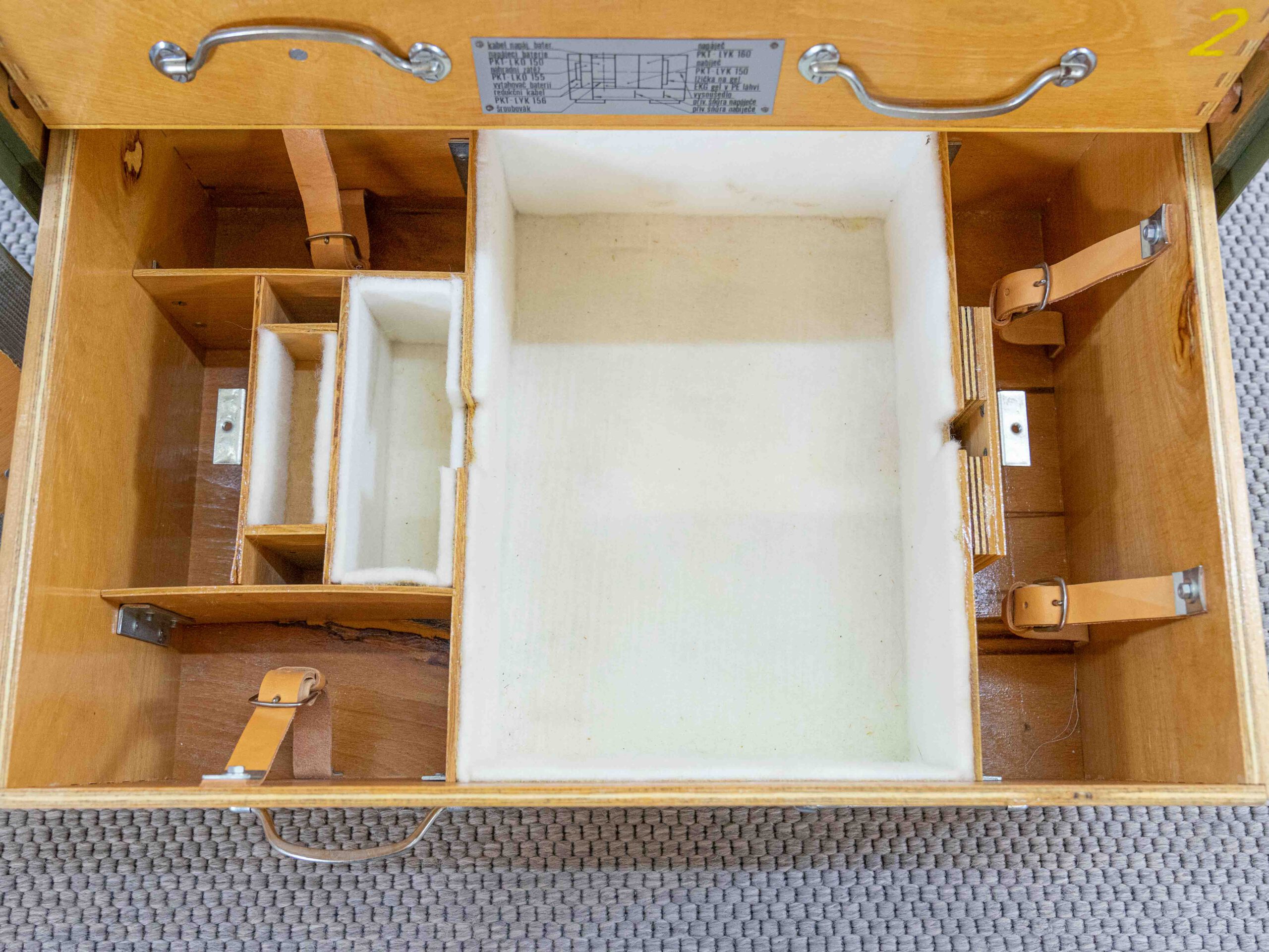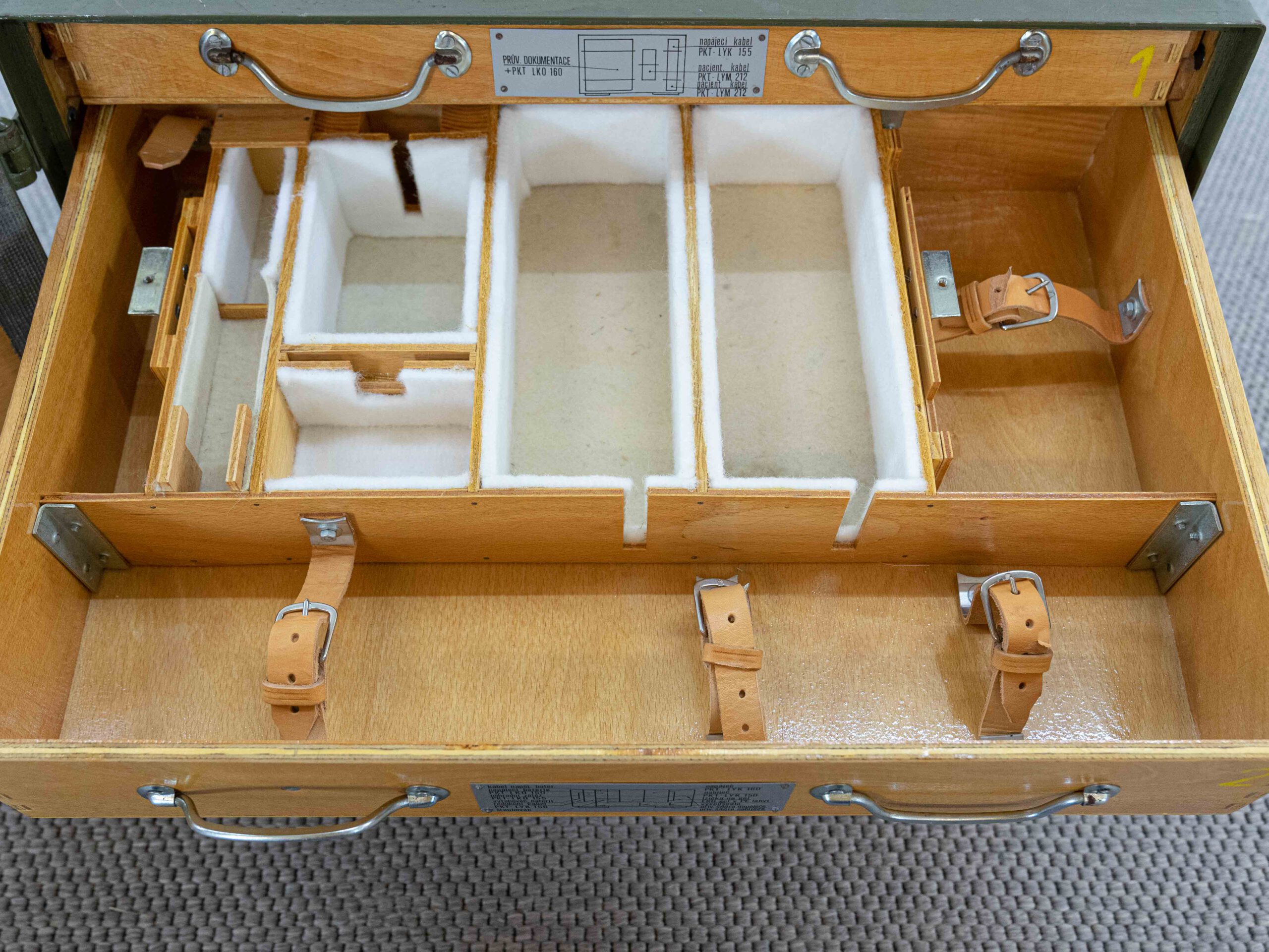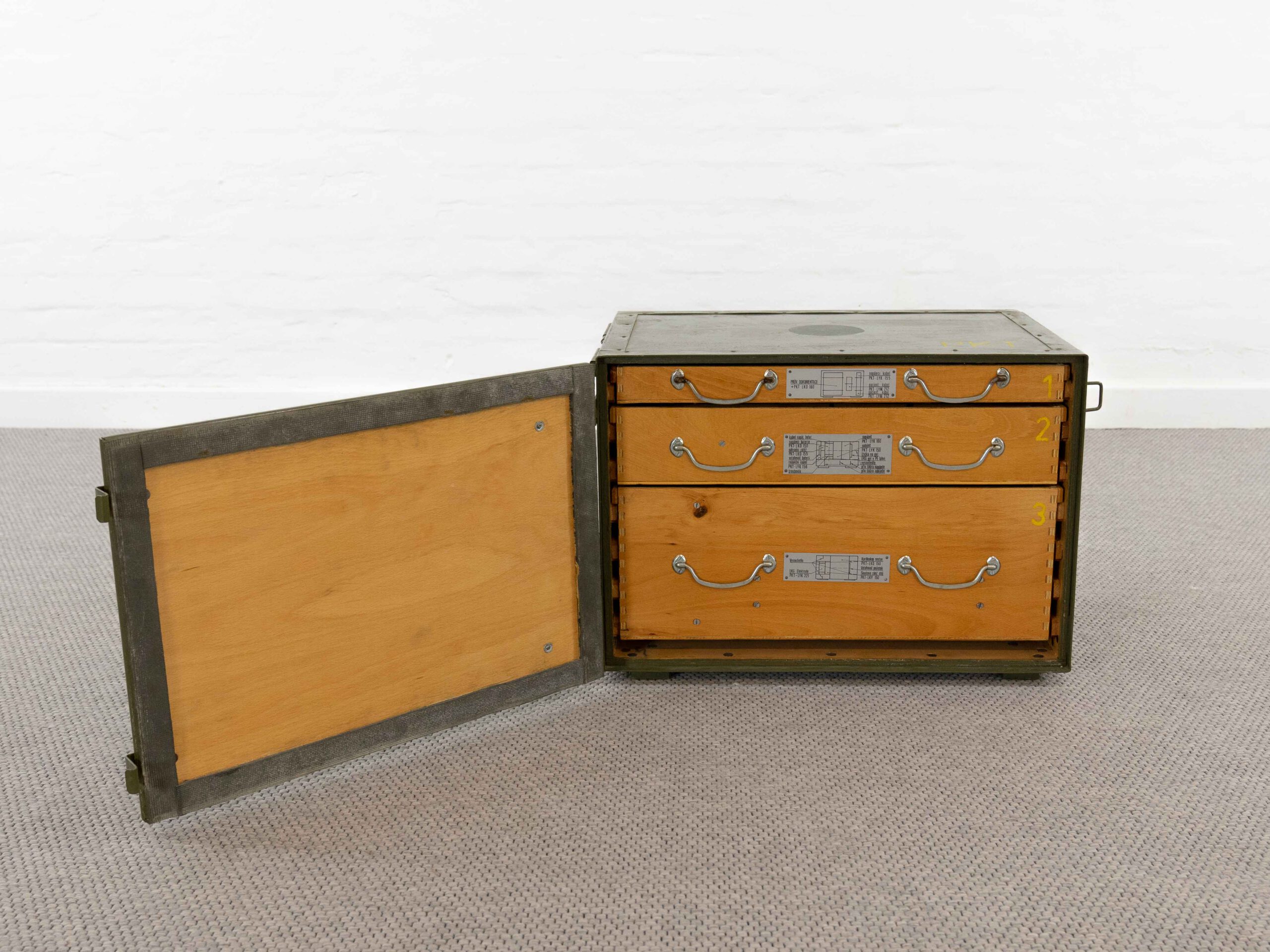 Medical Chest, presumably east-european, with locking-door and 3 drawers. Formerly to store medical equipment. Stylish storage facility, for example watches, jewellery or other items. Dimensions: W 69cm, D 41cm, H 40.5cm, weight 25Kg