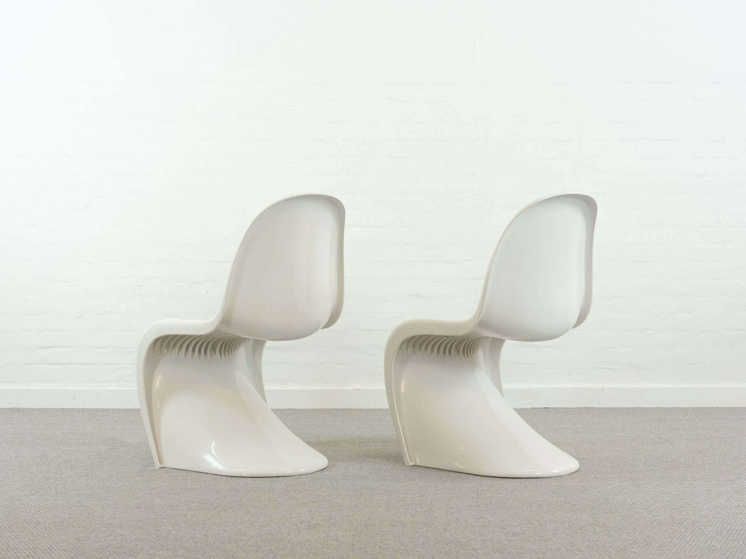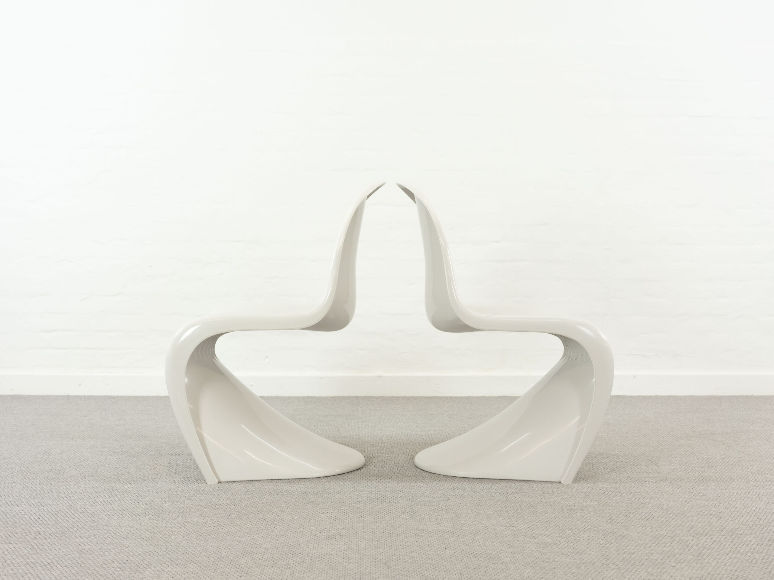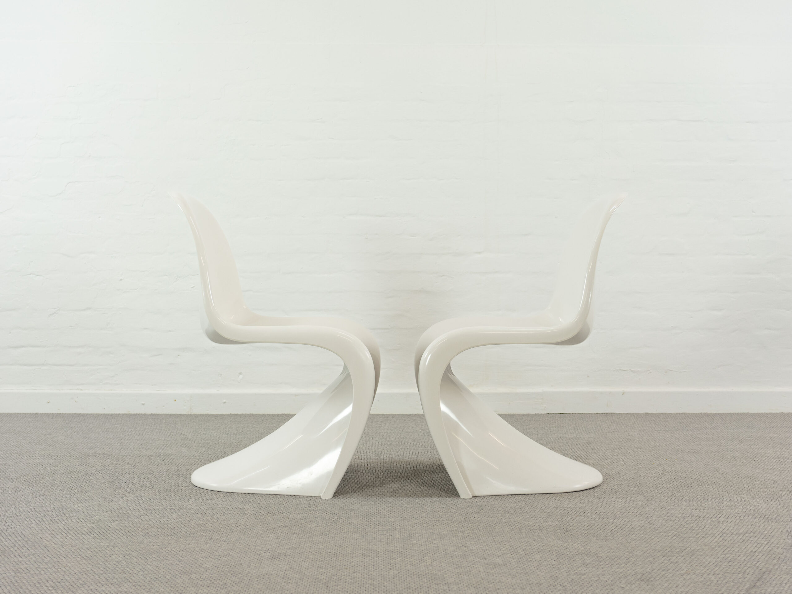 Set (2) Panton s-chairs, designed by Verner Panton for Hermann Miller / Fehlbaum. Color: white. The chairs are from the 2nd production run from 1970 onwards in thermoplastic luran-s with reinforcement ribs underneath. Marked with manufacturers logo and production date: 1976. Still nice and shiny, scratches and minor wear on seat-area.