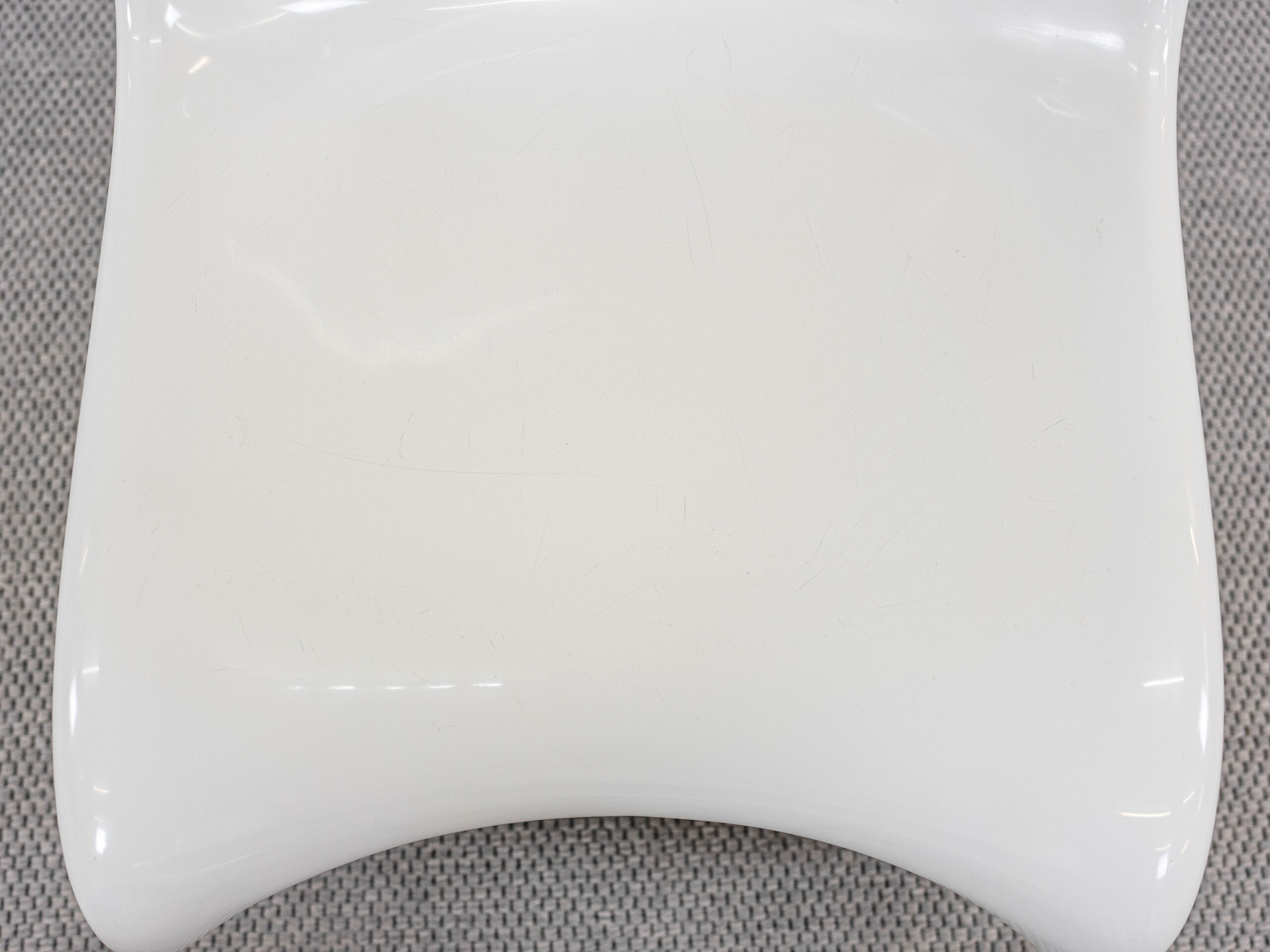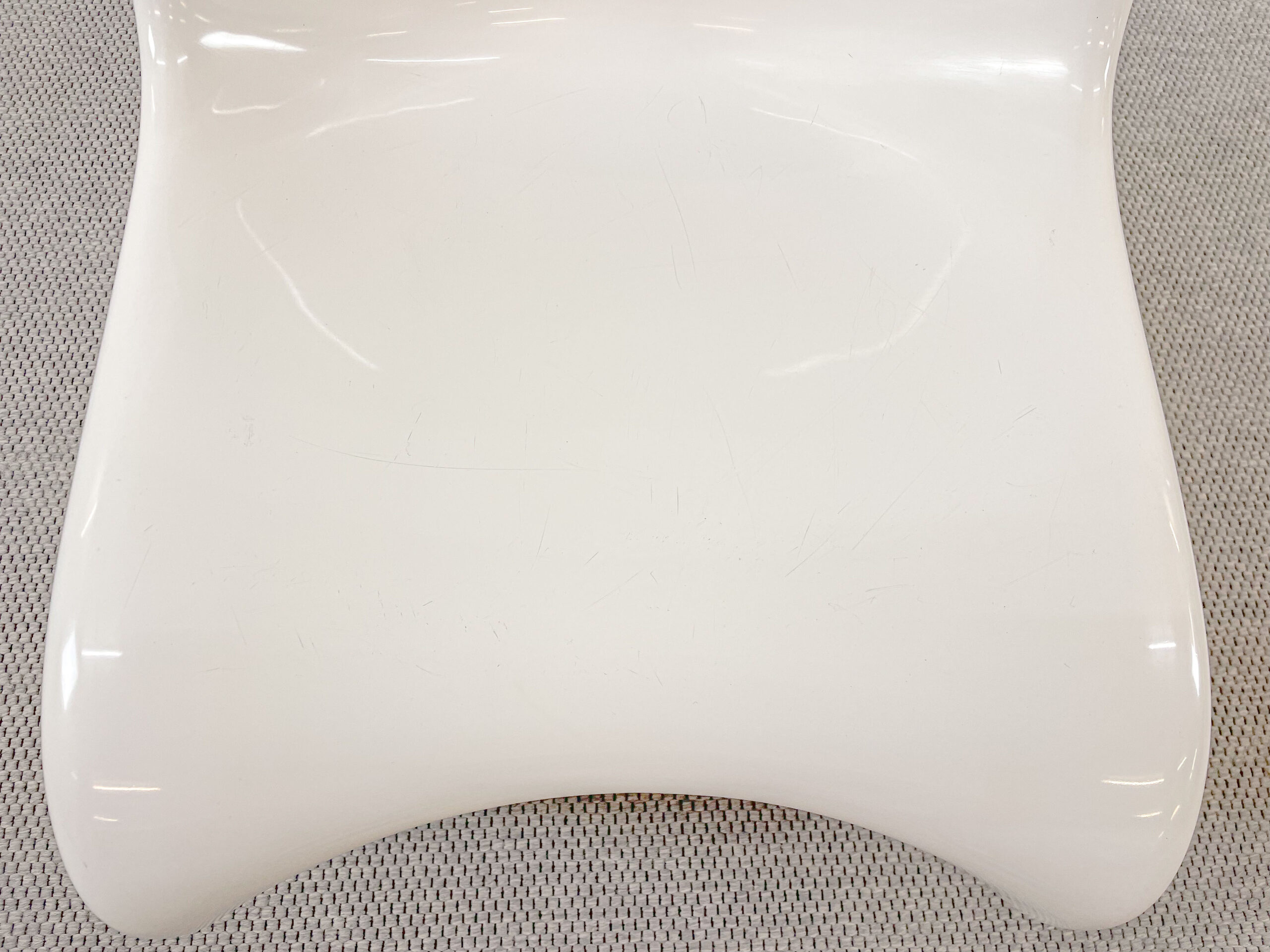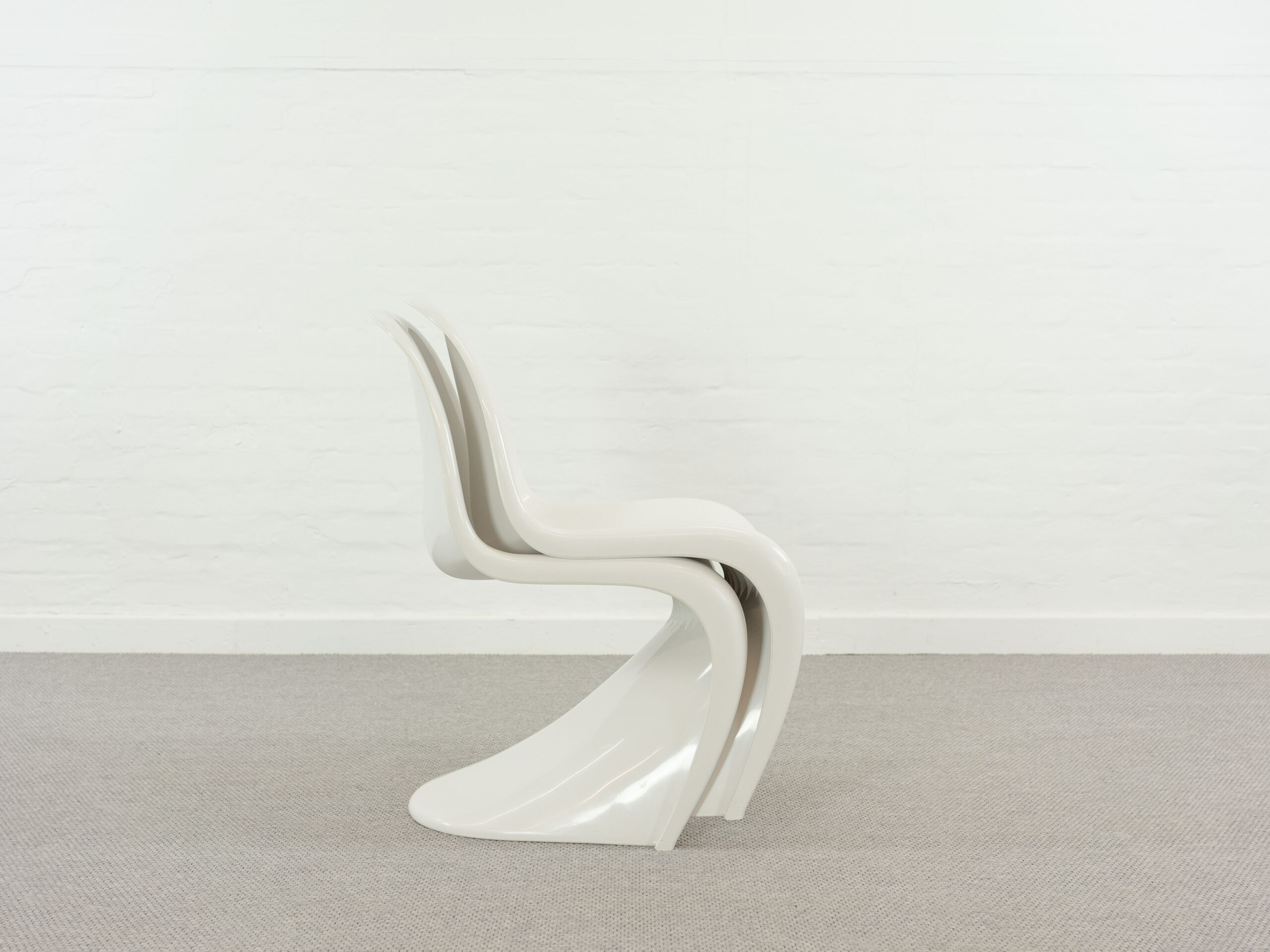 Set (2) Panton s-chairs, designed by Verner Panton for Hermann Miller / Fehlbaum. Color: white. The chairs are from the 2nd production run from 1970 onwards in thermoplastic luran-s with reinforcement ribs underneath. Marked with manufacturers logo and production date: 1976. Still nice and shiny, scratches and minor wear on seat-area.