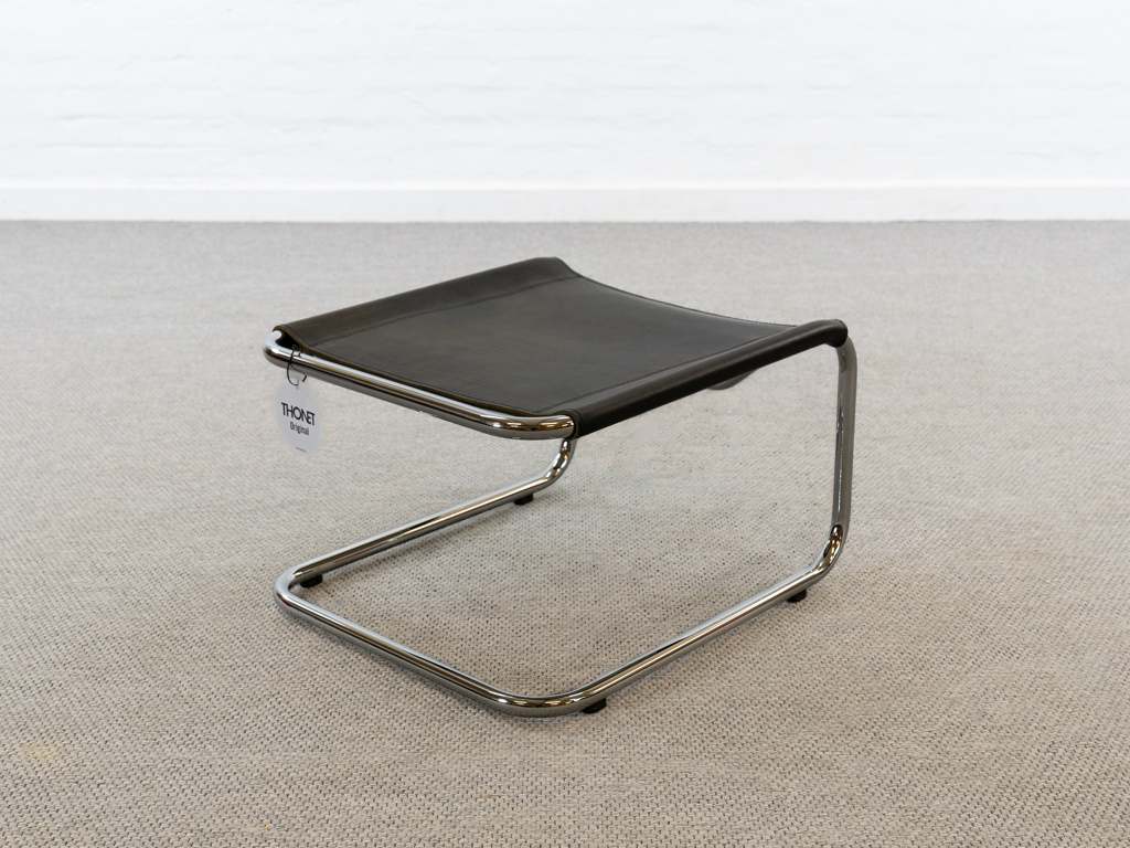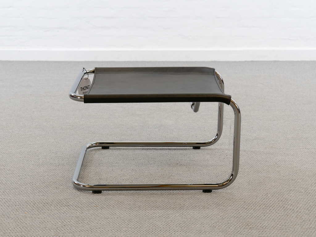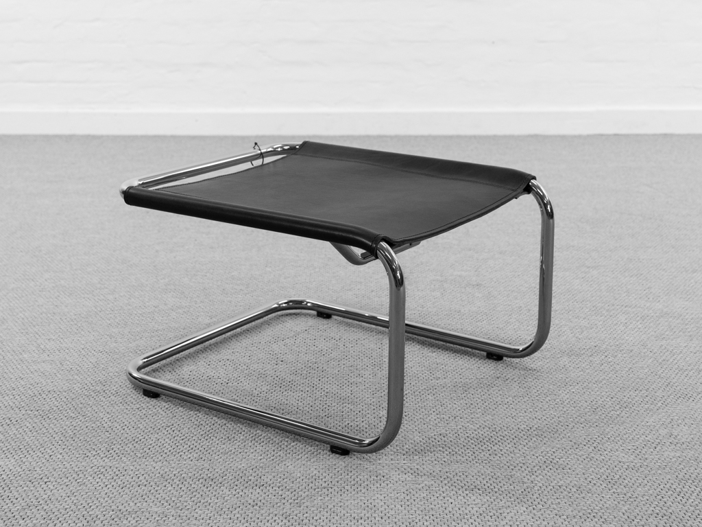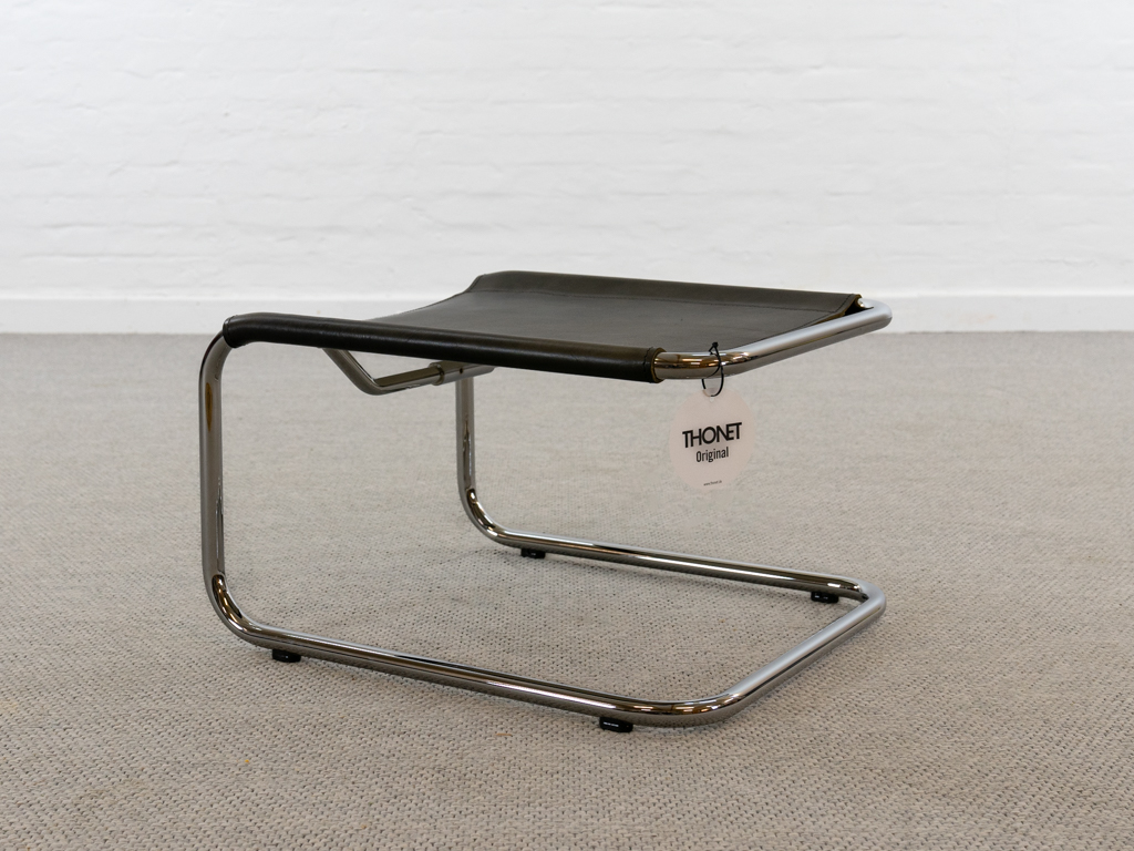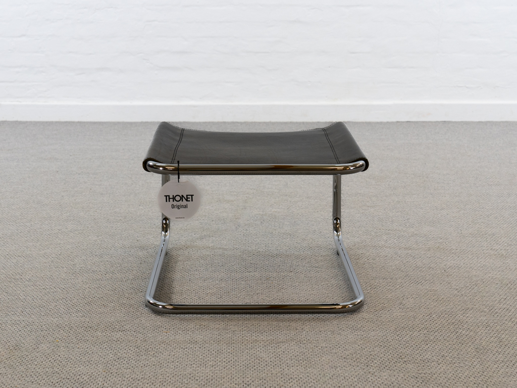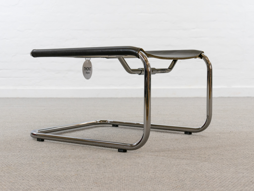 Cantilevered footstool S 35 LH, designed in 1929 by Marcel Breuer for Thonet. Matches the Thonet S 35 L armchair. Made from chrome-plated tubular steel. Labelled with Thonet sticker on the underside. The cover is made of high-quality natural black core leather. The irregular natural surface of the leather is a sign of quality. Very good condition, was previously only shown as an exhibition piece. VAT is shown on this item.