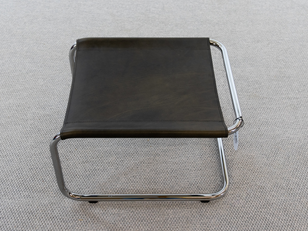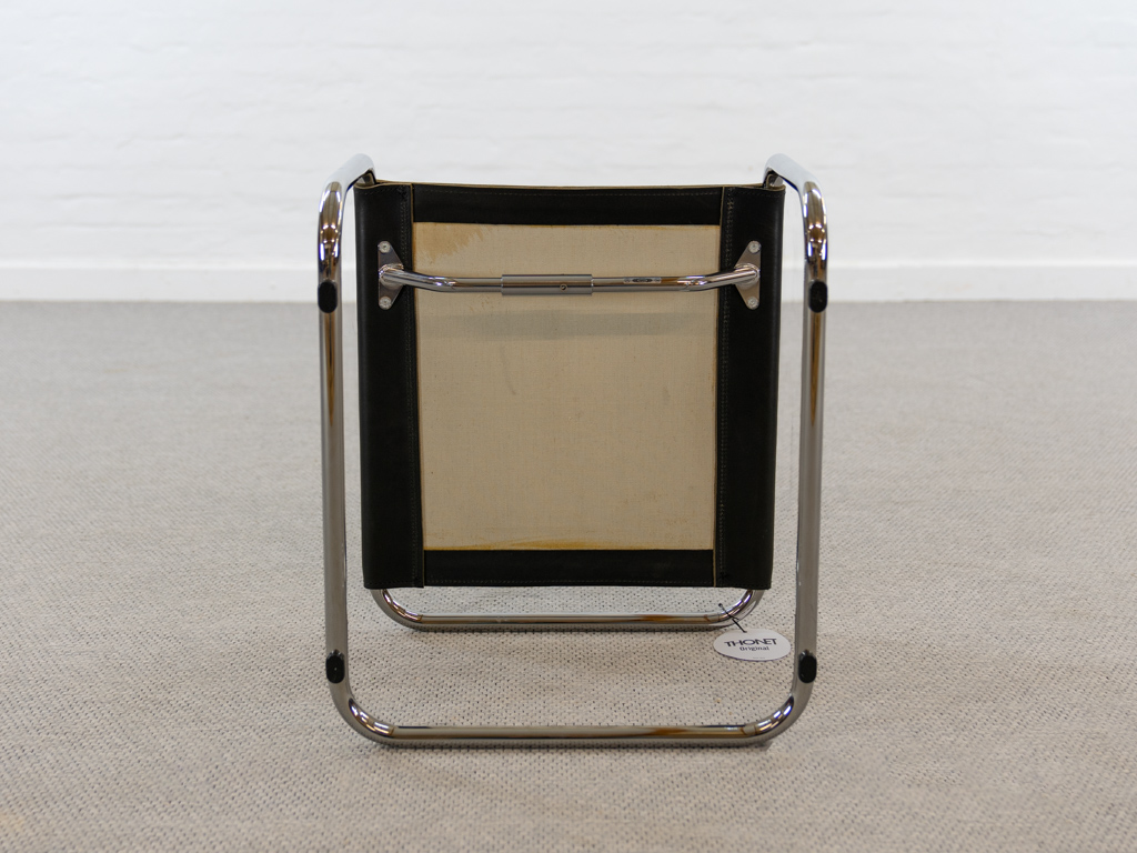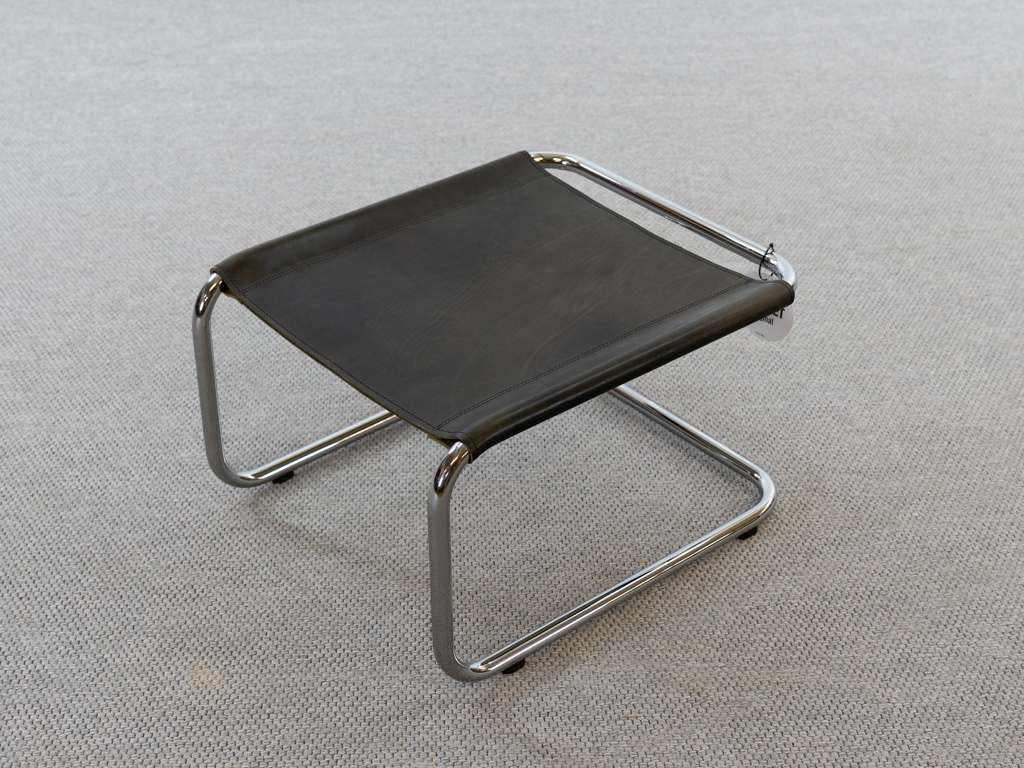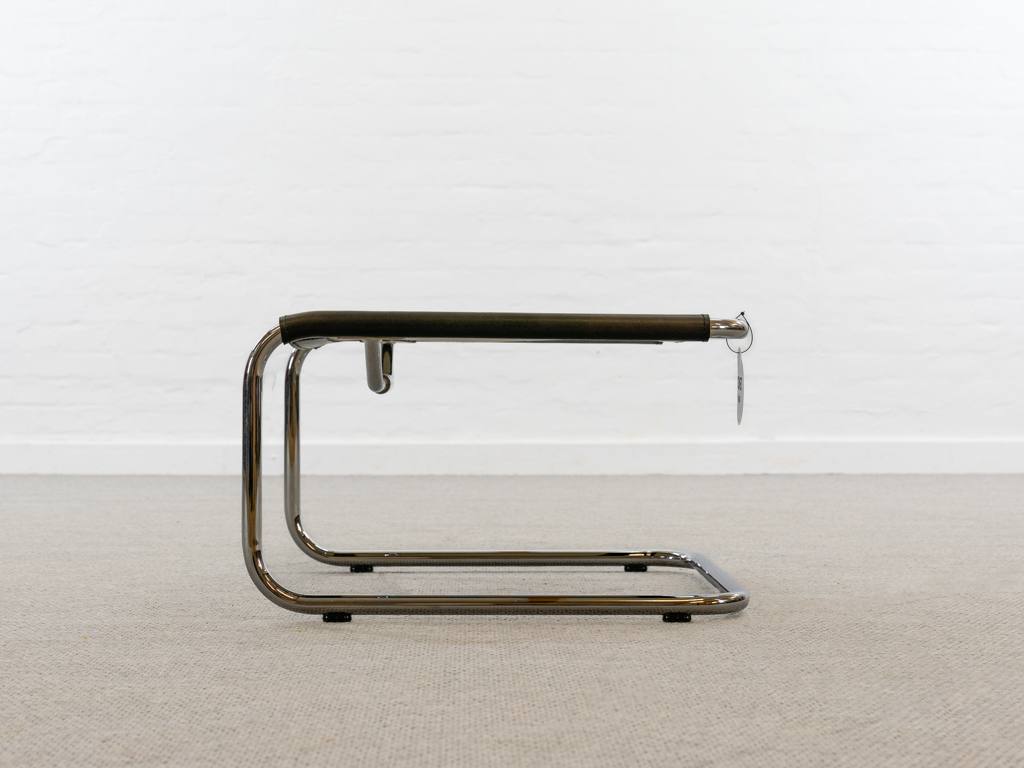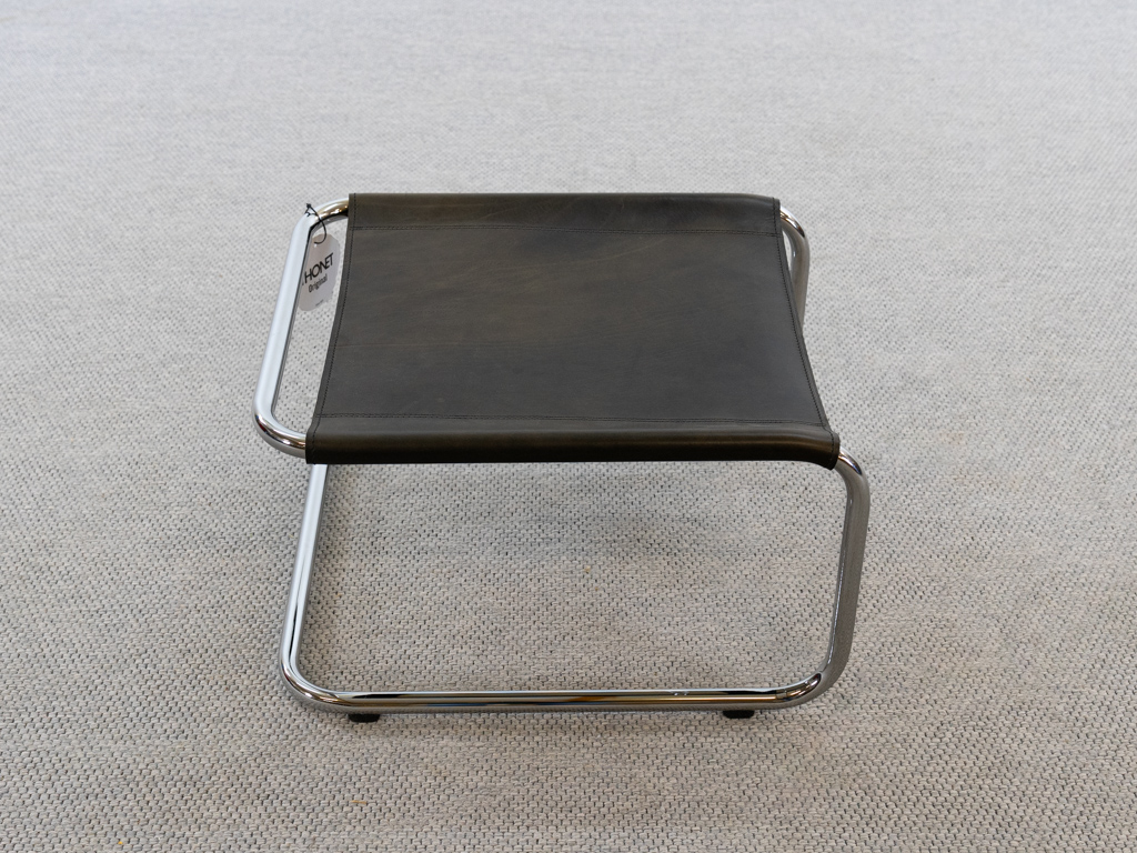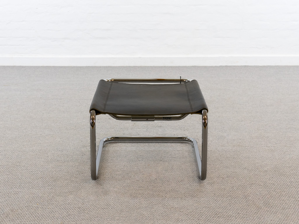 Cantilevered footstool S 35 LH, designed in 1929 by Marcel Breuer for Thonet. Matches the Thonet S 35 L armchair. Made from chrome-plated tubular steel. Labelled with Thonet sticker on the underside. The cover is made of high-quality natural black core leather. The irregular natural surface of the leather is a sign of quality. Very good condition, was previously only shown as an exhibition piece. VAT is shown on this item.