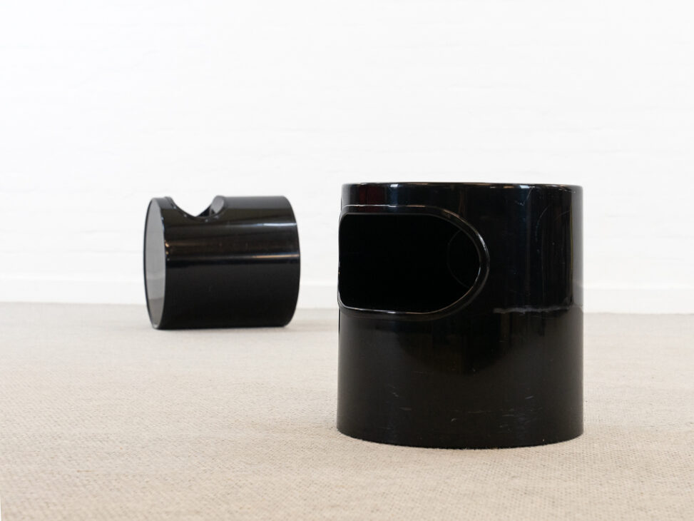 Set of two side tables, model “Boy,” designed by Emma Gismondi-Schweinberger. Manufactured by Metra, Italy, in the 1970s. Also wonderful to use as a bedside table. Made of black plastic. Designer and manufacturer marked on the underside. Diameter: 40 cm, height: 40 cm. Signs of age and wear present. Scratches and abrasions on the lower third.