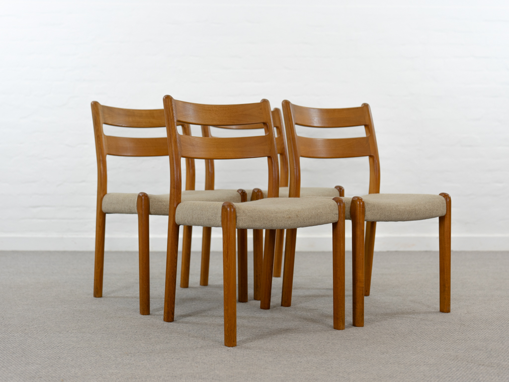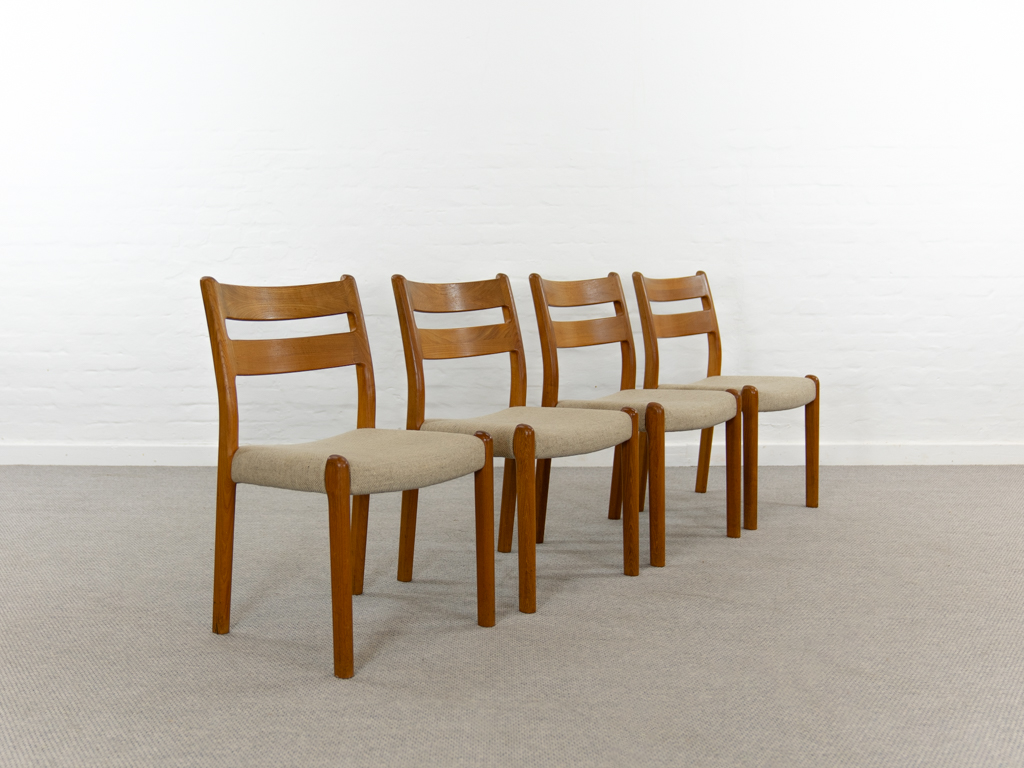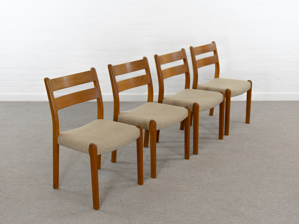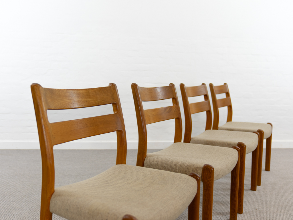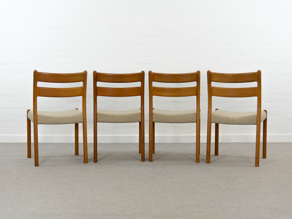Mid Century Set of 4 Diningchairs in massive Teakwood by EMC-Mobler Denmark. Upholstered in its original woolfabric. Reasonable condition, small signs of use and age. All chairs are marked with manufacturers sticker underneath. Non-smoking object.