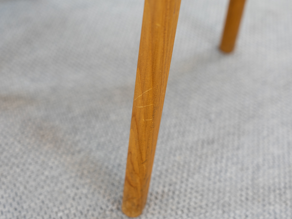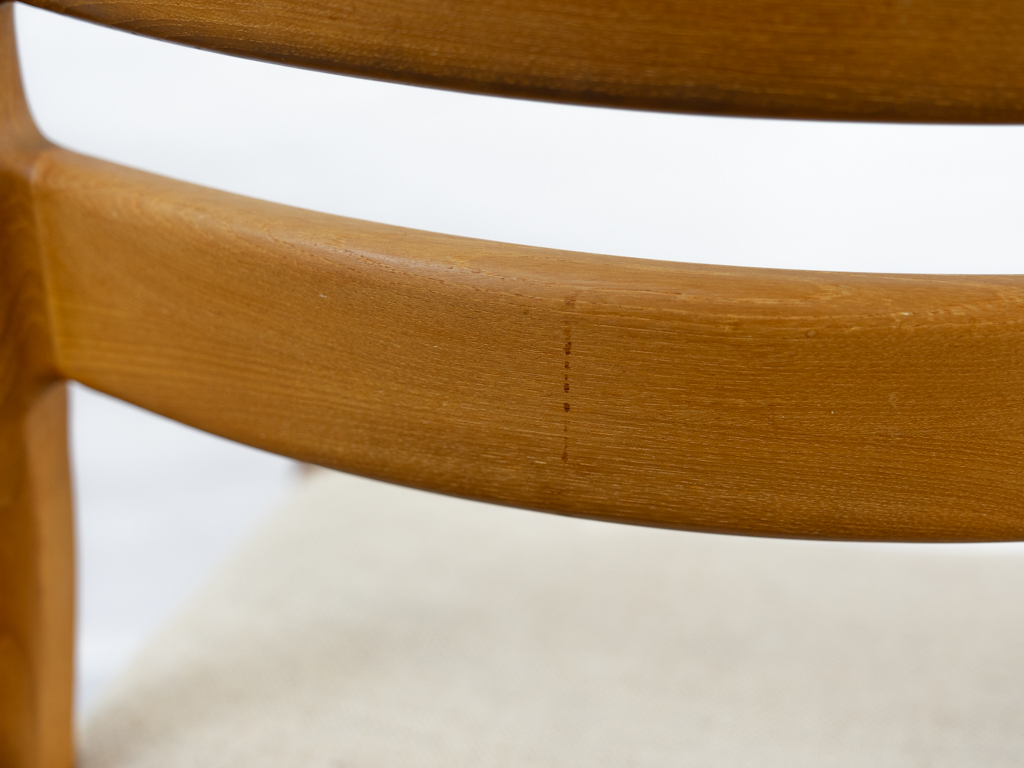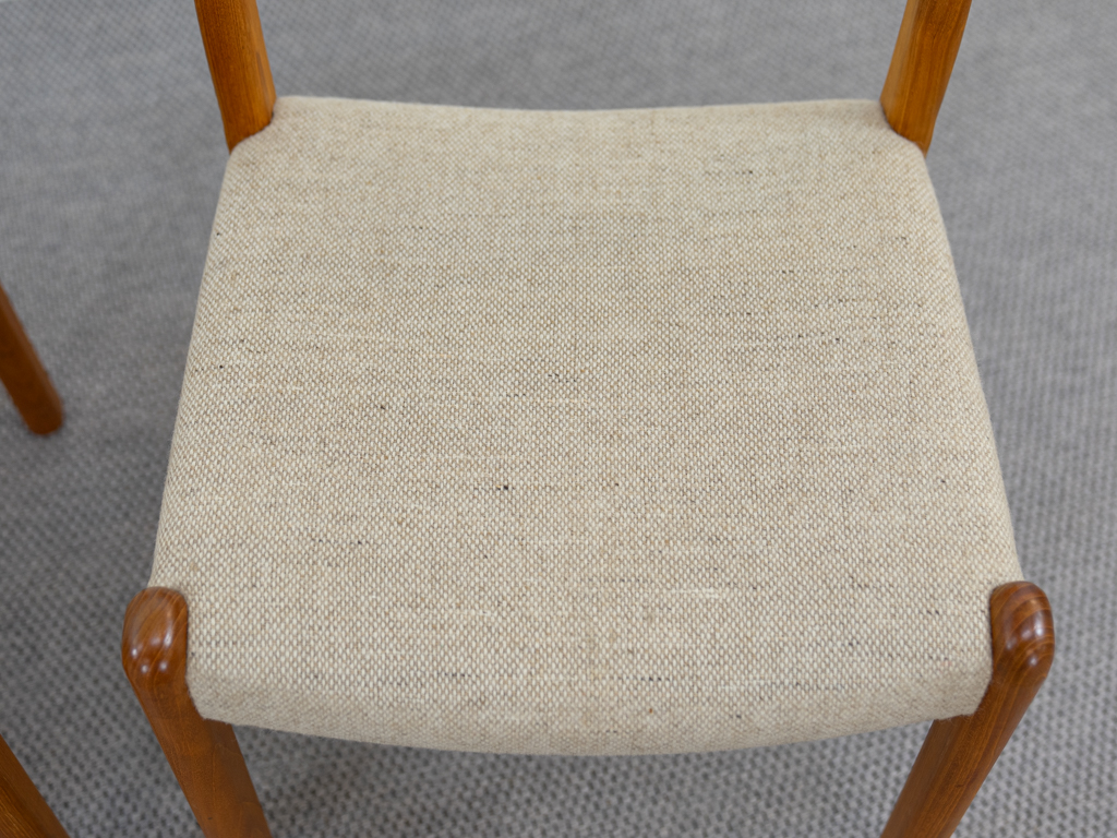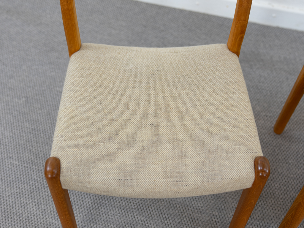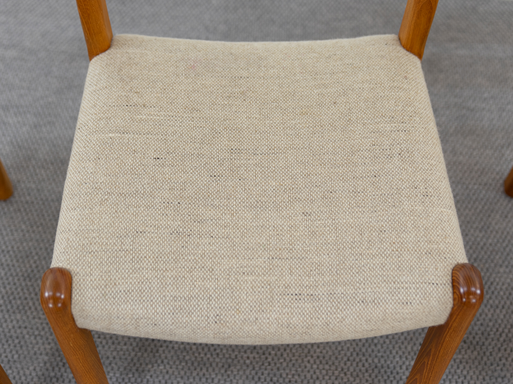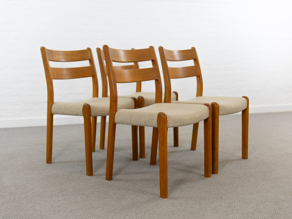 Mid Century Set of 4 Diningchairs in massive Teakwood by EMC-Mobler Denmark. Upholstered in its original woolfabric. Reasonable condition, small signs of use and age. All chairs are marked with manufacturers sticker underneath. Non-smoking object.