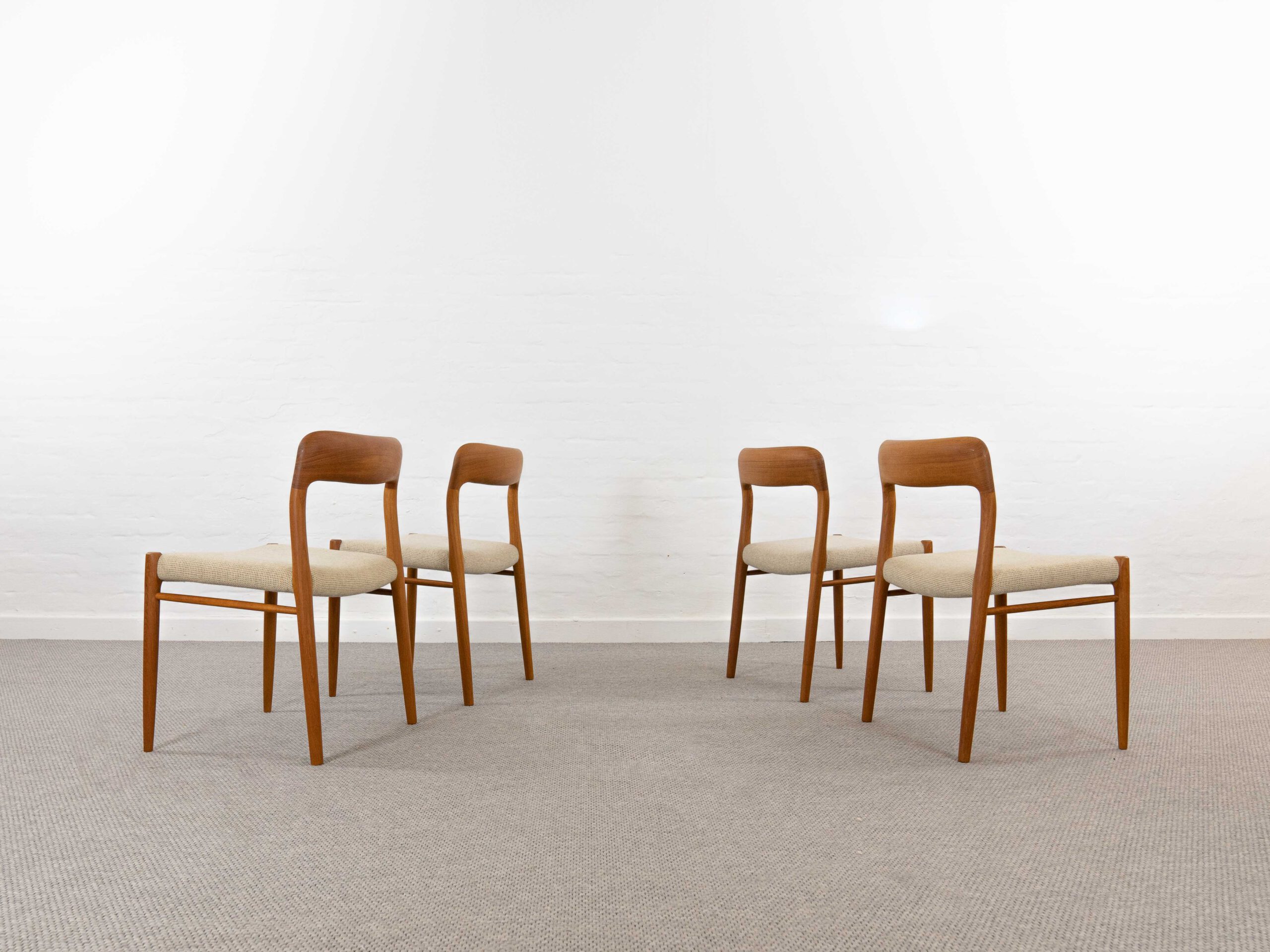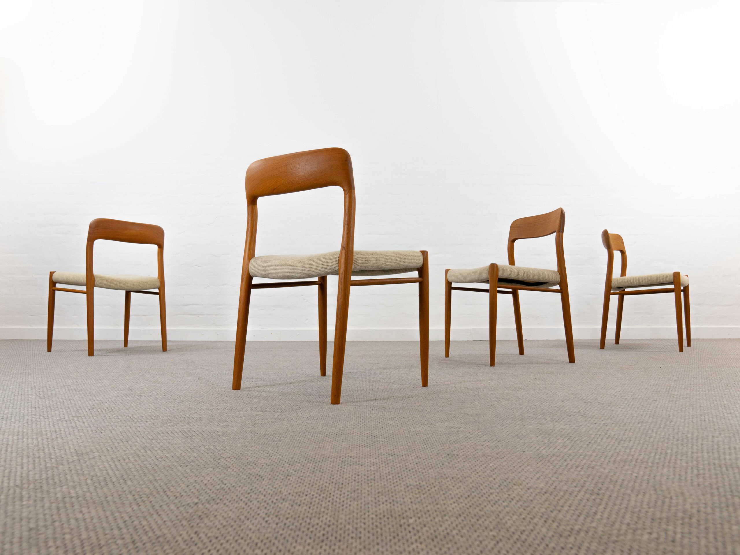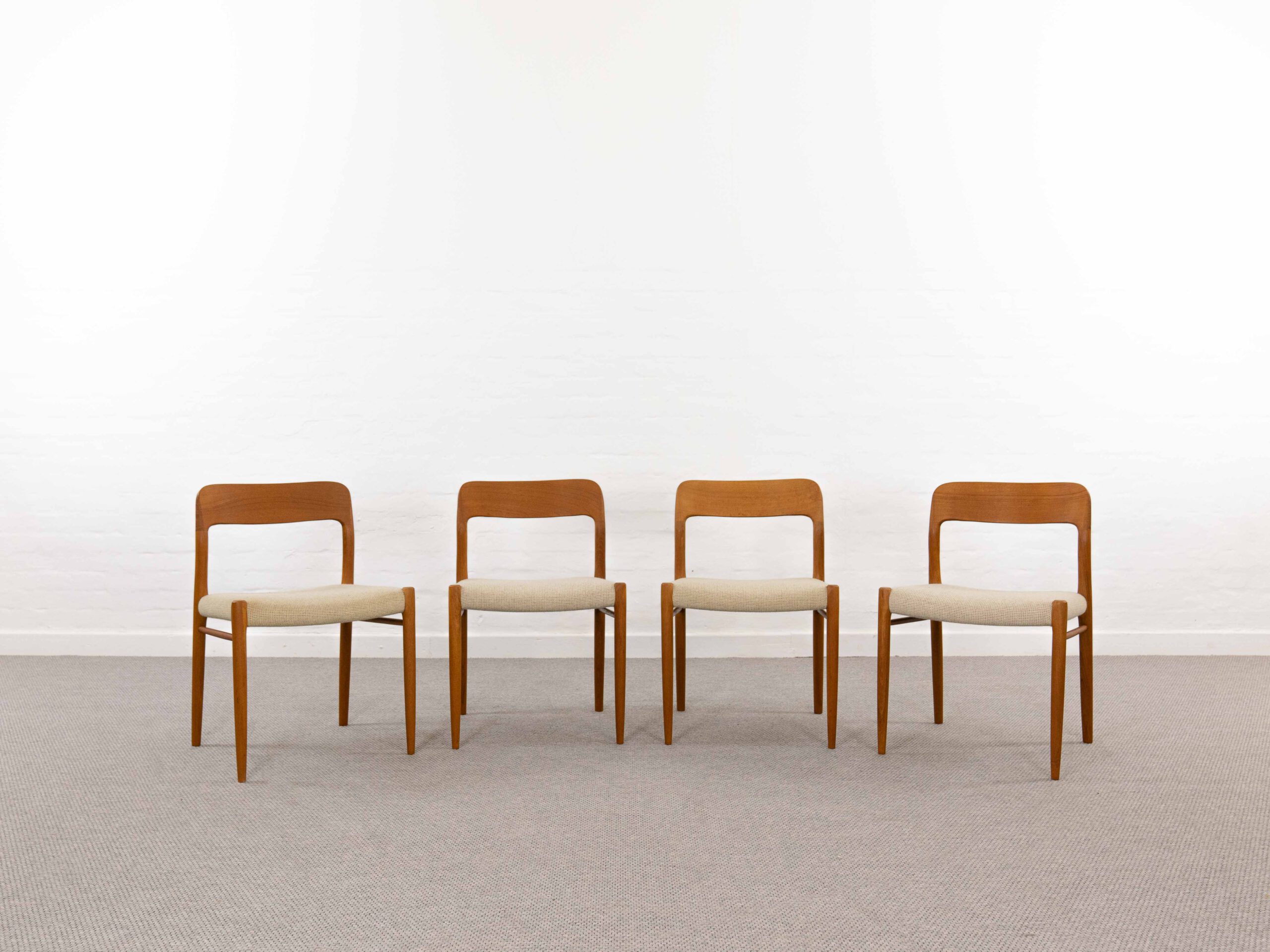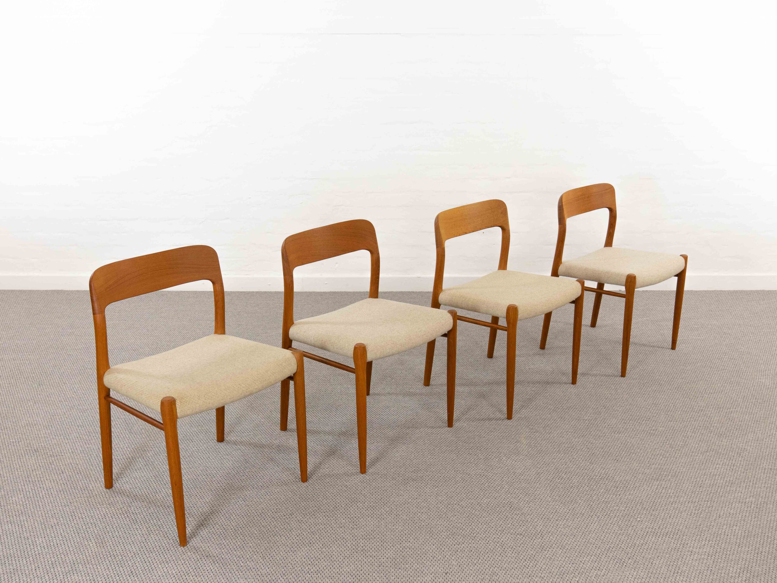 Set 4 mid century scandinavian teakchairs, designed by Niels Otto Möller 1954, manufactured by J.L. Möller – Höjbjerg, Denmark. Model No. 75. Teakwoodframe upholstered with original beige fabrics. All chairs are marked underneath with paperlabel. Good vintage condition. Non-Smoking. Wear consistent with age and use. One chair got a small spot on seat area. One backrest shows some minor stains.