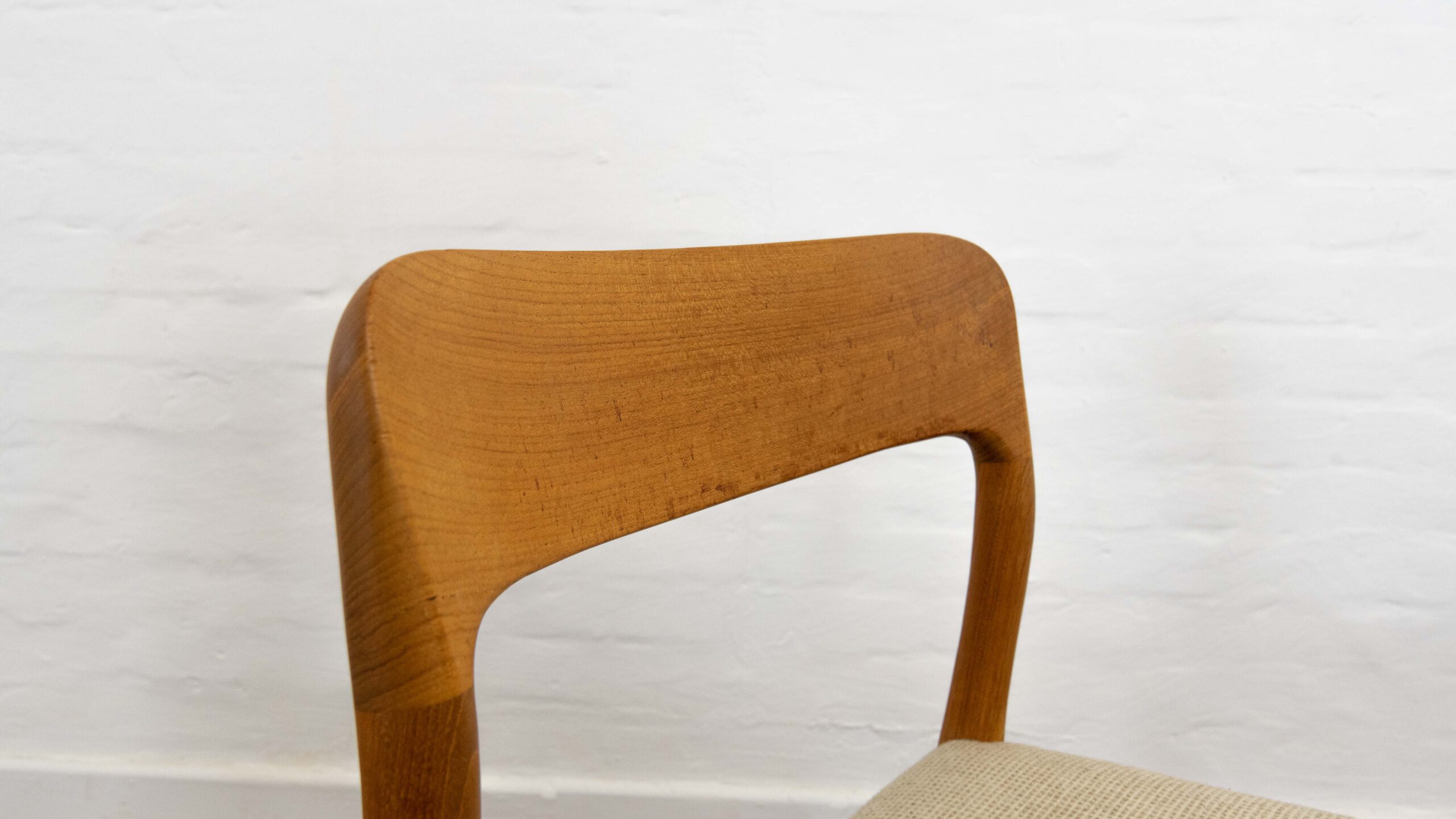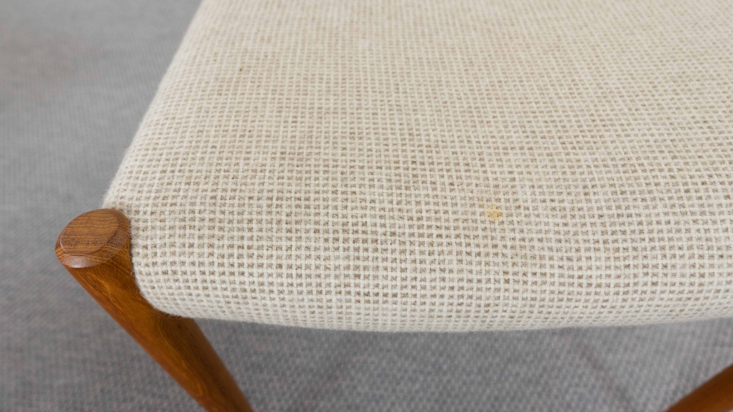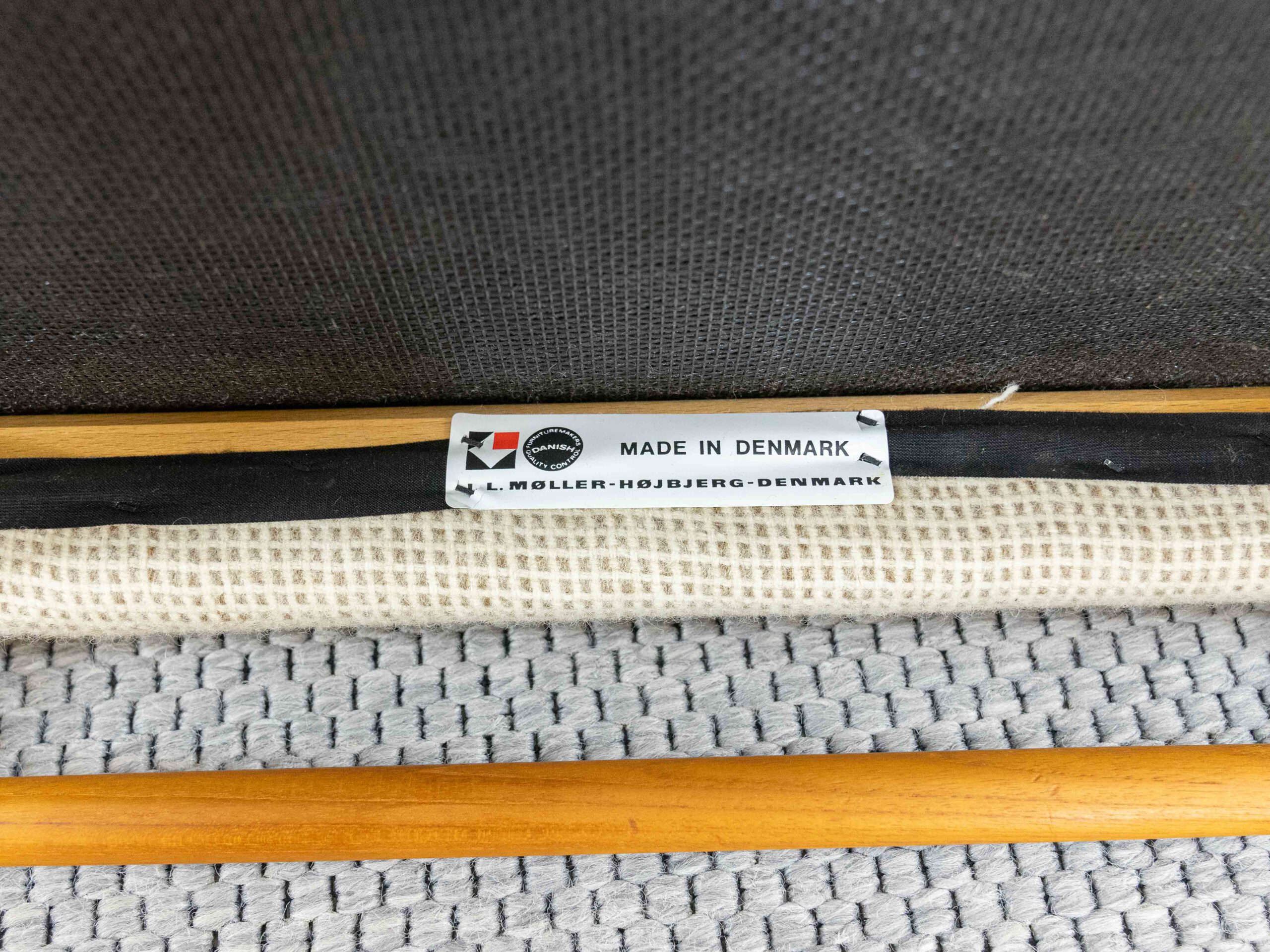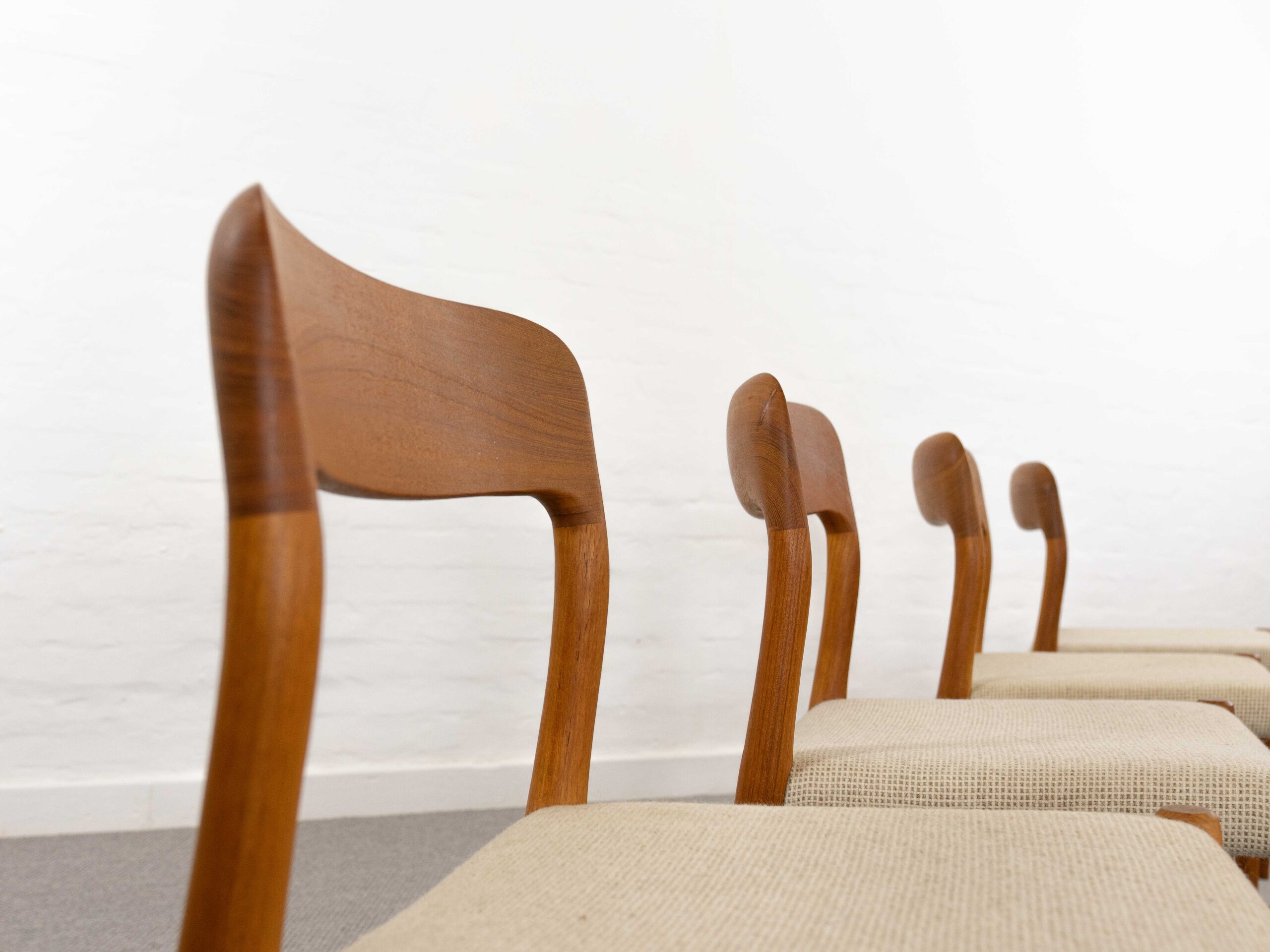 Set 4 mid century scandinavian teakchairs, designed by Niels Otto Möller 1954, manufactured by J.L. Möller – Höjbjerg, Denmark. Model No. 75. Teakwoodframe upholstered with original beige fabrics. All chairs are marked underneath with paperlabel. Good vintage condition. Non-Smoking. Wear consistent with age and use. One chair got a small spot on seat area. One backrest shows some minor stains.