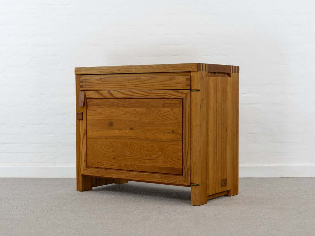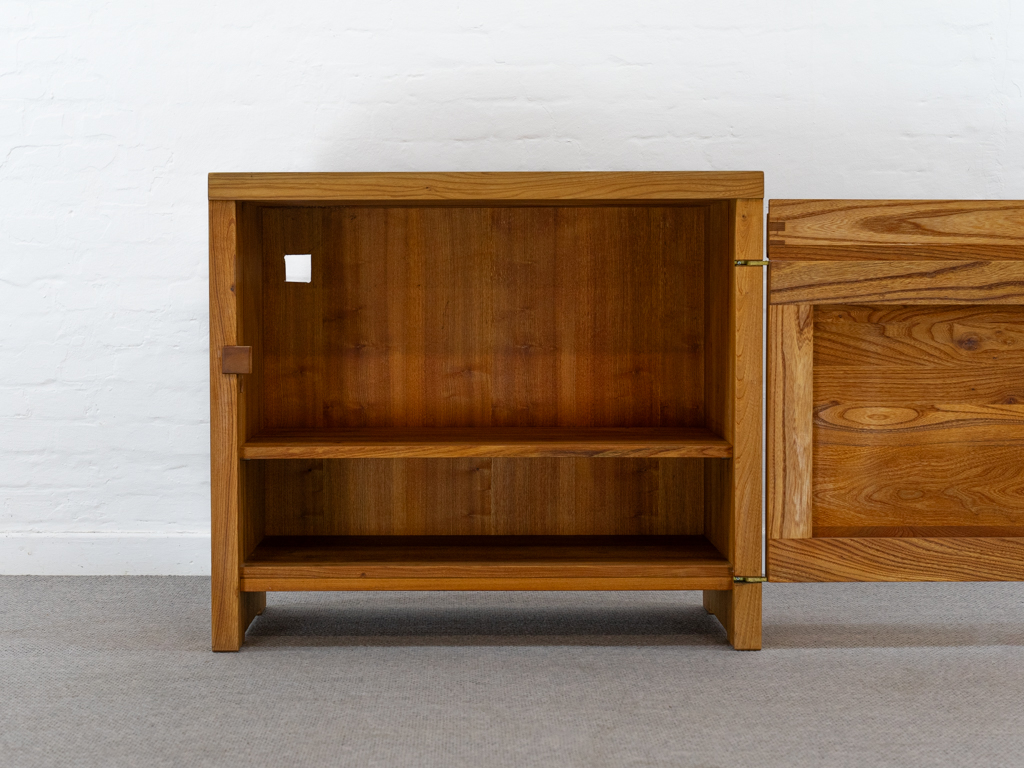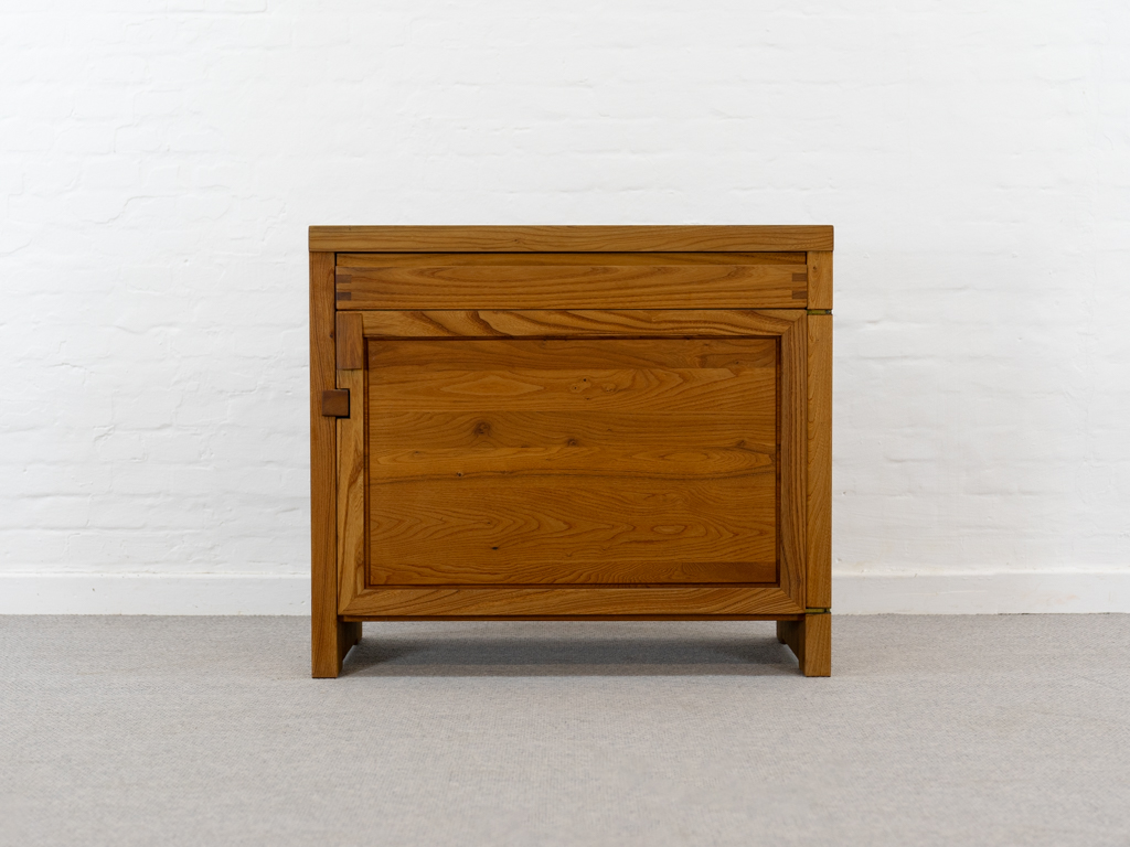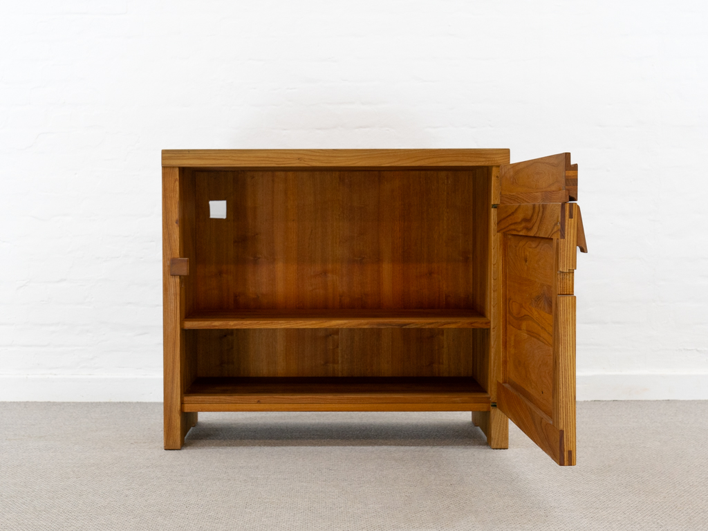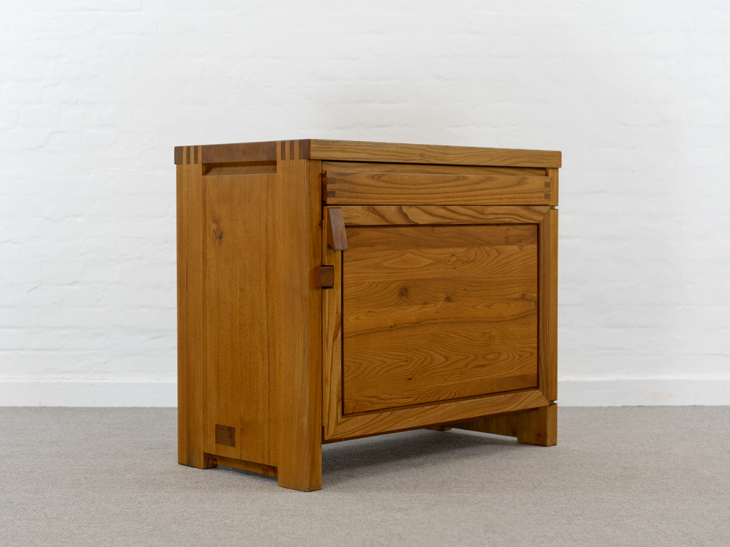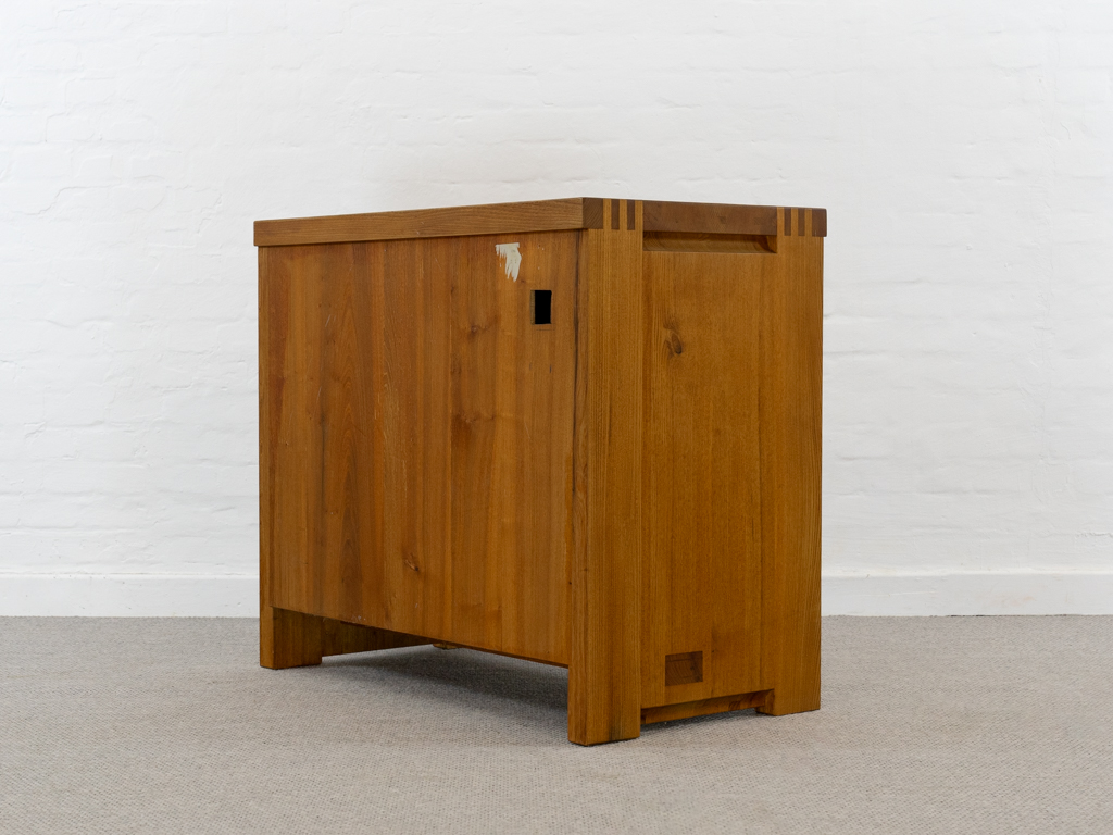 Vintage sideboard, model R09, designed by french designer Pierre Chapo in the 60s. Executed in solid elm / elm in the 60s/70s. The handle strip is part of the front door and was originally manufactured in this way. The sideboard has no drawer. One shelf available. Good vintage condition. Minor signs of use typical for the age. The previous owners used the furniture as an exclusive hi-fi cabinet and subsequently incorporated a cable duct into the back. Dimensions: H: 84cm, W: 96cm, D: 53cm. Non-smoking furniture.