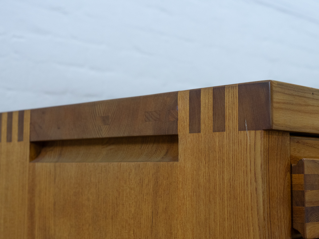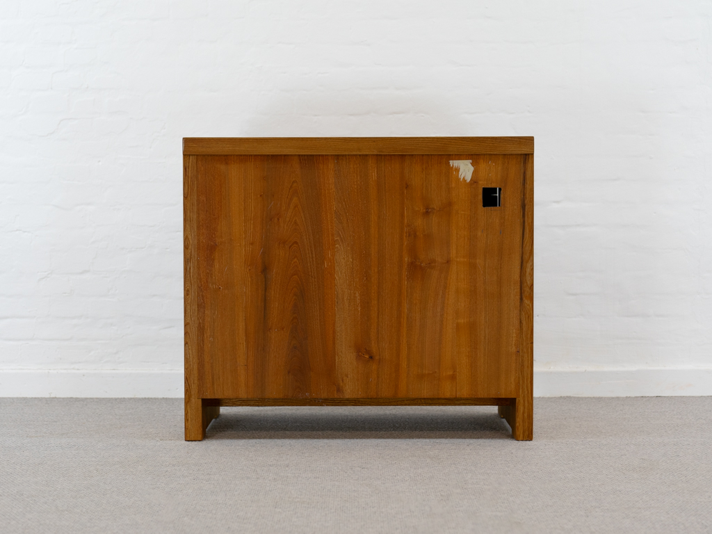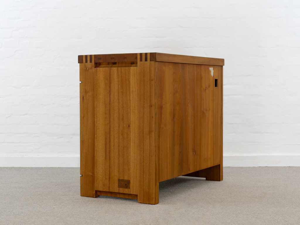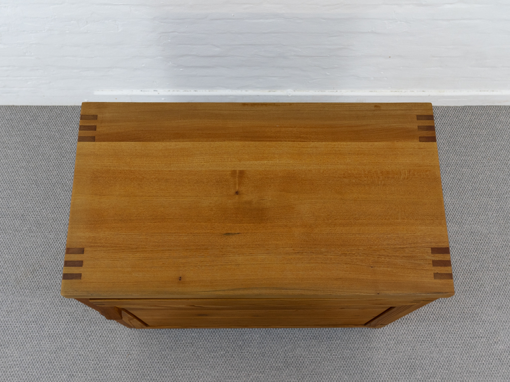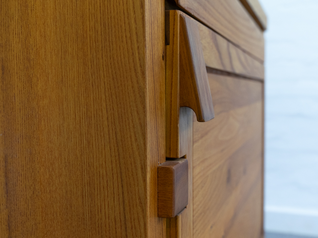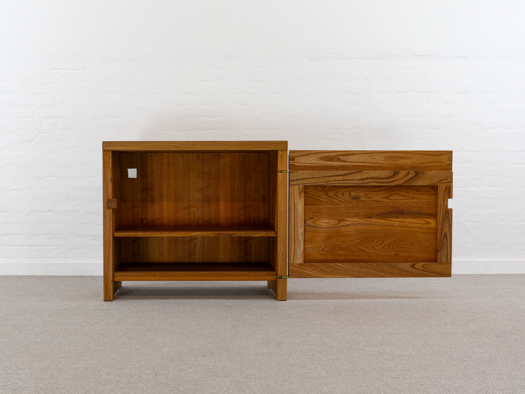 Vintage sideboard, model R09, designed by french designer Pierre Chapo in the 60s. Executed in solid elm / elm in the 60s/70s. The handle strip is part of the front door and was originally manufactured in this way. The sideboard has no drawer. One shelf available. Good vintage condition. Minor signs of use typical for the age. The previous owners used the furniture as an exclusive hi-fi cabinet and subsequently incorporated a cable duct into the back. Dimensions: H: 84cm, W: 96cm, D: 53cm. Non-smoking furniture.