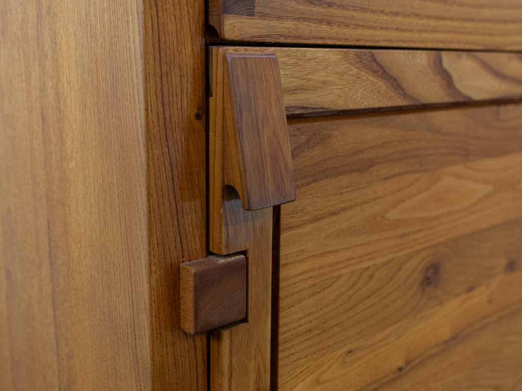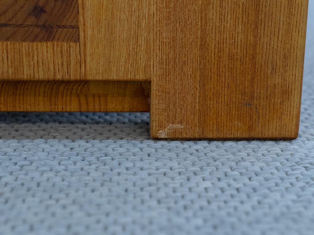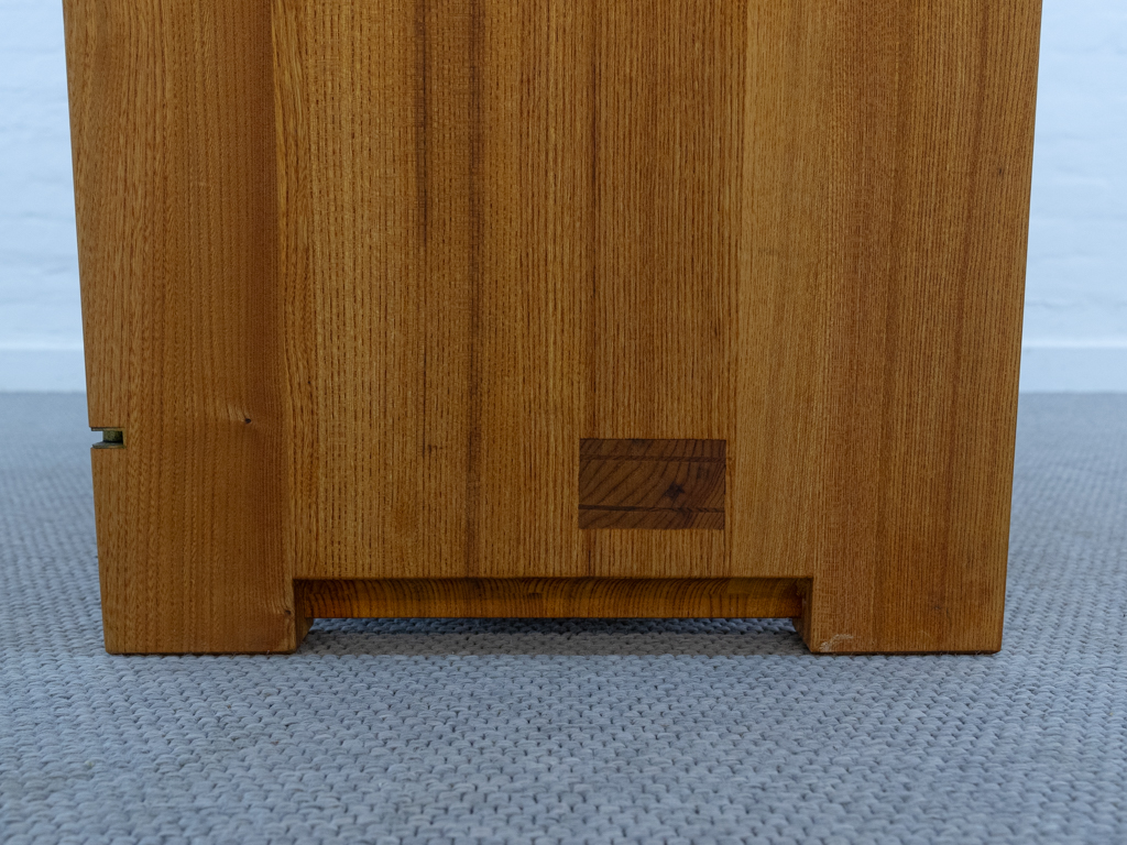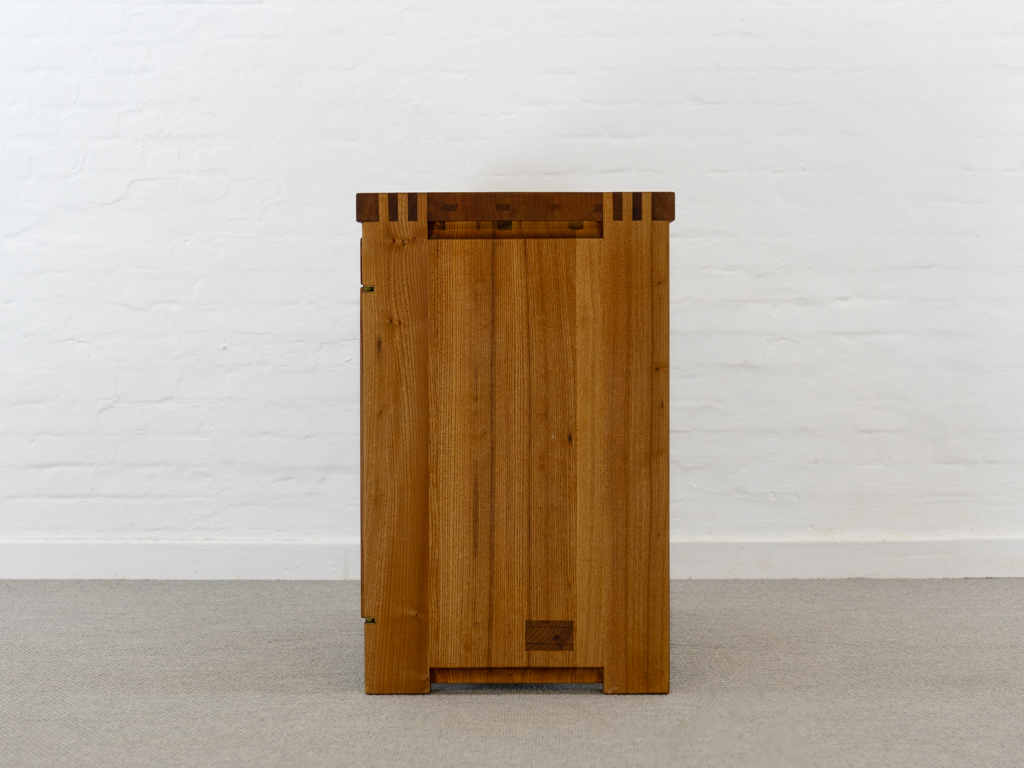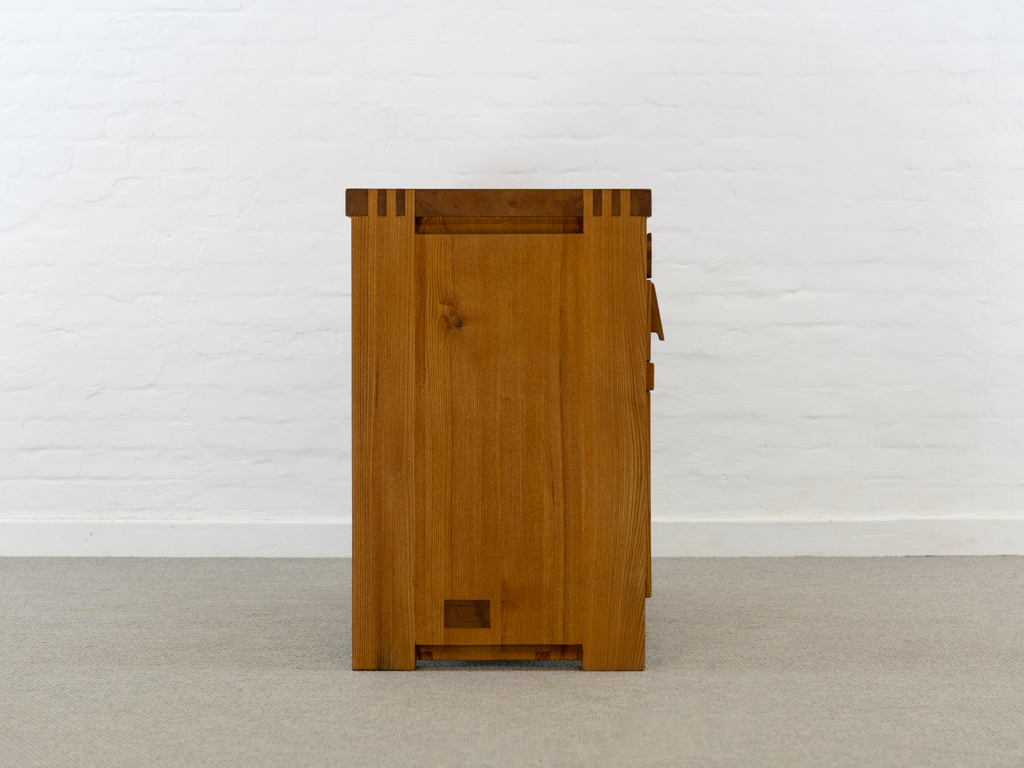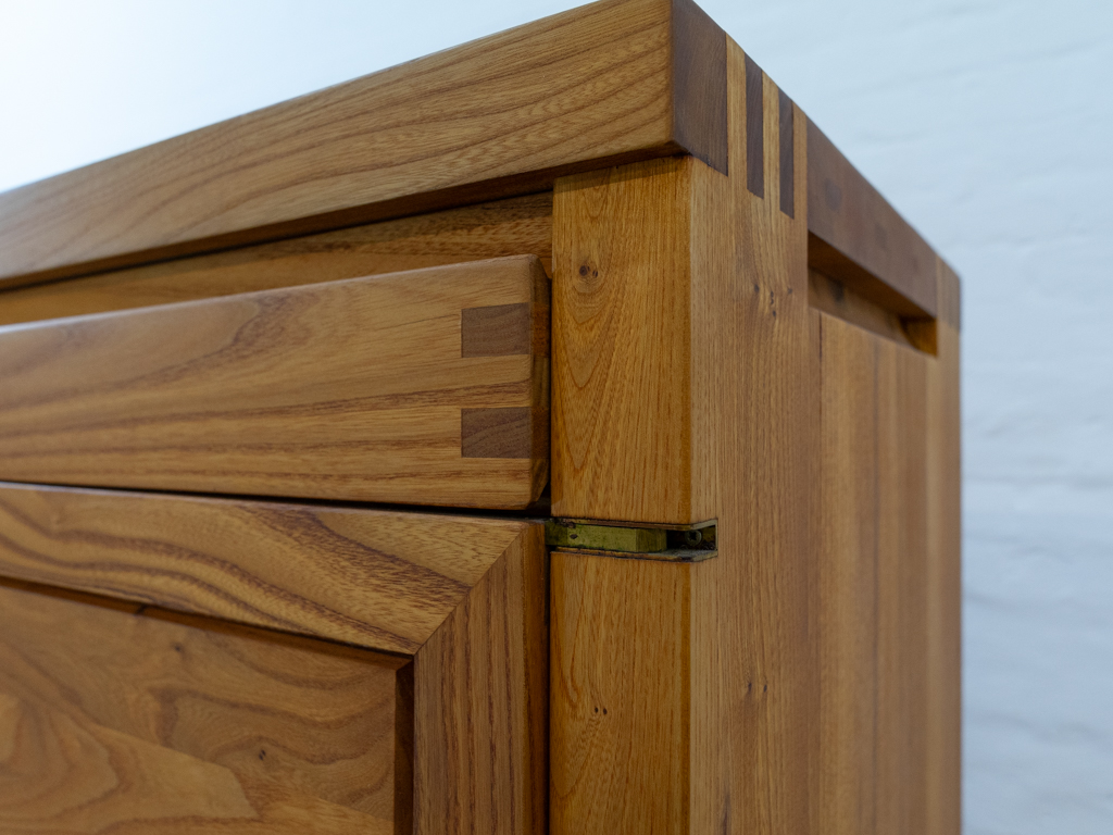 Vintage sideboard, model R09, designed by french designer Pierre Chapo in the 60s. Executed in solid elm / elm in the 60s/70s. The handle strip is part of the front door and was originally manufactured in this way. The sideboard has no drawer. One shelf available. Good vintage condition. Minor signs of use typical for the age. The previous owners used the furniture as an exclusive hi-fi cabinet and subsequently incorporated a cable duct into the back. Dimensions: H: 84cm, W: 96cm, D: 53cm. Non-smoking furniture.