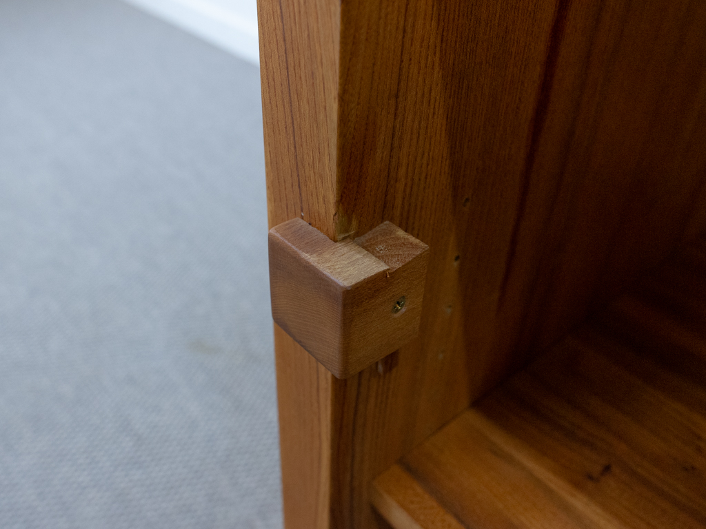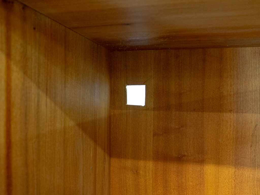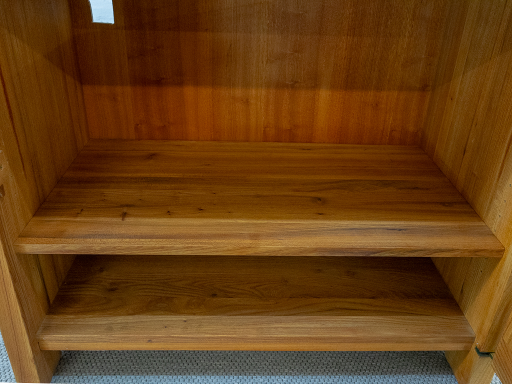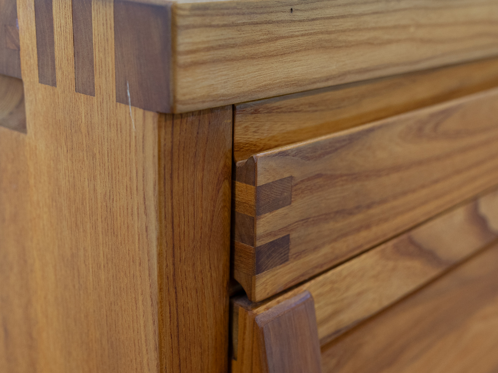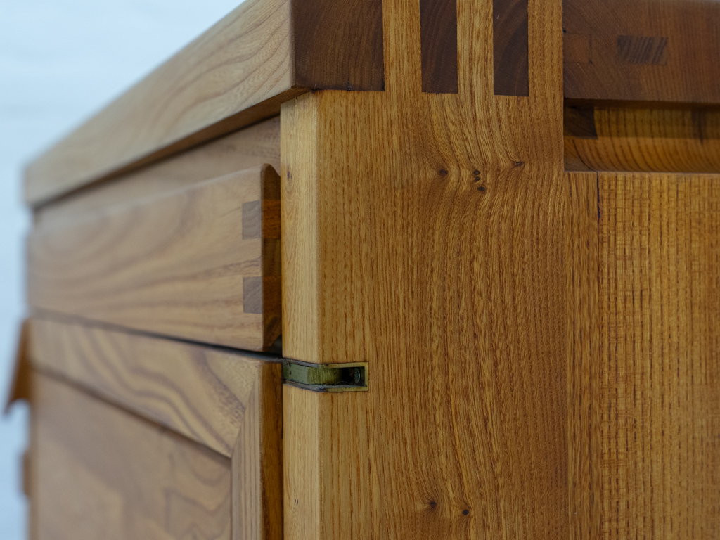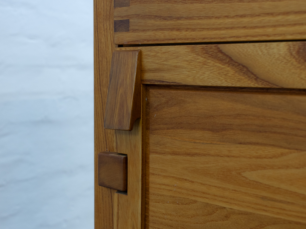 Vintage sideboard, model R09, designed by french designer Pierre Chapo in the 60s. Executed in solid elm / elm in the 60s/70s. The handle strip is part of the front door and was originally manufactured in this way. The sideboard has no drawer. One shelf available. Good vintage condition. Minor signs of use typical for the age. The previous owners used the furniture as an exclusive hi-fi cabinet and subsequently incorporated a cable duct into the back. Dimensions: H: 84cm, W: 96cm, D: 53cm. Non-smoking furniture.