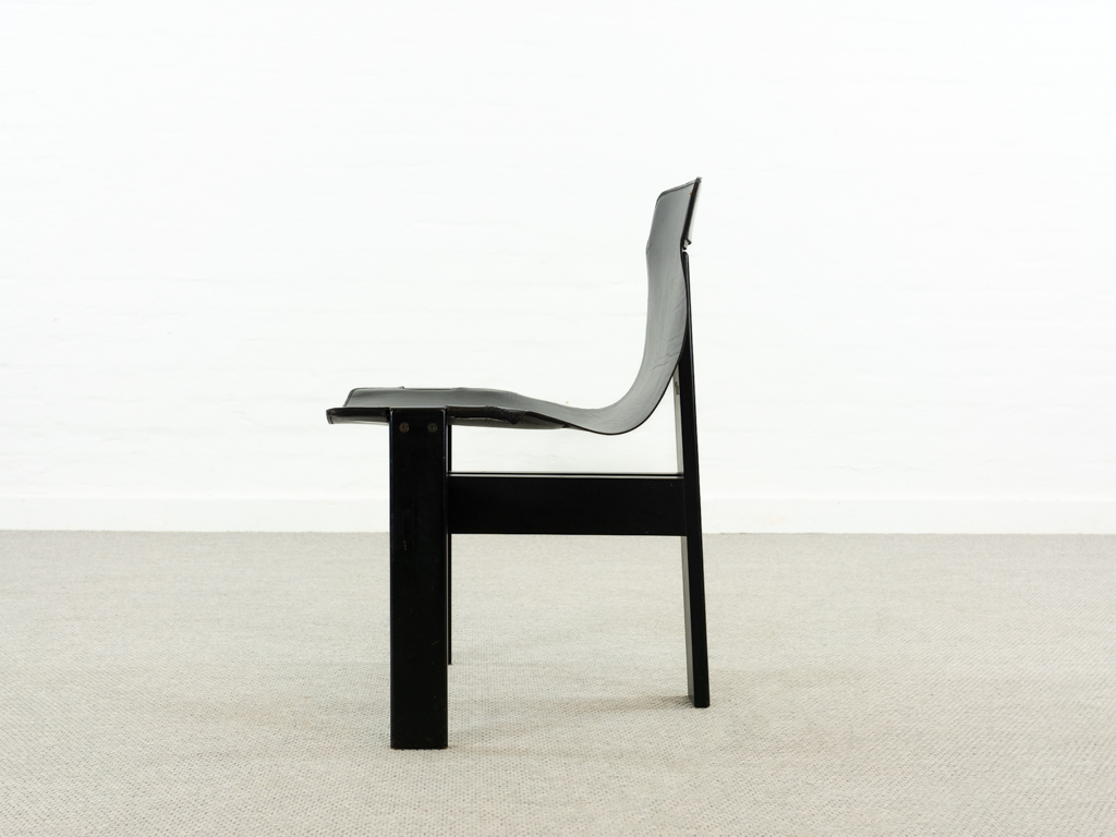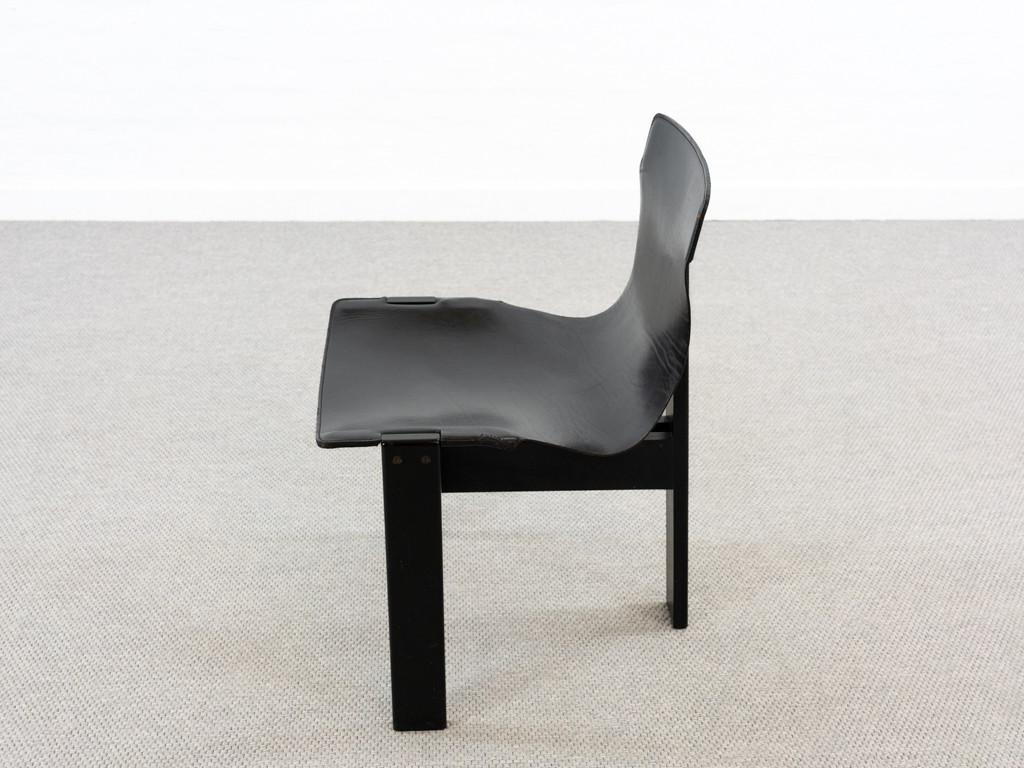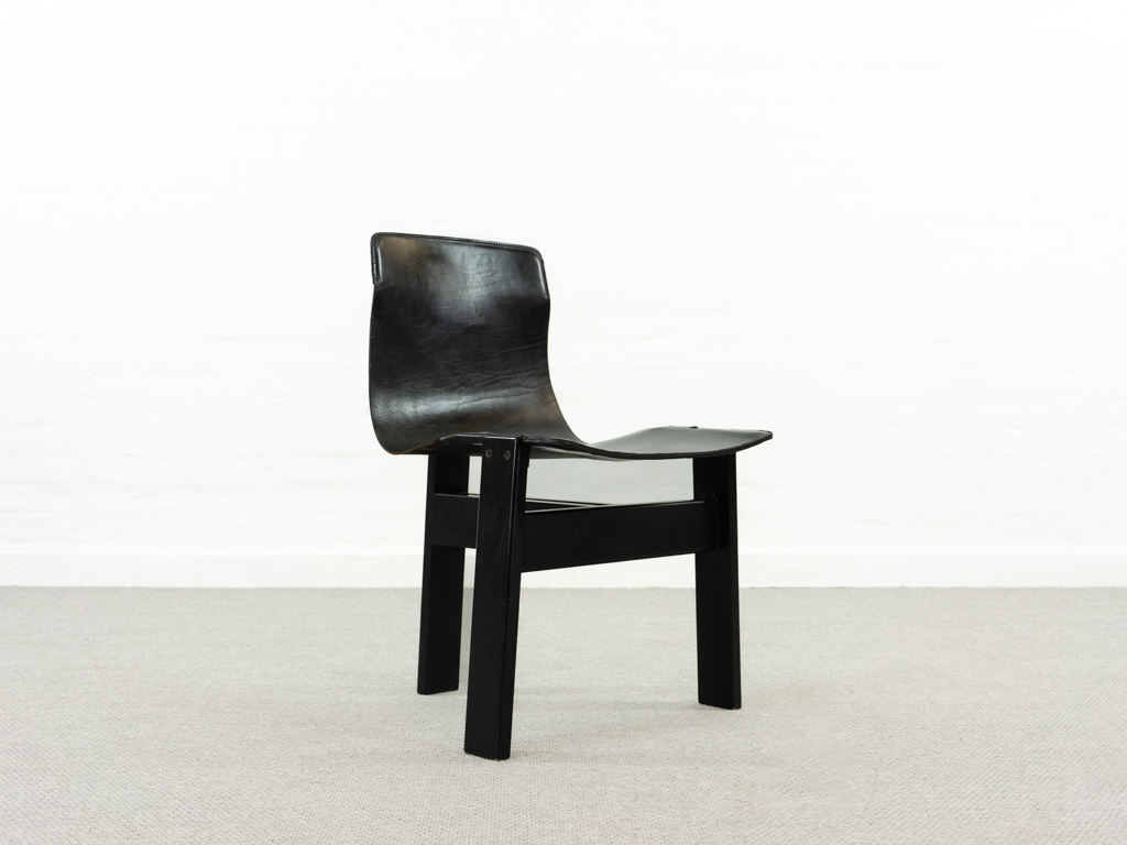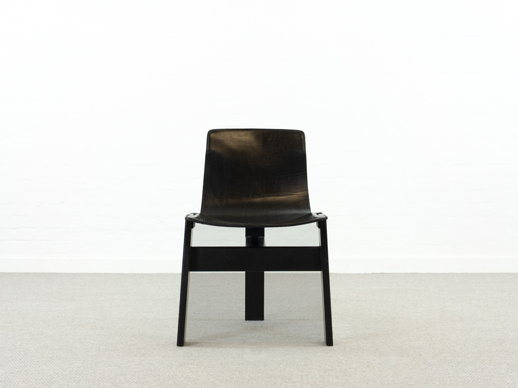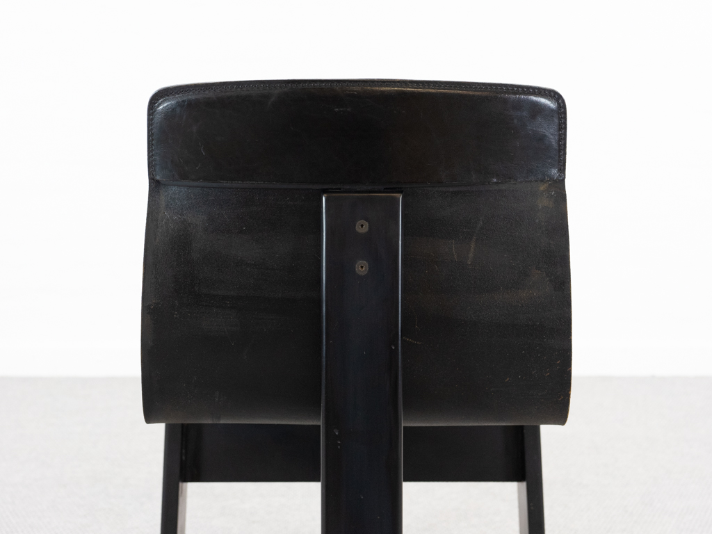 Elegant and rare Tripod Chair in blackened wood and leather by Angelo Mangiarotti for Skipper, Italy 1978. The black saddle leather floats down from the backrest down to the two front legs. Used vintage condition. The leather shows use and age and has a repaired corner. The wooden base was reglued at the two joints which is visible underneath. Of course the chair is sturdy, sound and ready to use.