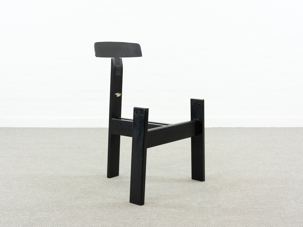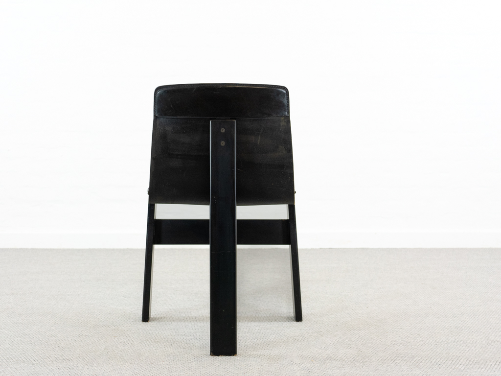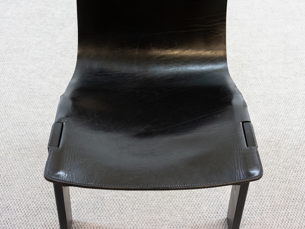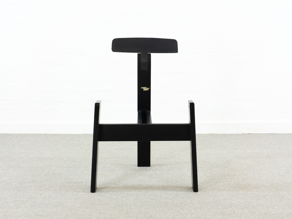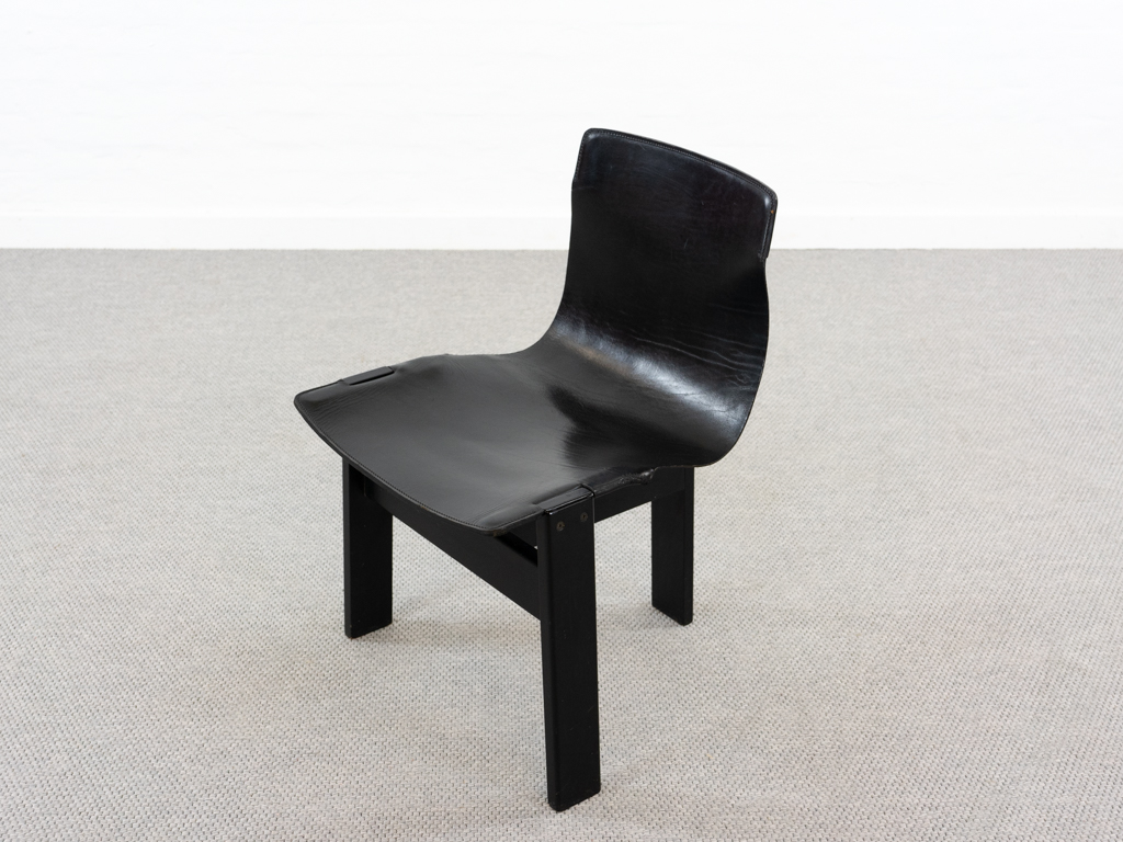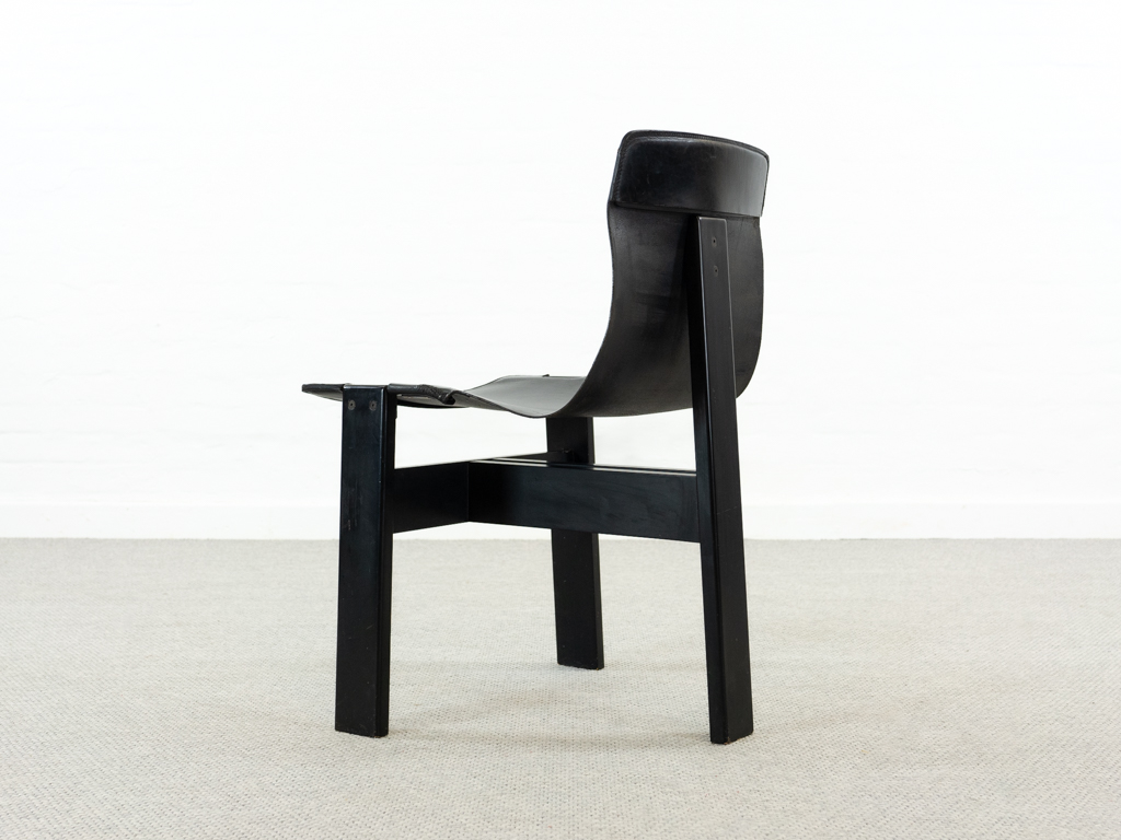 Elegant and rare Tripod Chair in blackened wood and leather by Angelo Mangiarotti for Skipper, Italy 1978. The black saddle leather floats down from the backrest down to the two front legs. Used vintage condition. The leather shows use and age and has a repaired corner. The wooden base was reglued at the two joints which is visible underneath. Of course the chair is sturdy, sound and ready to use.