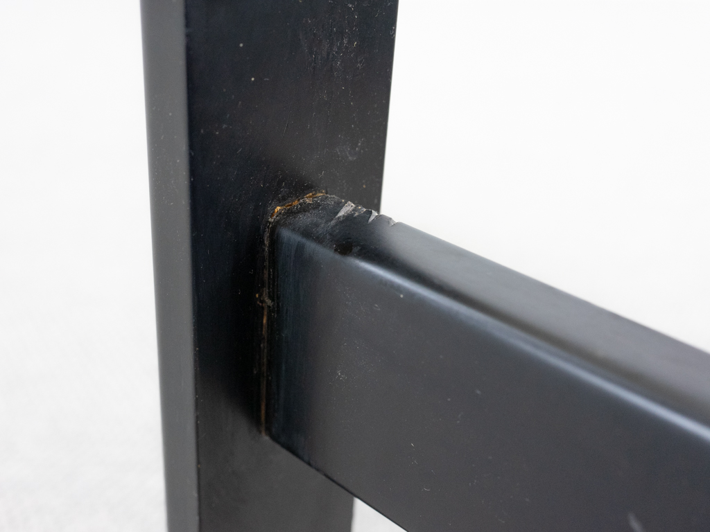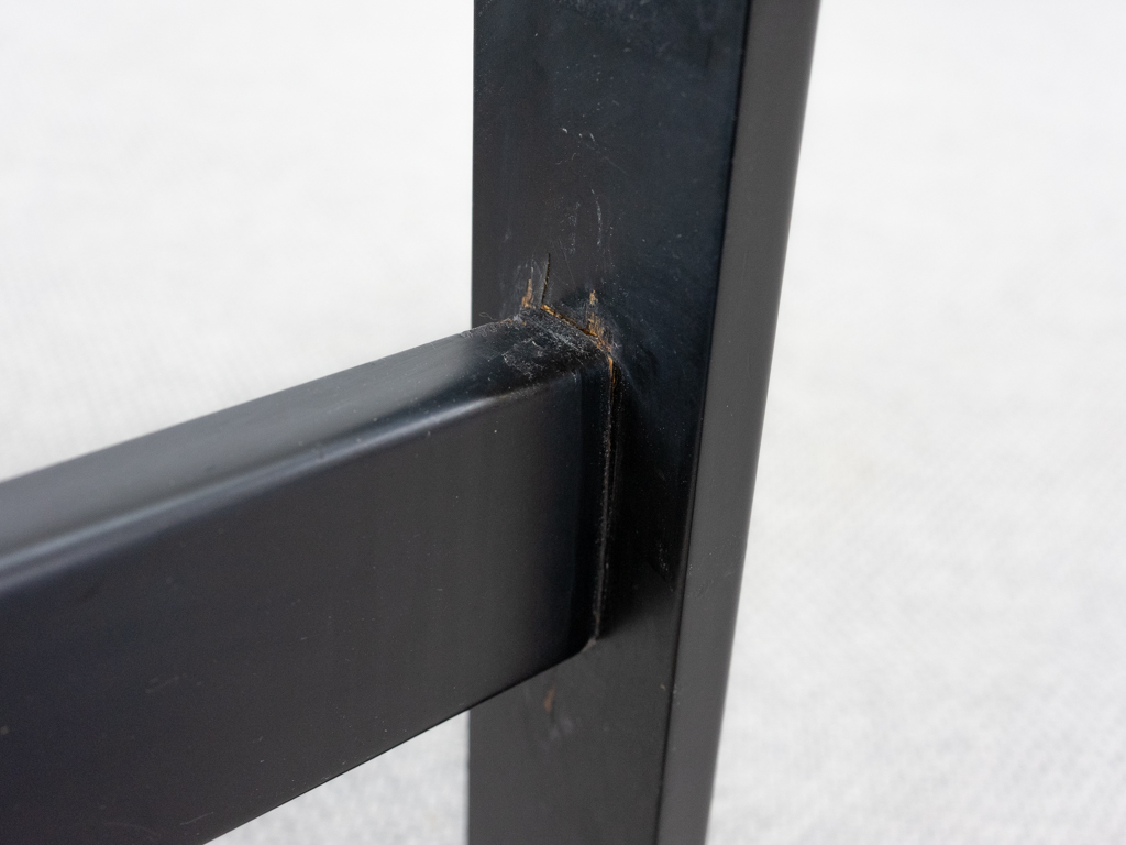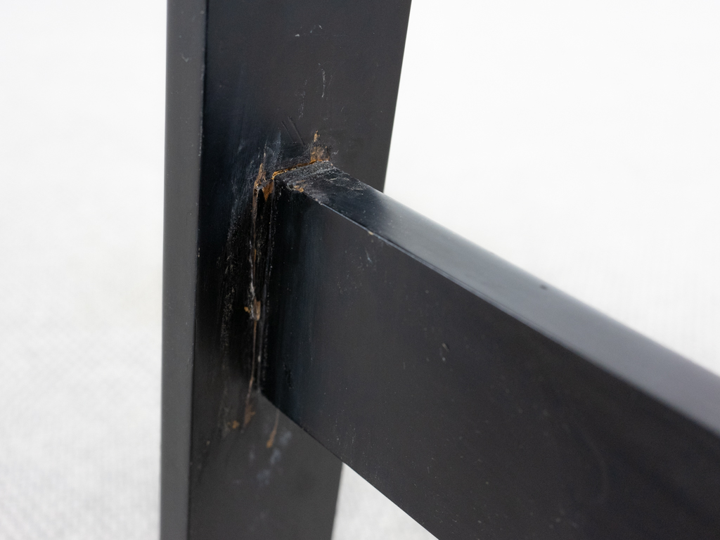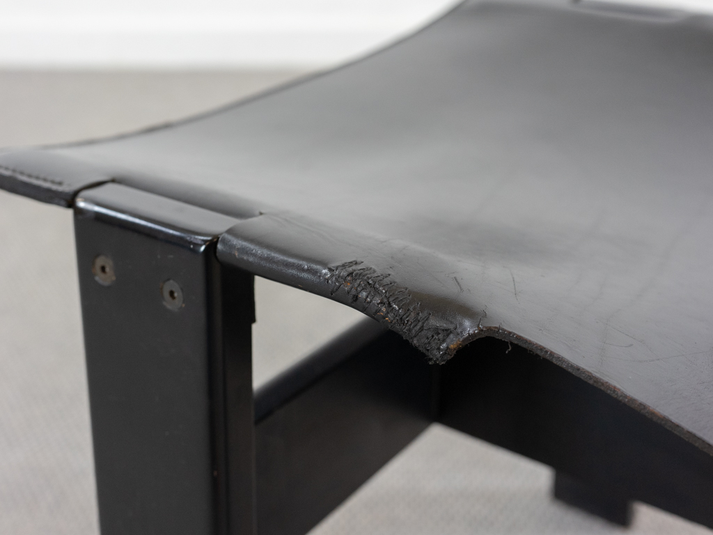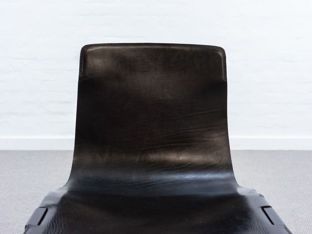 Elegant and rare Tripod Chair in blackened wood and leather by Angelo Mangiarotti for Skipper, Italy 1978. The black saddle leather floats down from the backrest down to the two front legs. Used vintage condition. The leather shows use and age and has a repaired corner. The wooden base was reglued at the two joints which is visible underneath. Of course the chair is sturdy, sound and ready to use.