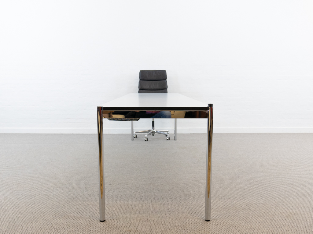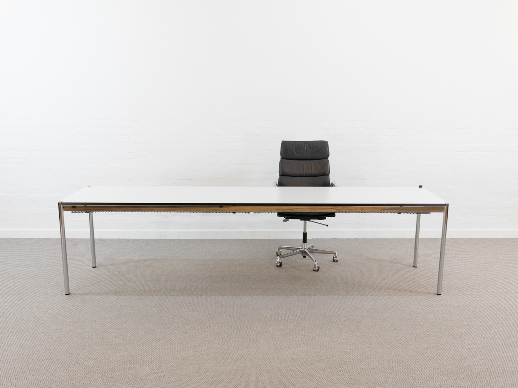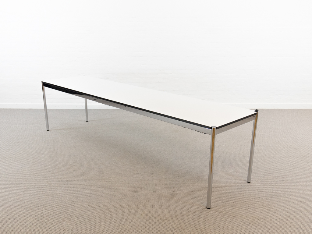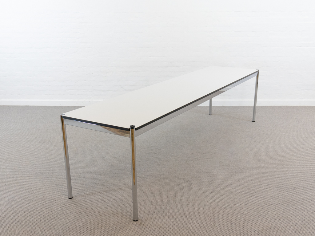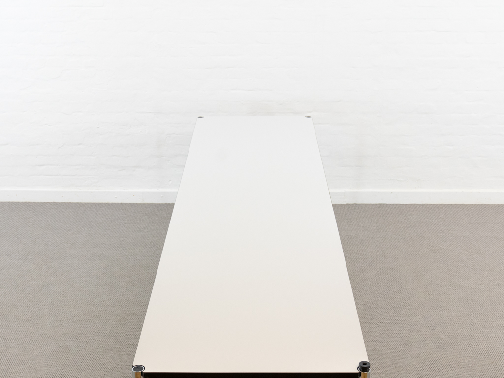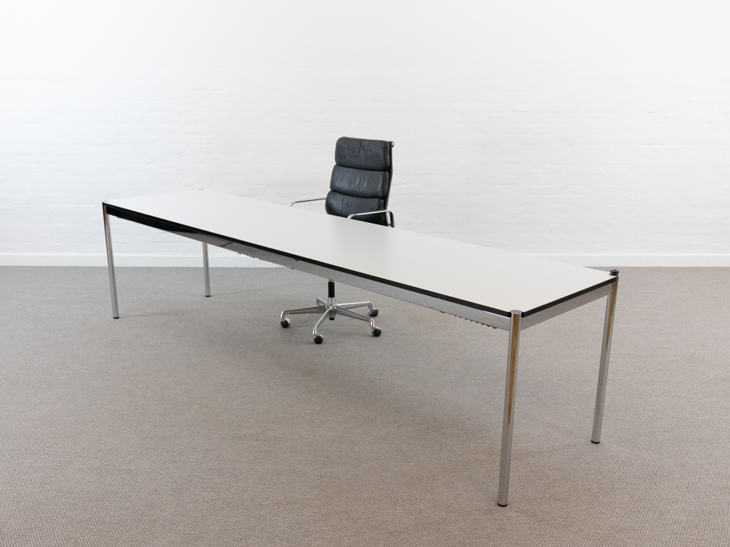 USM Haller Officetable / Desk / Conferencetable. Designed by Prof. Dr. Fritz Haller 1963. Executed in perlgrau white laminate. Equipped with: lamp plug, cable basket holder/cable canal. Very good slightly used condition. Chrom is top. There might be some brown reflections in the photos from studio floor.