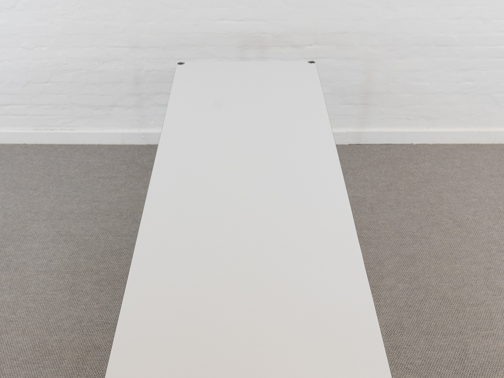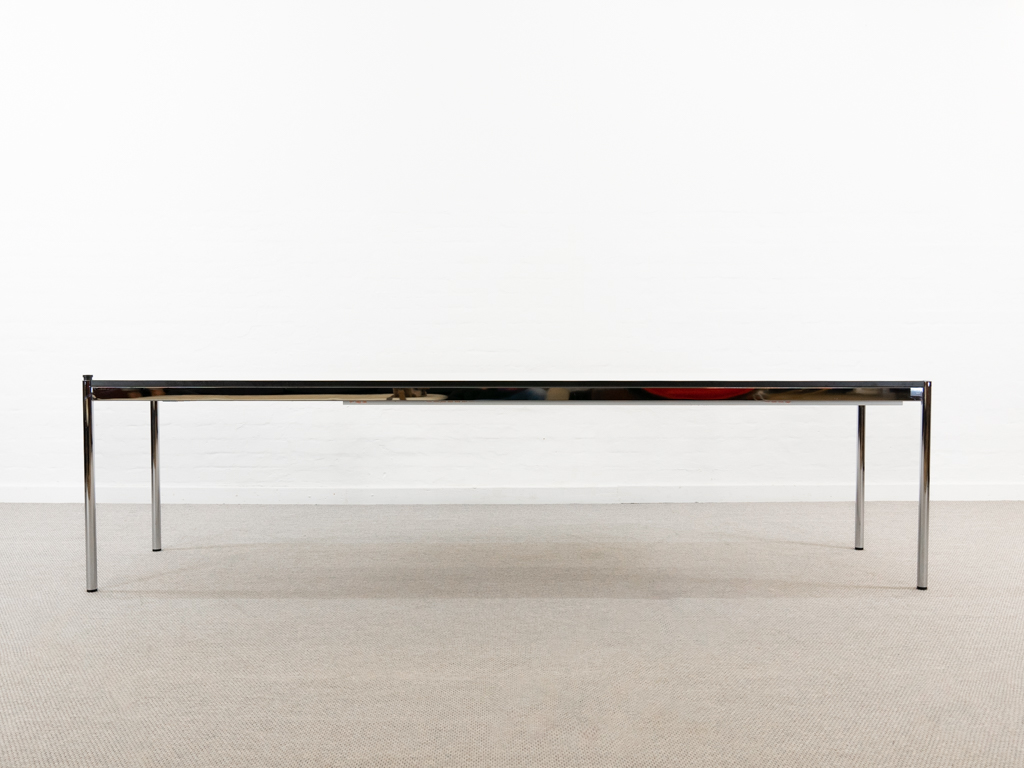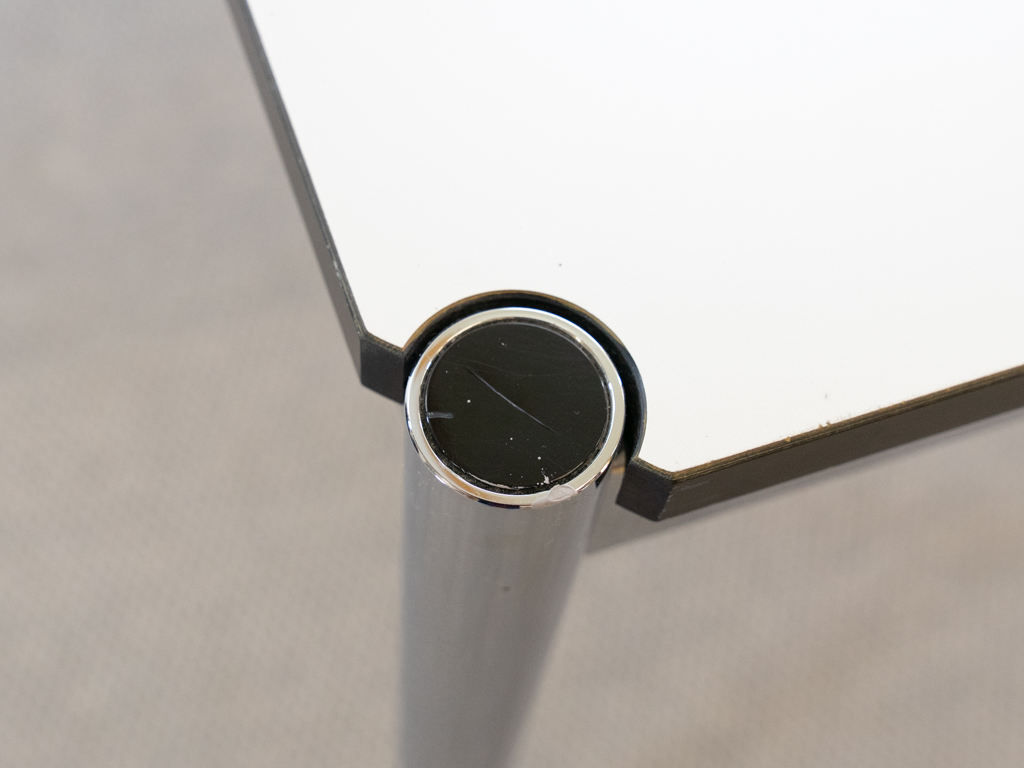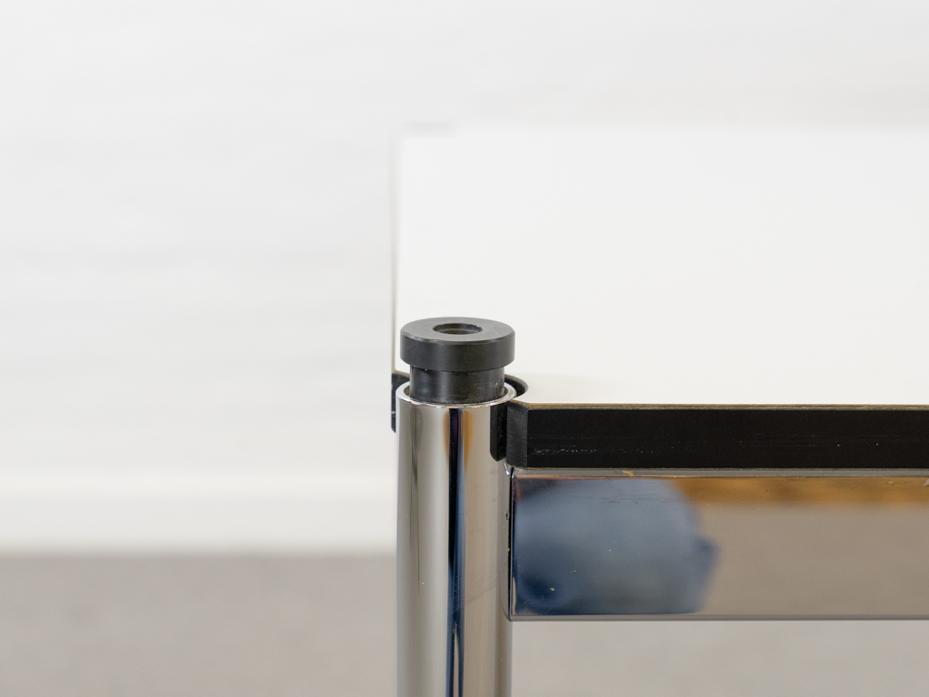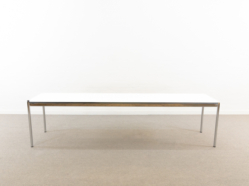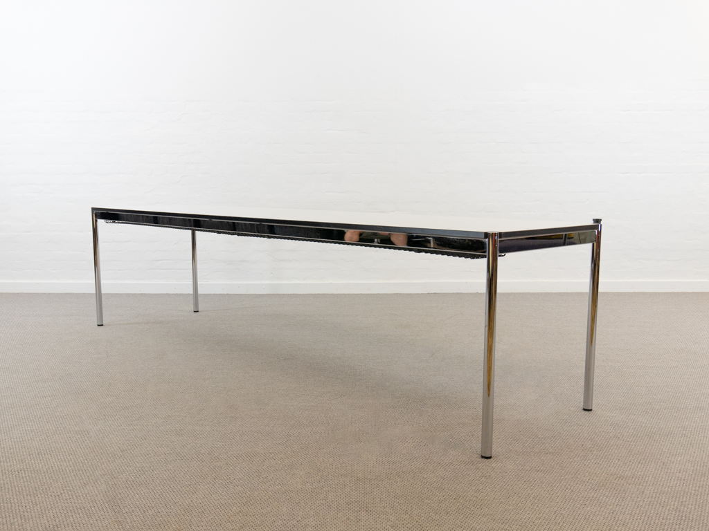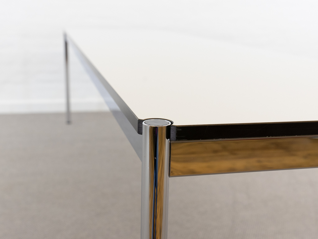 USM Haller Officetable / Desk / Conferencetable. Designed by Prof. Dr. Fritz Haller 1963. Executed in perlgrau white laminate. Equipped with: lamp plug, cable basket holder/cable canal. Very good slightly used condition. Chrom is top. There might be some brown reflections in the photos from studio floor.