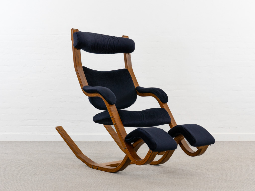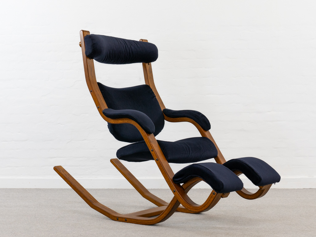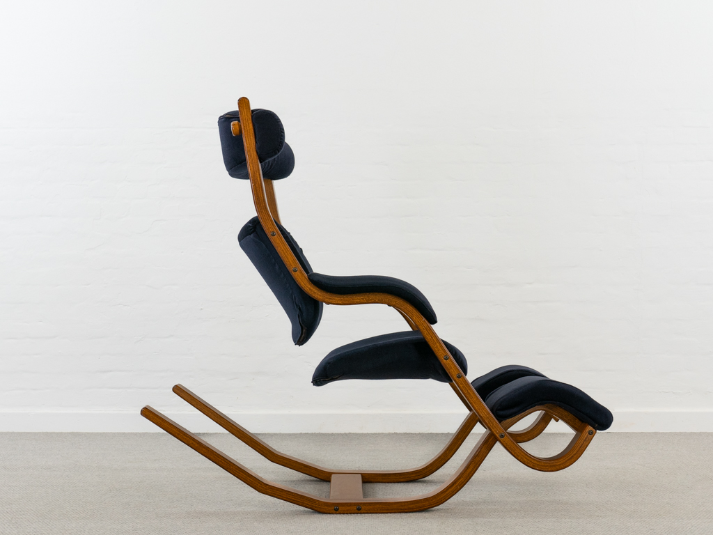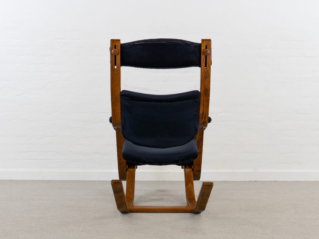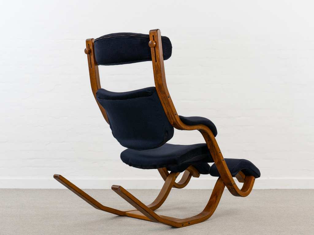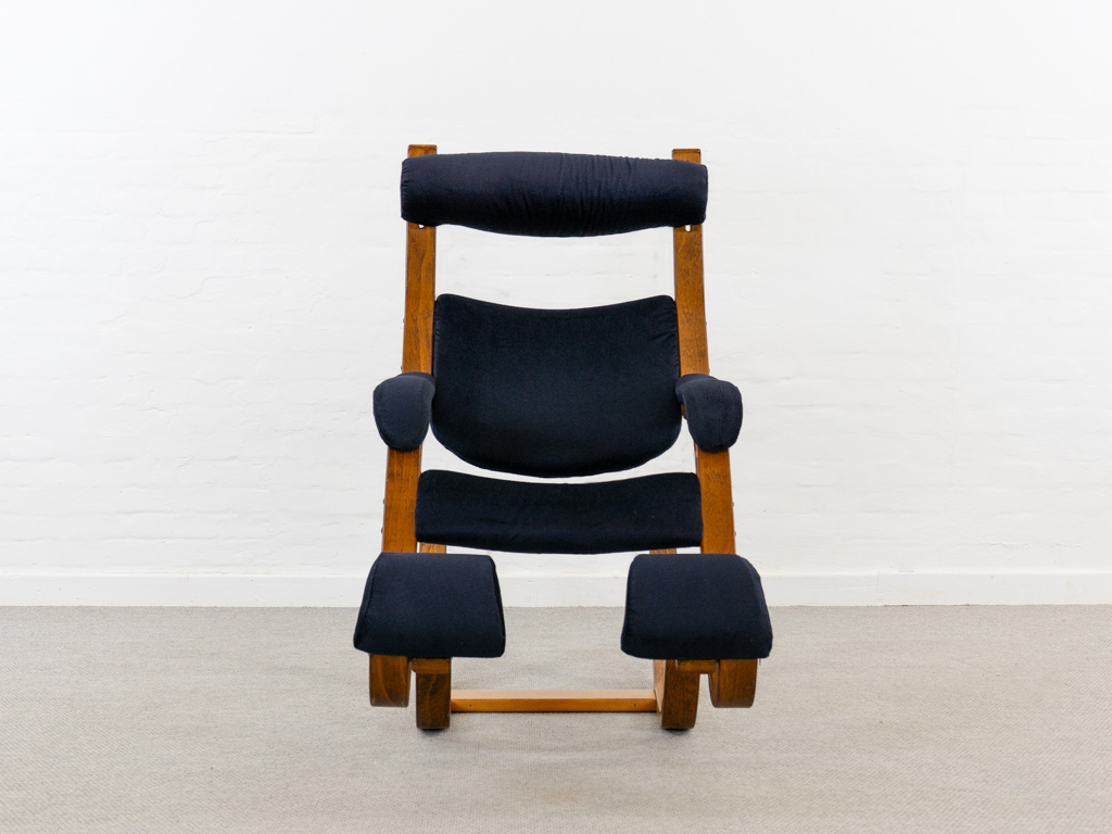 Gravity Balans Sessel, entworfen 1983 von Peter Opsvik für Stokke, Norwegen. Dieser Sessel offeriert vier verschiedene Sitzpositionen von kniend bis vollständig zurückgelehnt. Sie müssen nur Ihr Körpergewicht verlagern, um in die verschiedenen Positionen zu gelangen. Von der bequemen Arbeitshaltung am Tisch bis hin zur völlig zurückgelehnten Schwebeposition. Guter gebrauchter Zustand. Laminierte Buche und dunkelblauer nachträglicher Bezug. Peter Opsvik ist bekannt für den sehr erfolgreichen Tripp-Trapp Kinderstuhl von Stocke. Mit Herstelleretikett bezeichnet. Nichtraucherobjekt.