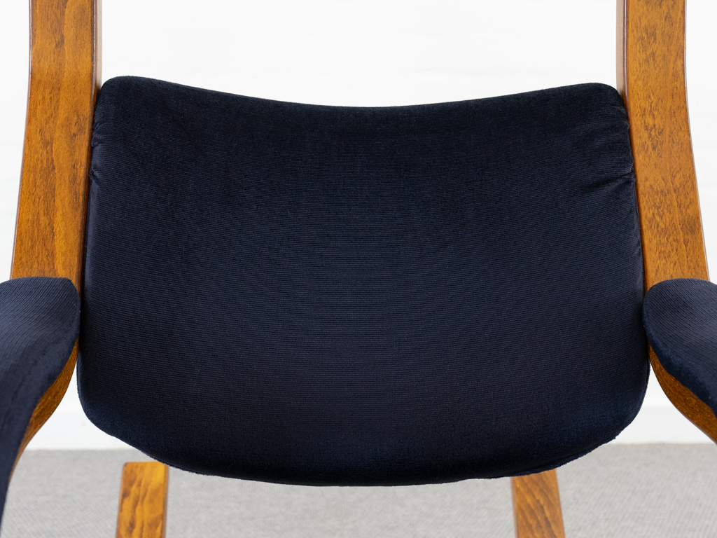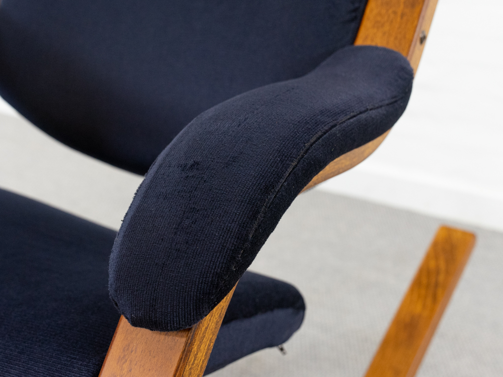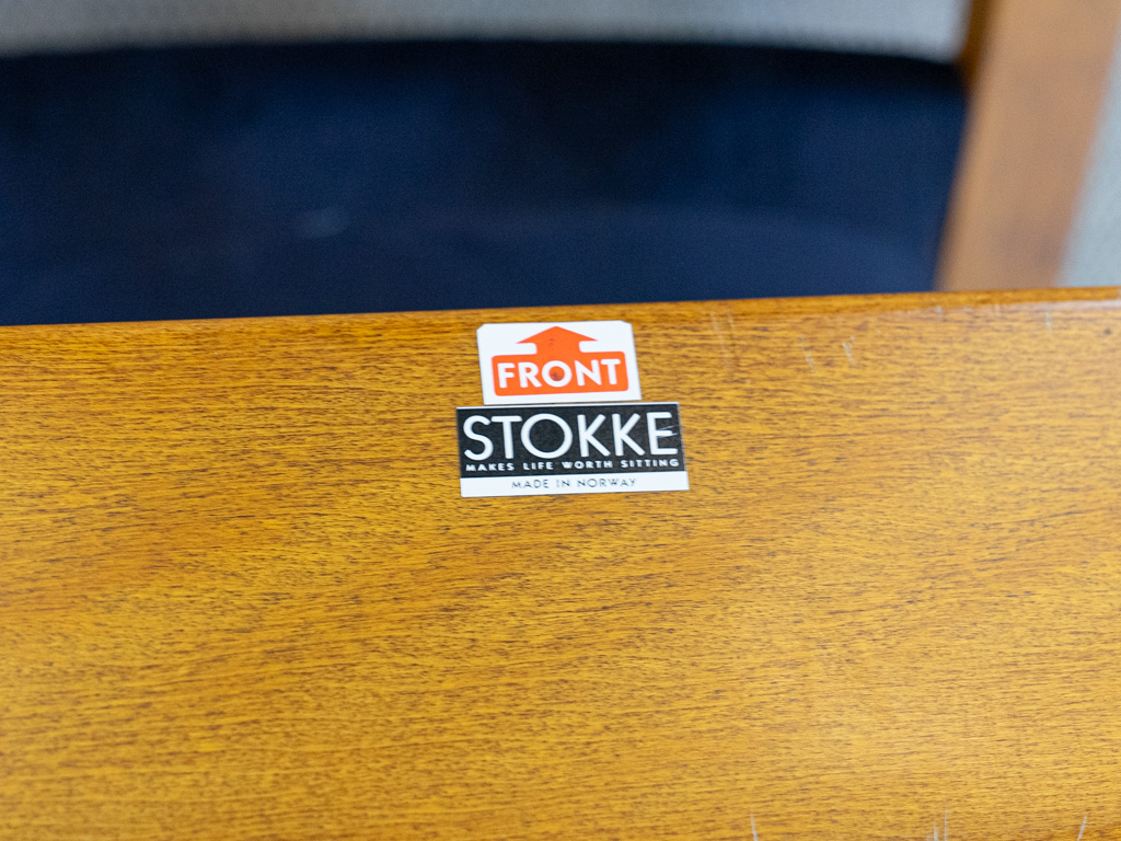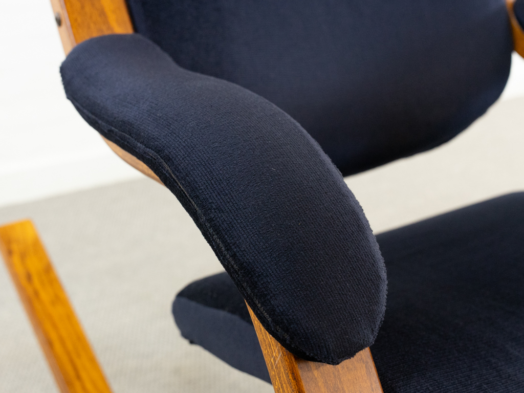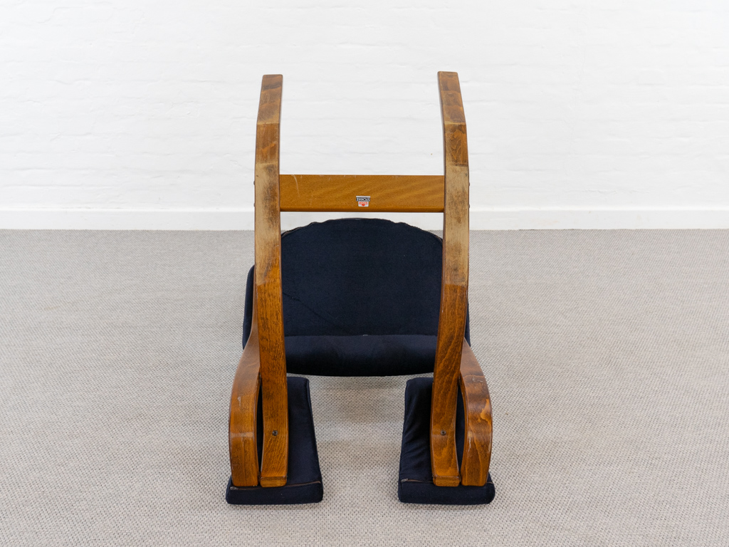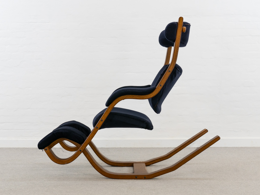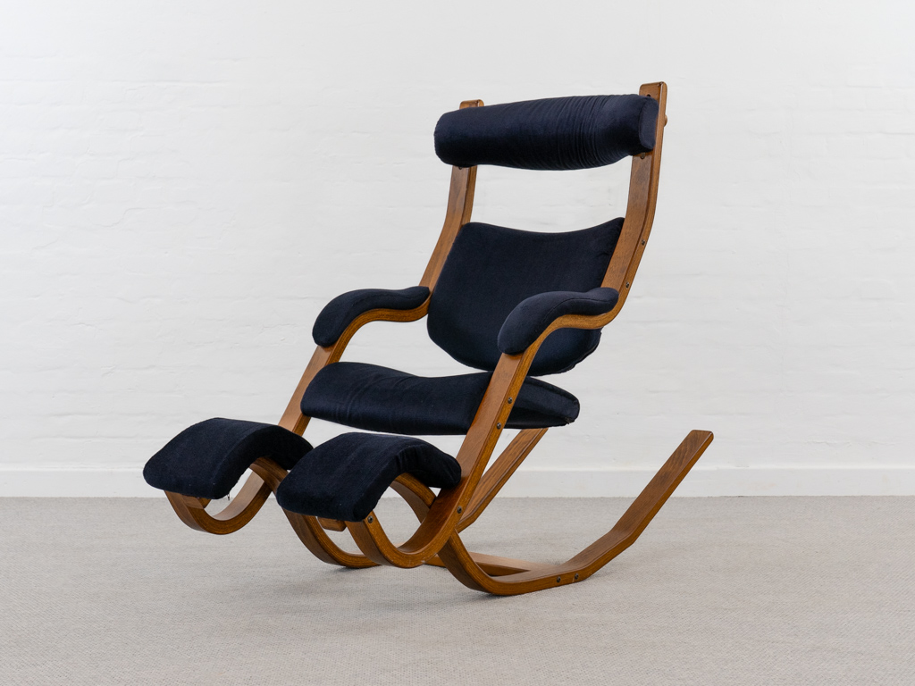 Gravity Balans Sessel, entworfen 1983 von Peter Opsvik für Stokke, Norwegen. Dieser Sessel offeriert vier verschiedene Sitzpositionen von kniend bis vollständig zurückgelehnt. Sie müssen nur Ihr Körpergewicht verlagern, um in die verschiedenen Positionen zu gelangen. Von der bequemen Arbeitshaltung am Tisch bis hin zur völlig zurückgelehnten Schwebeposition. Guter gebrauchter Zustand. Laminierte Buche und dunkelblauer nachträglicher Bezug. Peter Opsvik ist bekannt für den sehr erfolgreichen Tripp-Trapp Kinderstuhl von Stocke. Mit Herstelleretikett bezeichnet. Nichtraucherobjekt.