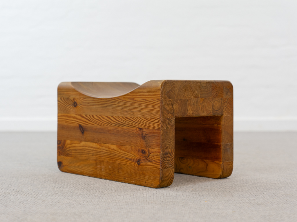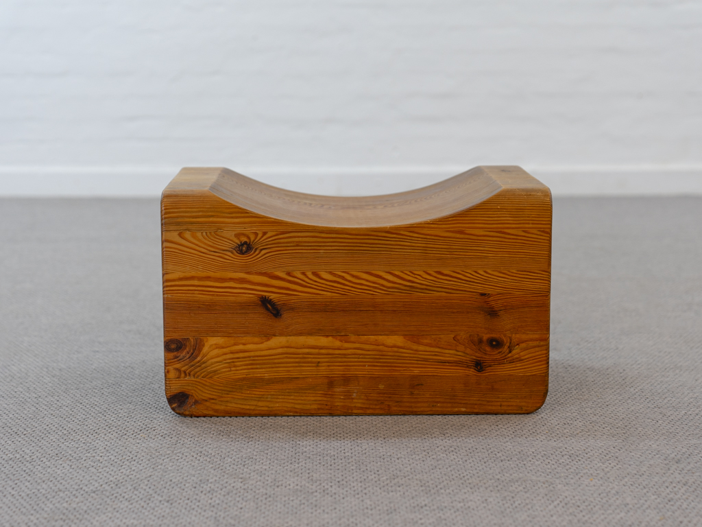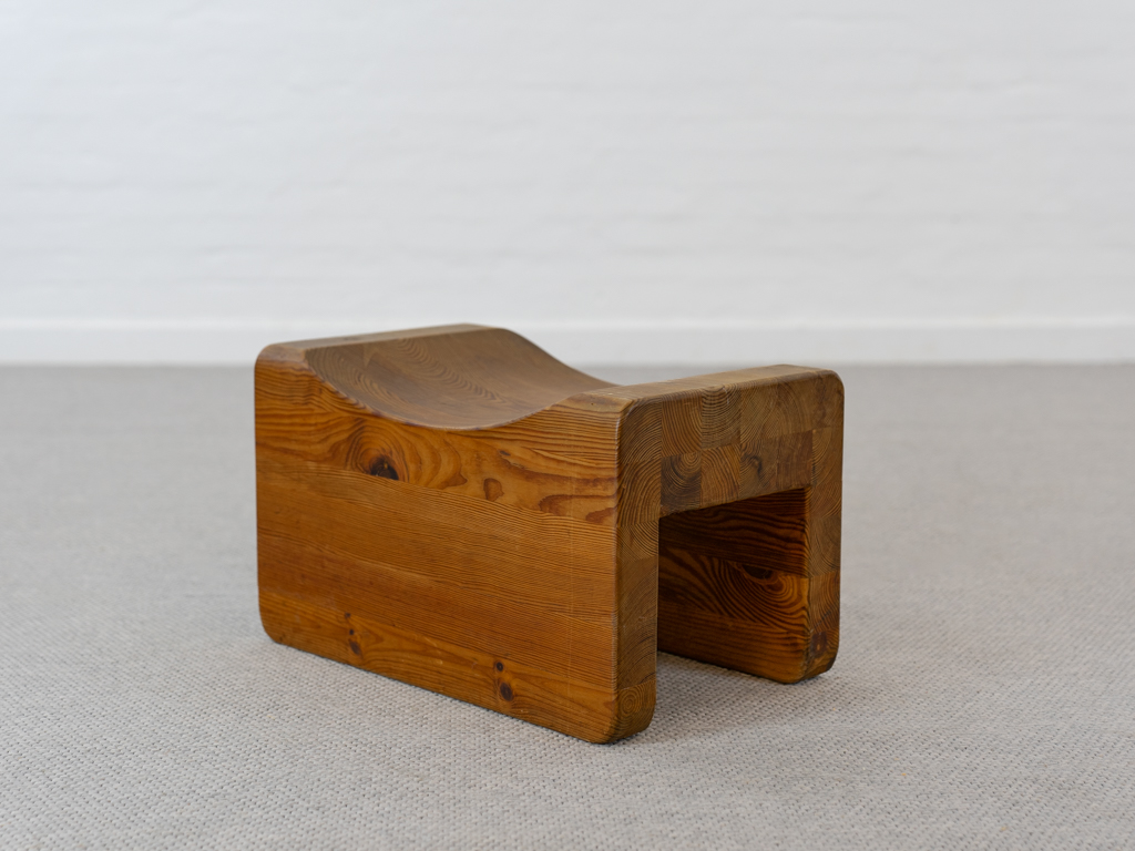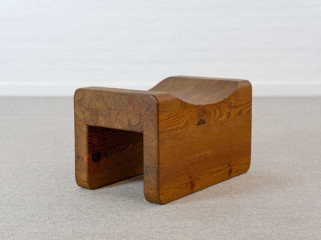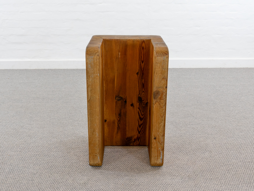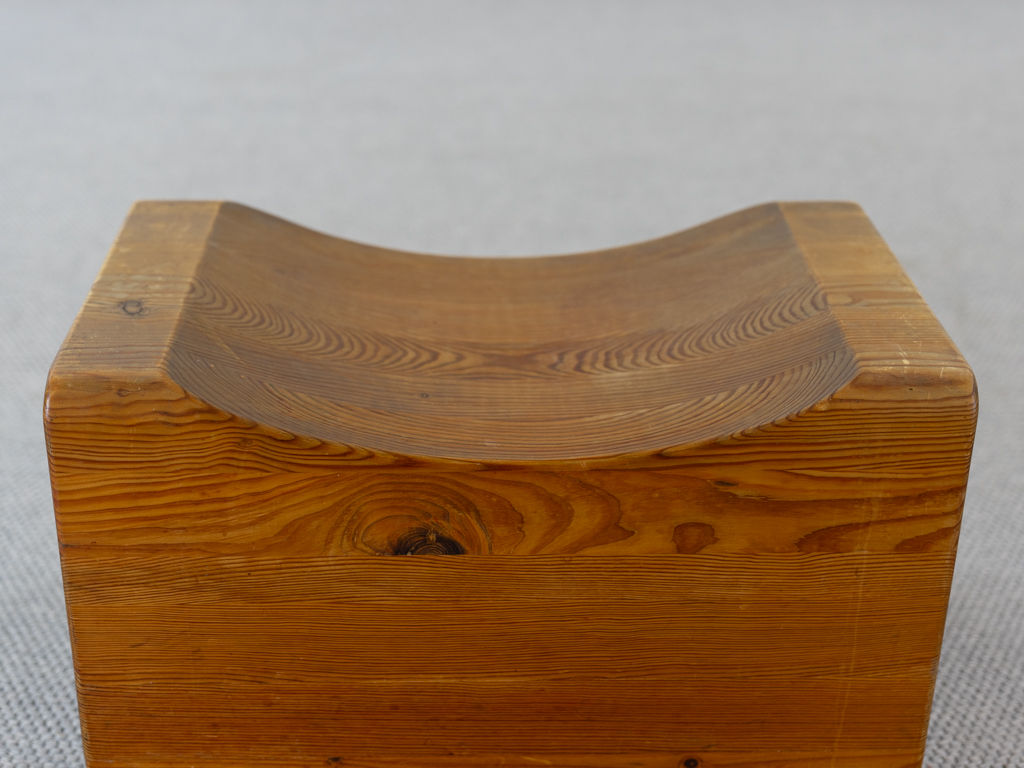 Seltener „Palle“ Hocker in Kiefernholz. Produziert in den 1970er Jahren von K.J. Pettersson & Söner, Schweden. Mehr Raumobjekt als Sitzmöbel. Gerade Seiten mit Sitzmulde. Tolle Patina. Es scheint eine Fußseite nachgeleimt worden zu sein. Entwerfer unbekannt, würde des Öfteren vormals Axel Einar Hjorth zugeschrieben.