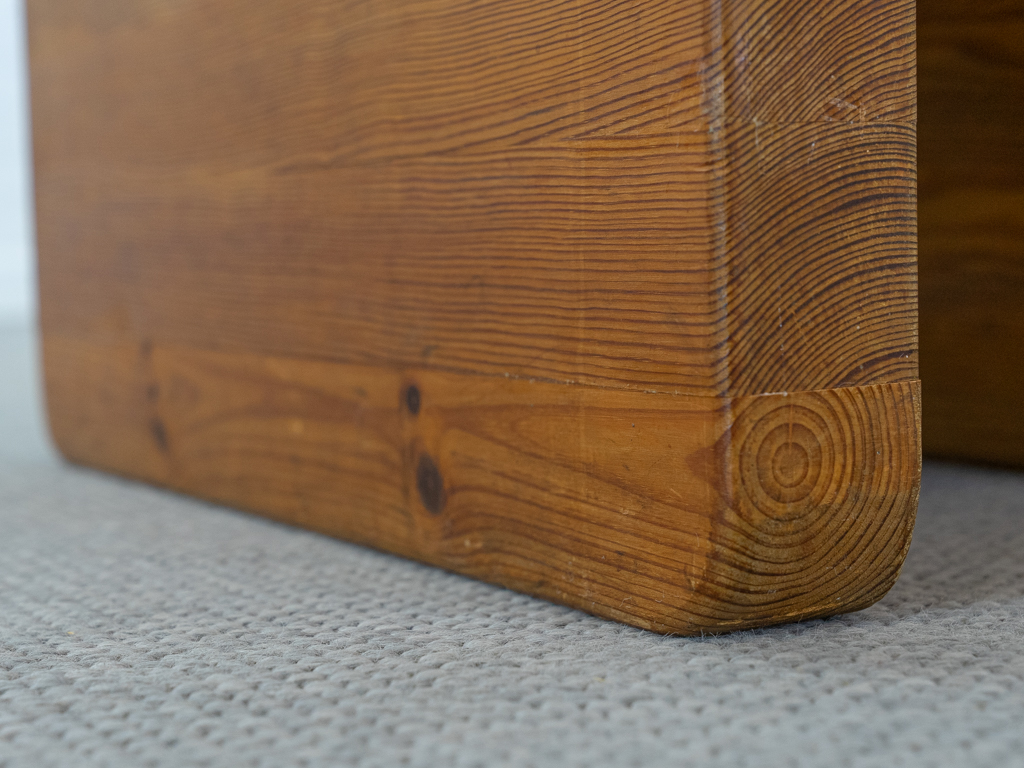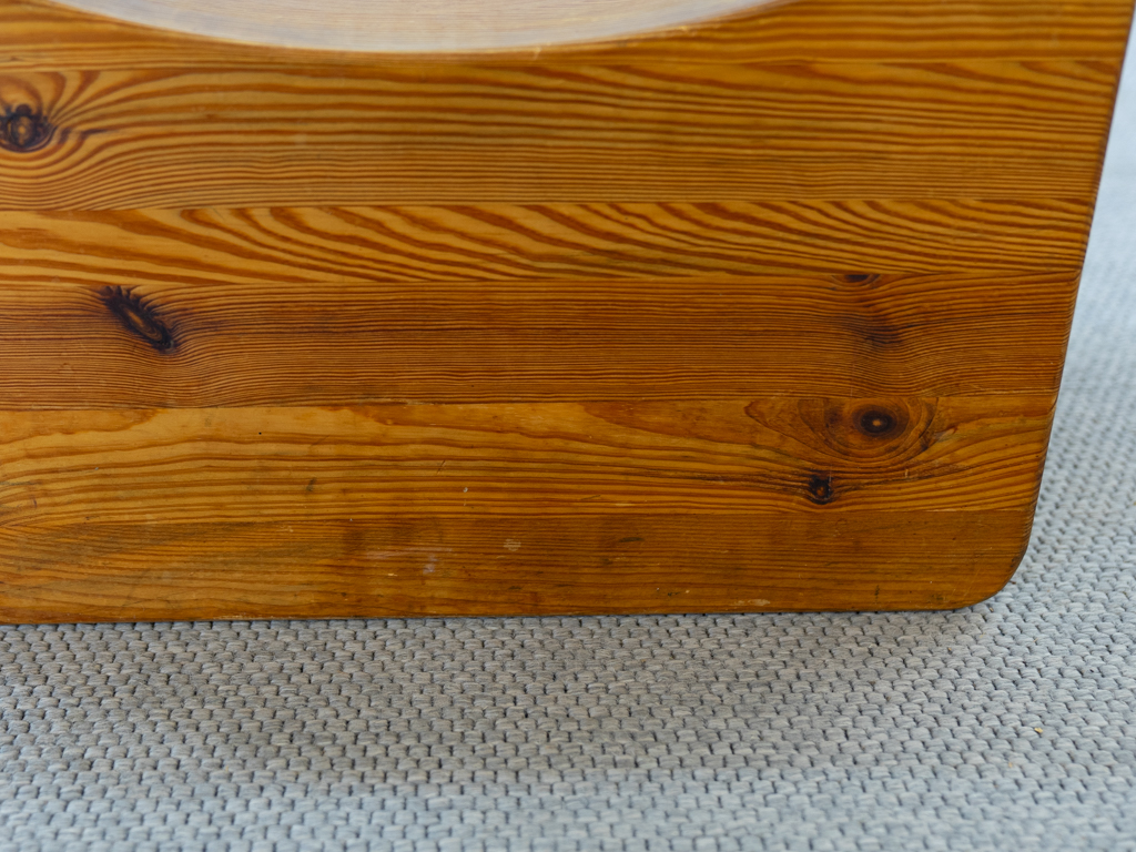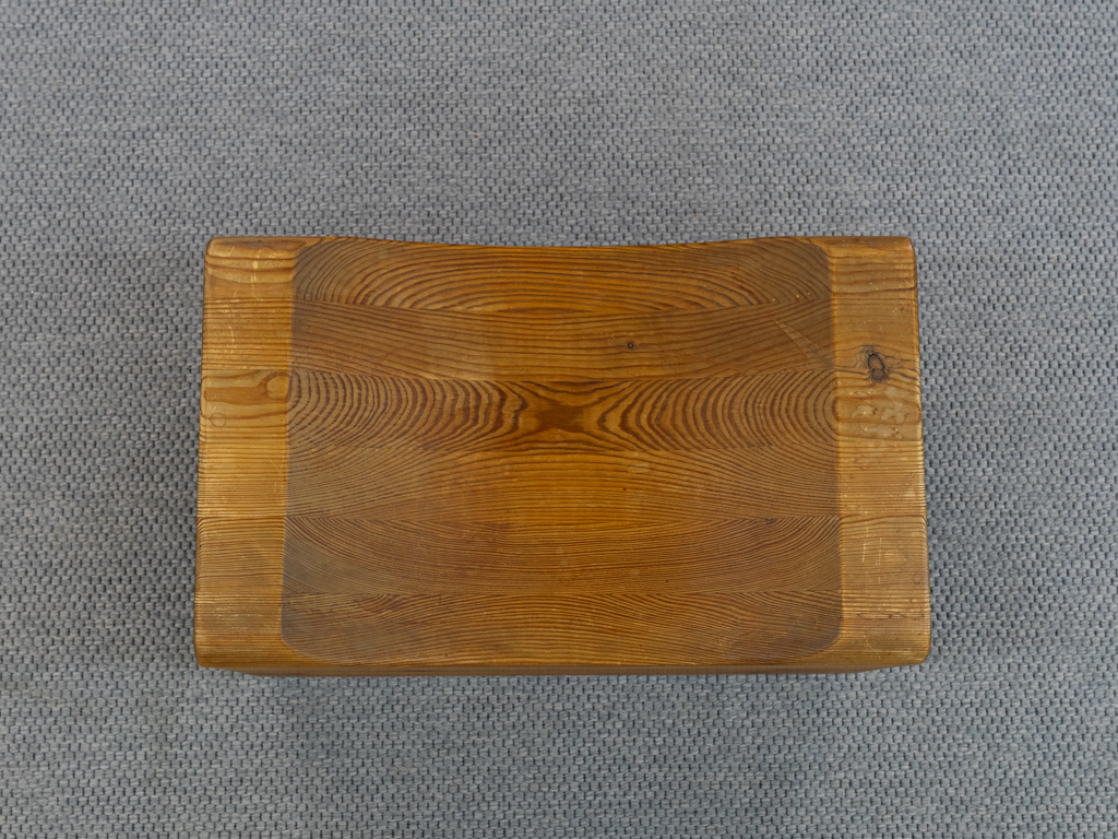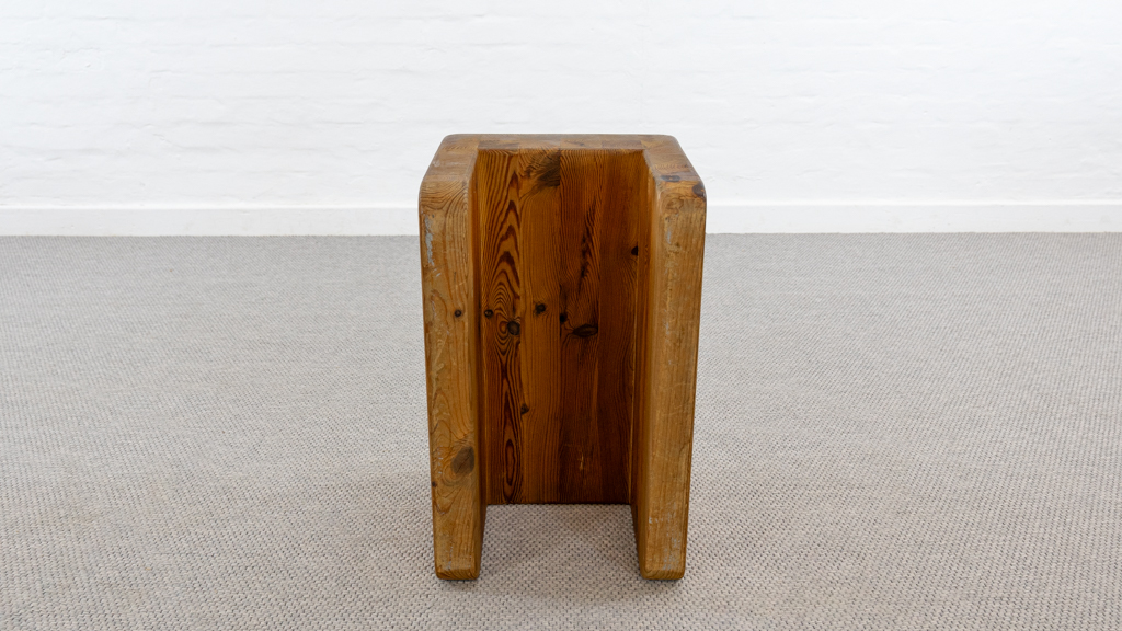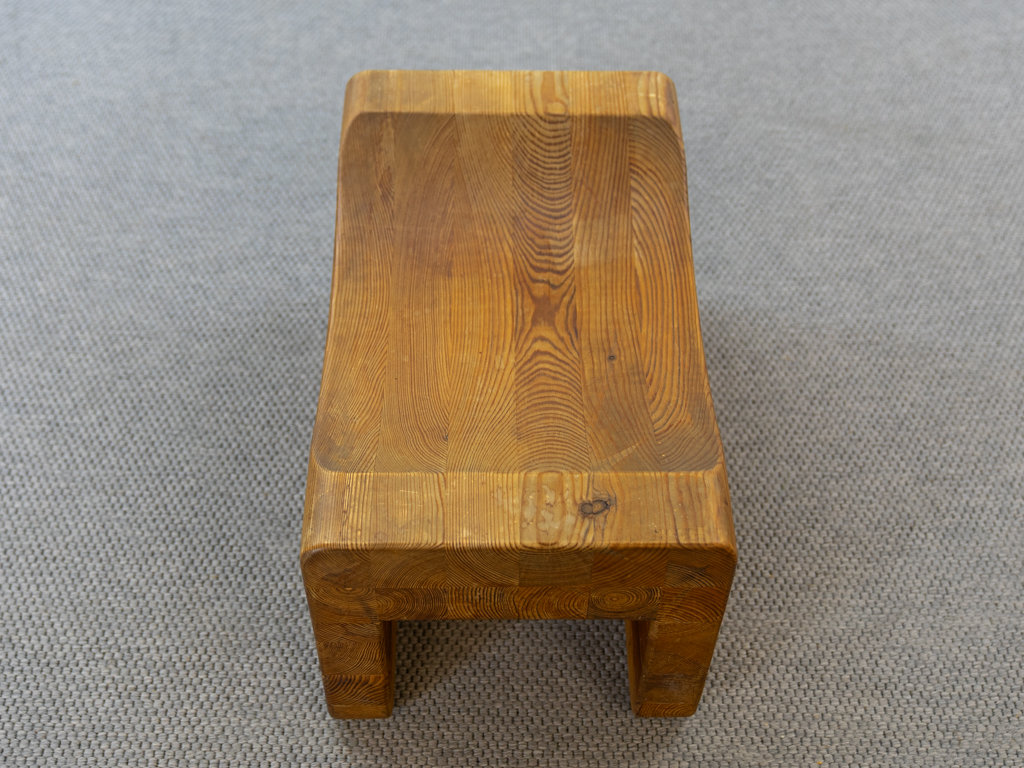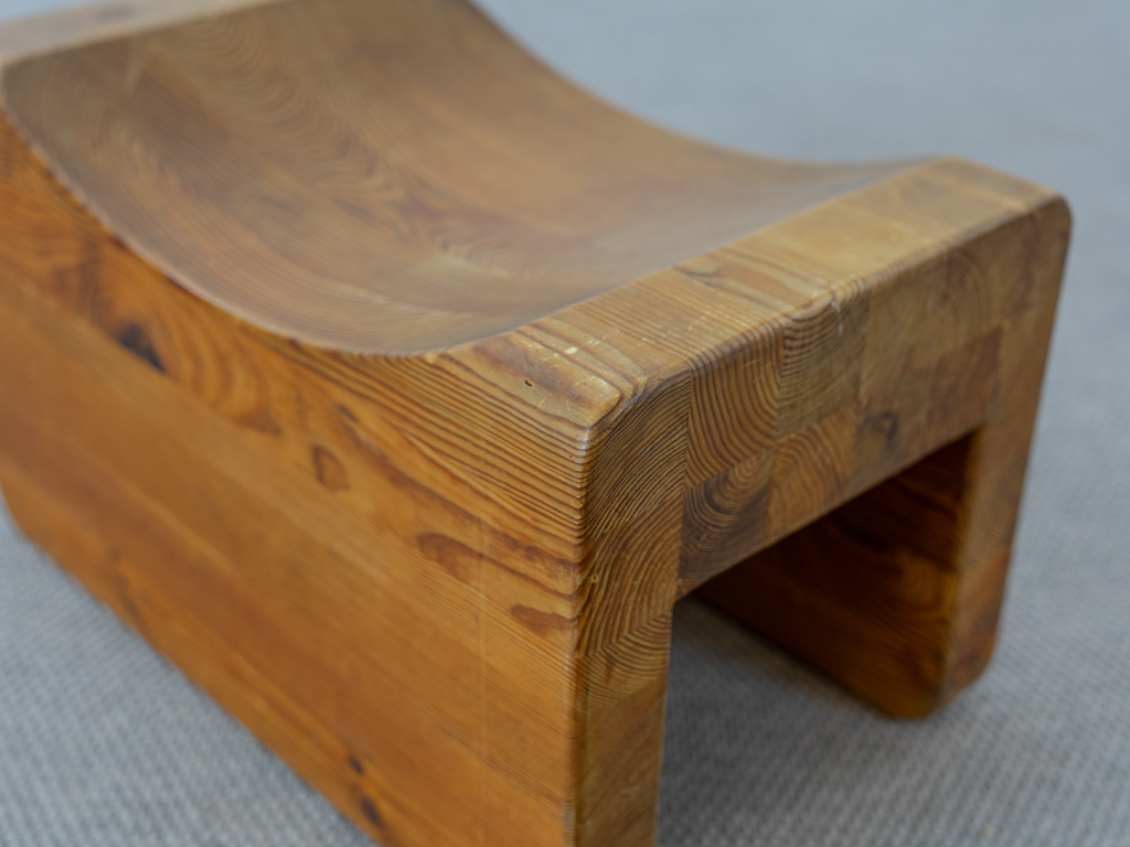 Seltener „Palle“ Hocker in Kiefernholz. Produziert in den 1970er Jahren von K.J. Pettersson & Söner, Schweden. Mehr Raumobjekt als Sitzmöbel. Gerade Seiten mit Sitzmulde. Tolle Patina. Es scheint eine Fußseite nachgeleimt worden zu sein. Entwerfer unbekannt, würde des Öfteren vormals Axel Einar Hjorth zugeschrieben.