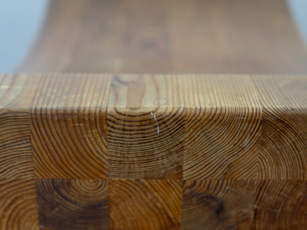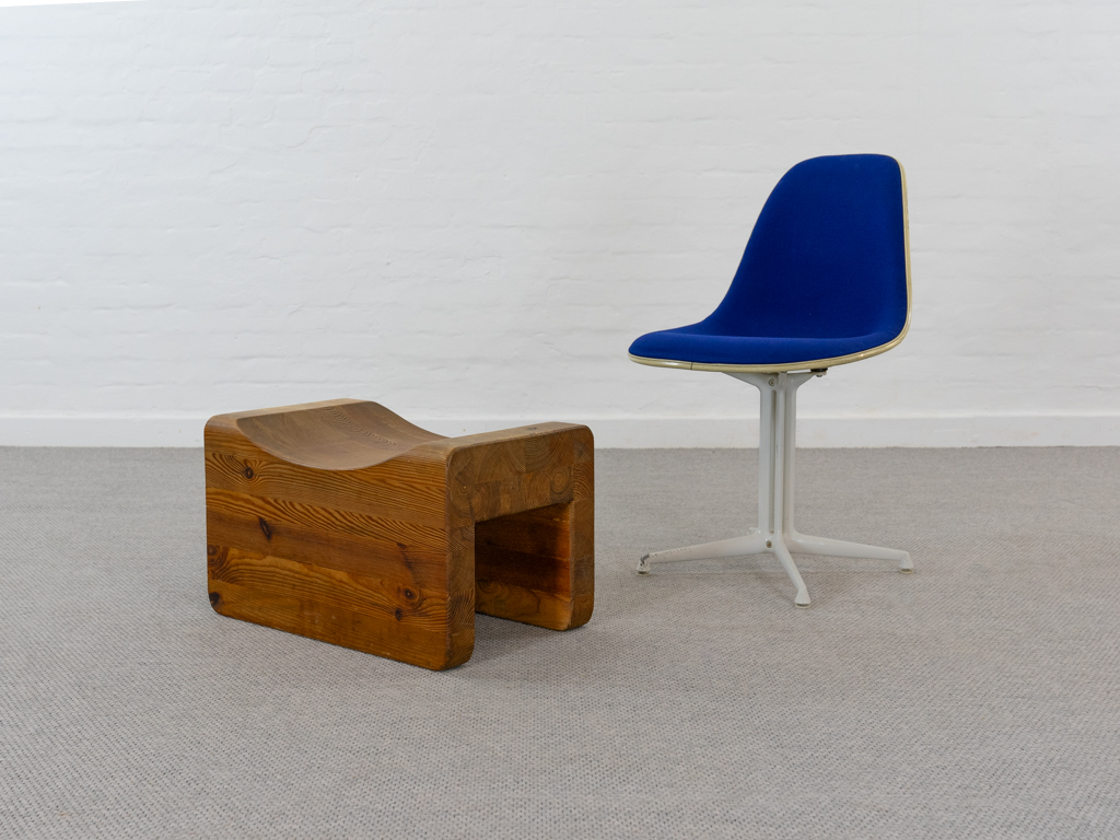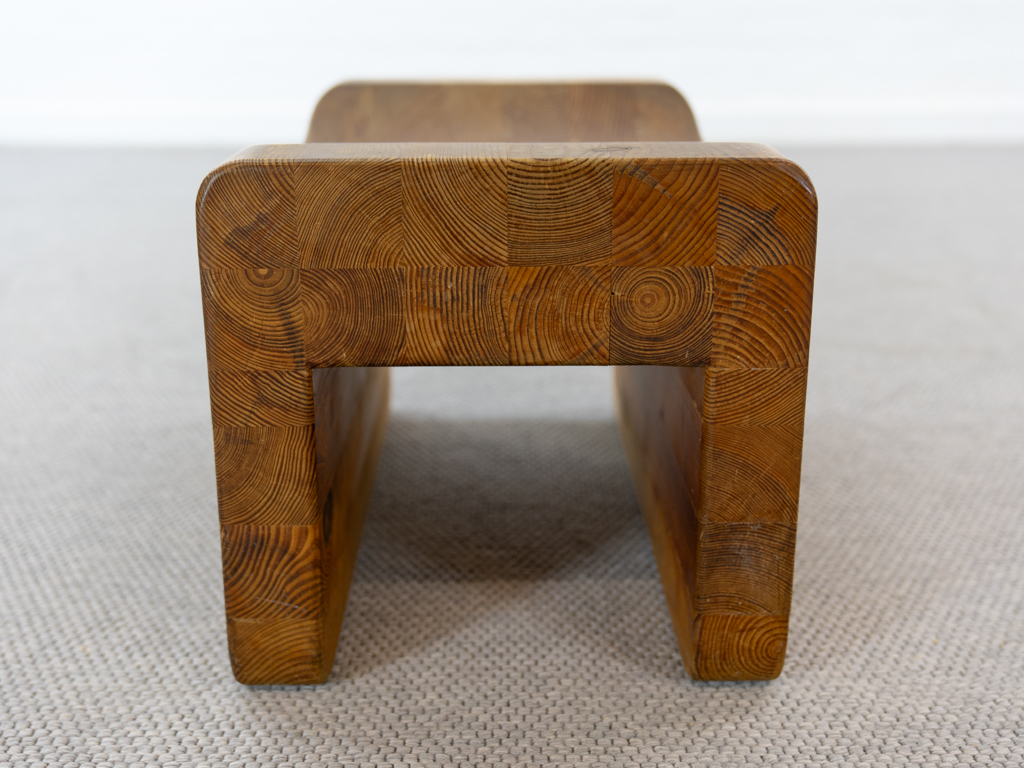 Der Hocker wurde aus mehreren einzelnen Kiefernholz Kanthölzern verleimt und zu seiner skulpturalen Form gebracht. So weist jeder Hocker durch die Holzmaserung sein eigenes Muster auf, was zur Einzigartigkeit jedes Stückes führt.