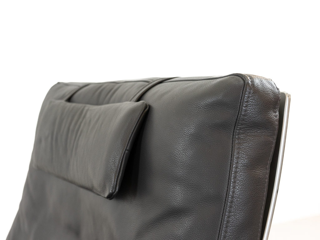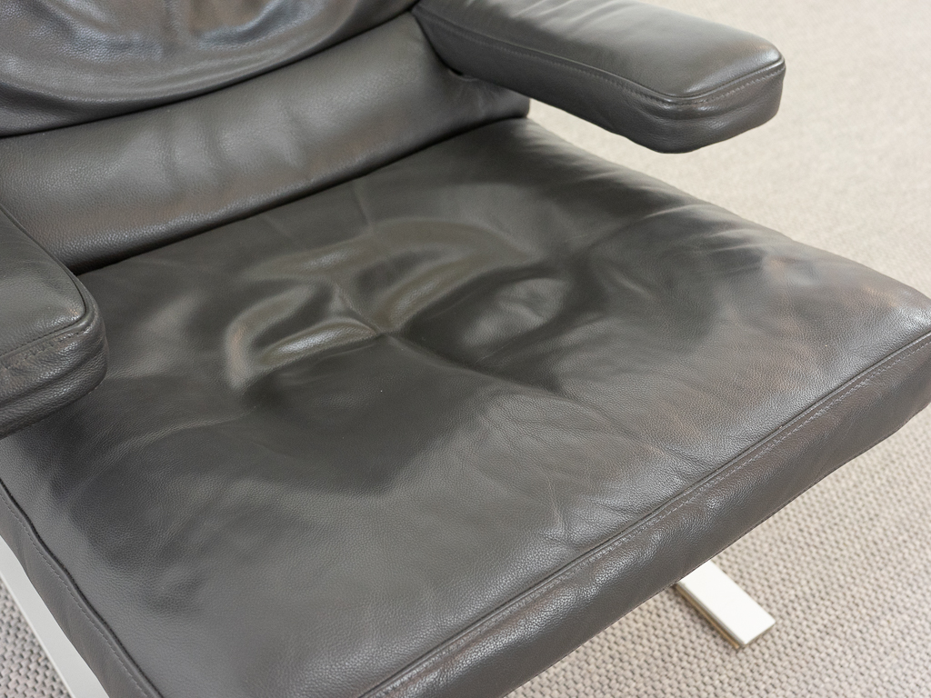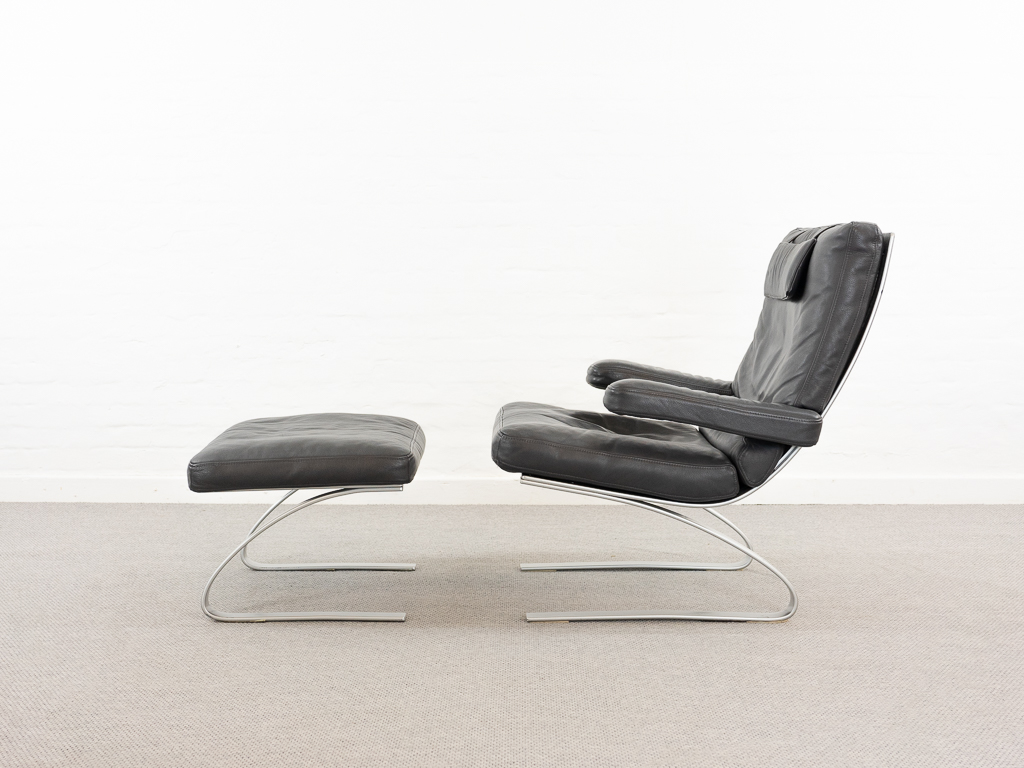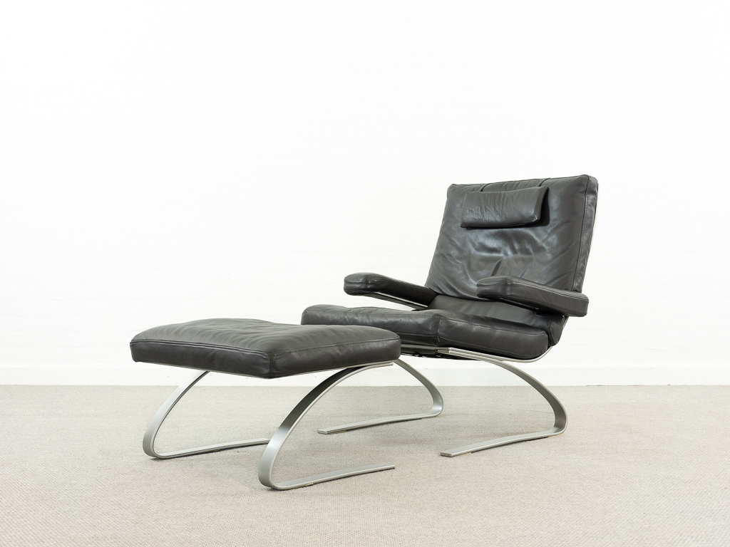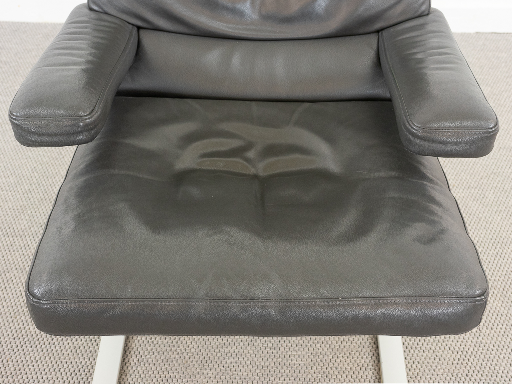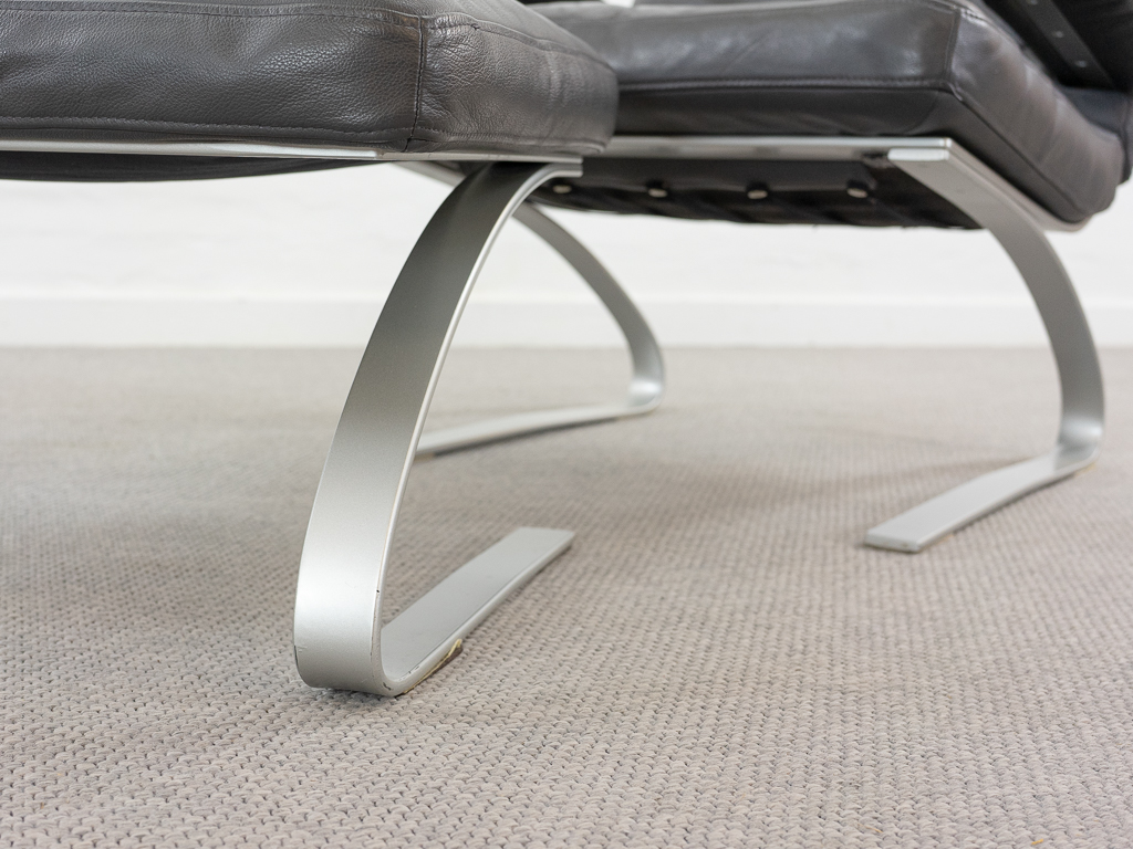 Hochwertiger Lounge Sessel / Schwingsessel mit Fusshocker aus den 70er/80er Jahren. Massiver Bandstahlrahmen bezogen mit dunkelgrauem Leder. Guter gebrauchter Zustand. Das Leder weist keine Flecken auf und ist angenehm und weich. Die Sitzfläche zeigt eine leichte Vertiefung. Toller Sitzkomfort, insbesondere durch das leichte Schwingen der Konstruktion. Die Lackierung des Bandstahls weist kleinere Fehlstellen auf. Hersteller und Designer unbekannt. Nichtraucher Objekt.