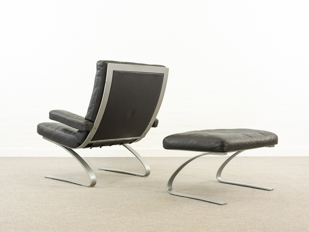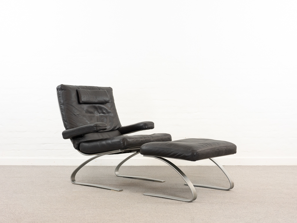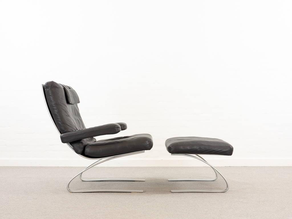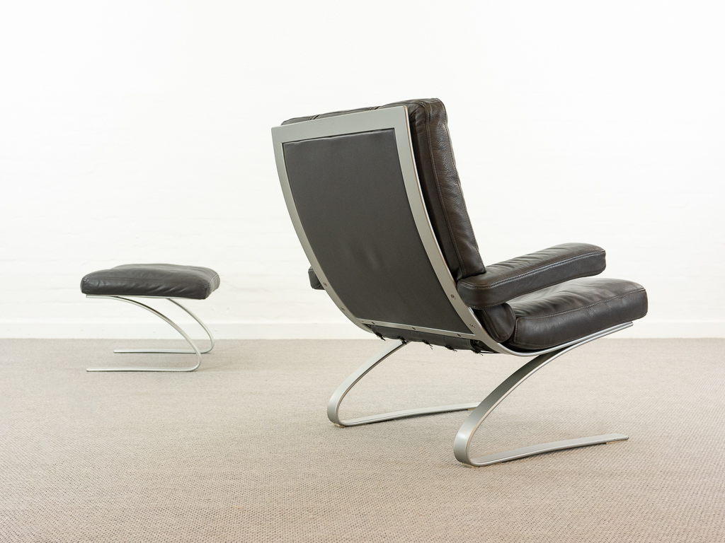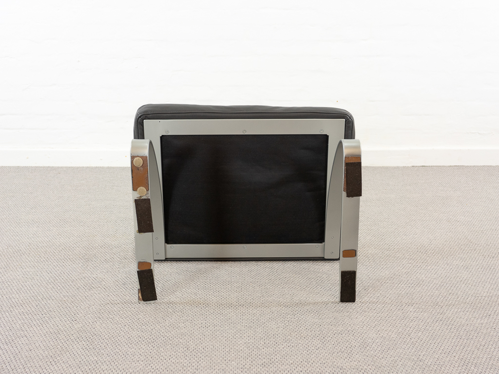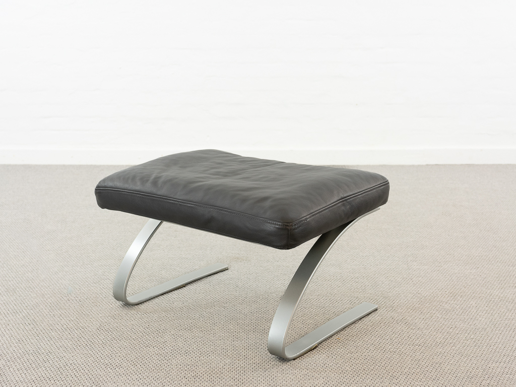 Hochwertiger Lounge Sessel / Schwingsessel mit Fusshocker aus den 70er/80er Jahren. Massiver Bandstahlrahmen bezogen mit dunkelgrauem Leder. Guter gebrauchter Zustand. Das Leder weist keine Flecken auf und ist angenehm und weich. Die Sitzfläche zeigt eine leichte Vertiefung. Toller Sitzkomfort, insbesondere durch das leichte Schwingen der Konstruktion. Die Lackierung des Bandstahls weist kleinere Fehlstellen auf. Hersteller und Designer unbekannt. Nichtraucher Objekt.
