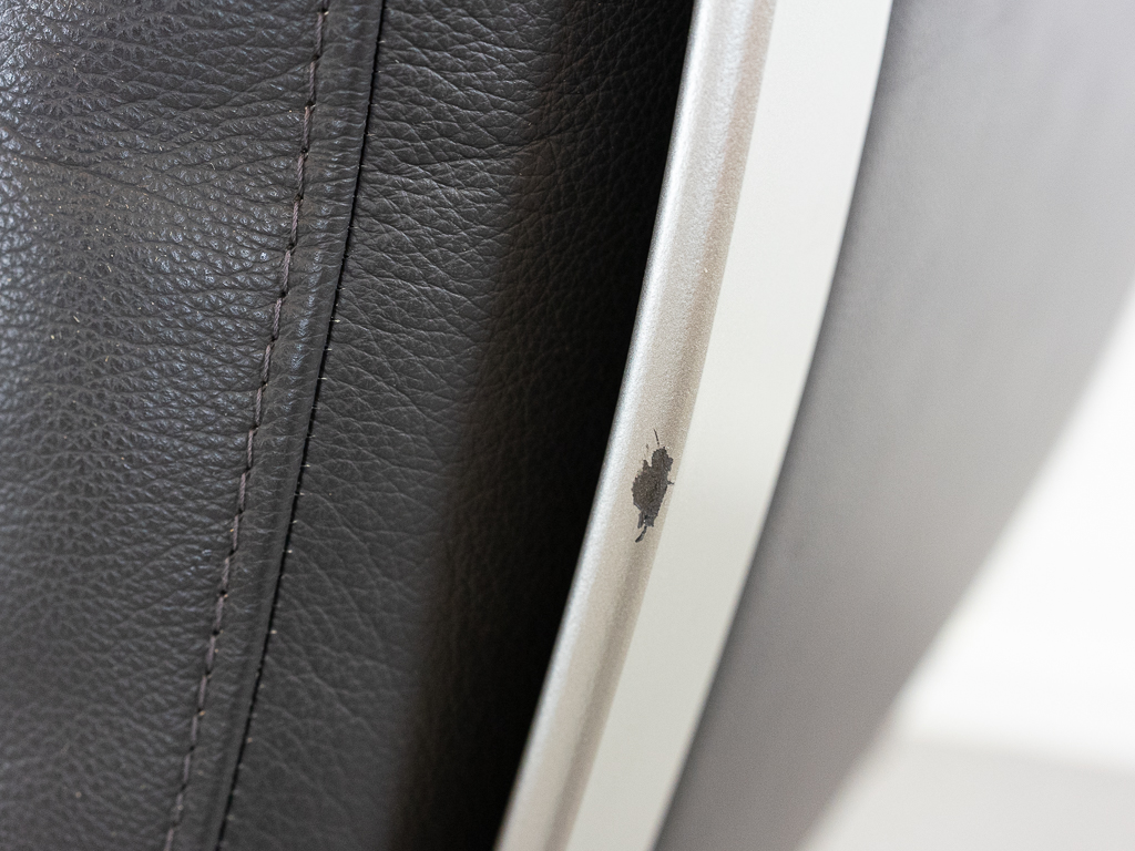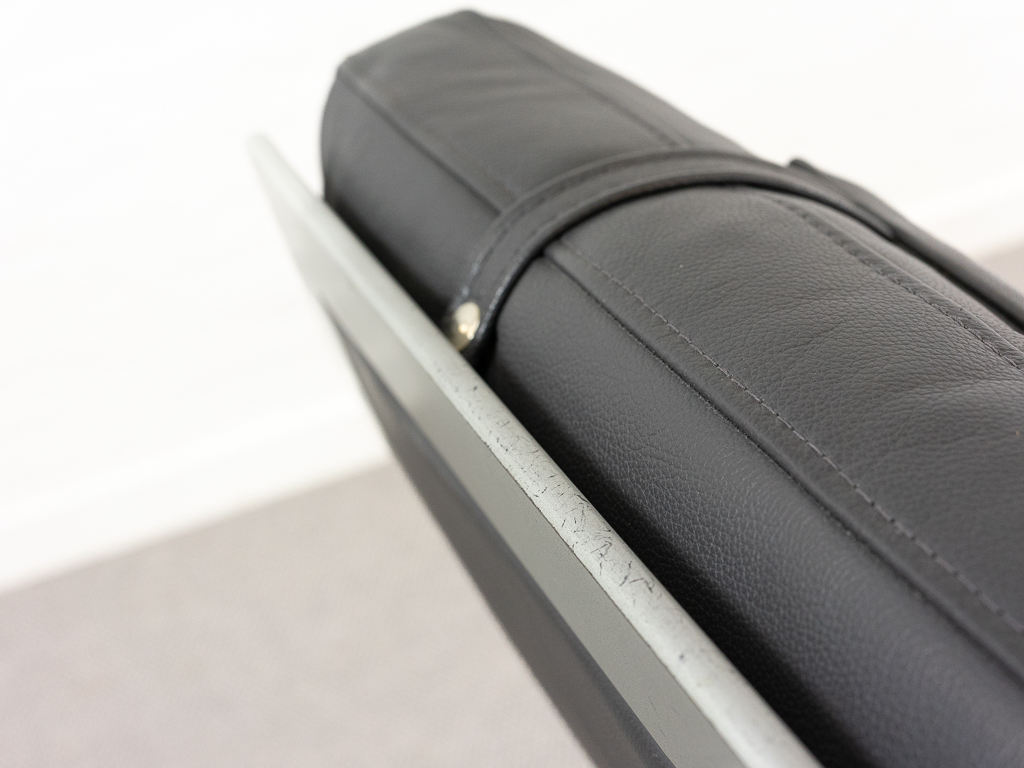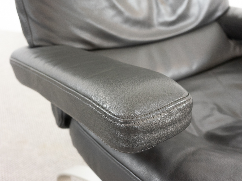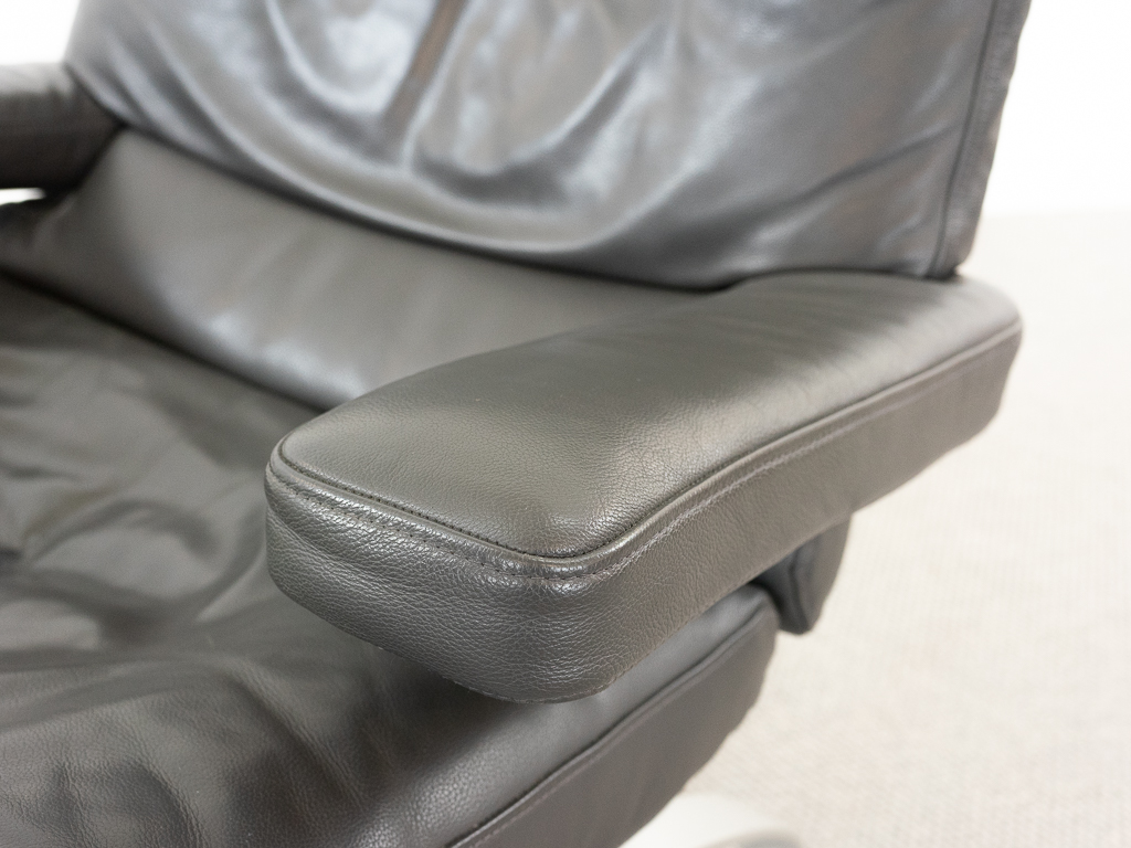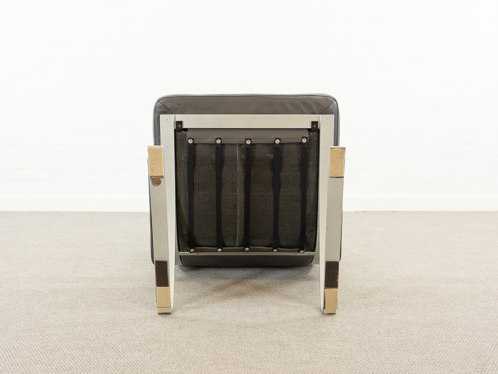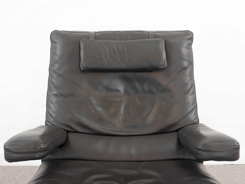 Hochwertiger Lounge Sessel / Schwingsessel mit Fusshocker aus den 70er/80er Jahren. Massiver Bandstahlrahmen bezogen mit dunkelgrauem Leder. Guter gebrauchter Zustand. Das Leder weist keine Flecken auf und ist angenehm und weich. Die Sitzfläche zeigt eine leichte Vertiefung. Toller Sitzkomfort, insbesondere durch das leichte Schwingen der Konstruktion. Die Lackierung des Bandstahls weist kleinere Fehlstellen auf. Hersteller und Designer unbekannt. Nichtraucher Objekt.