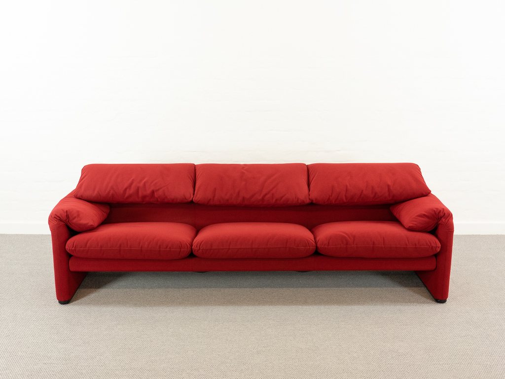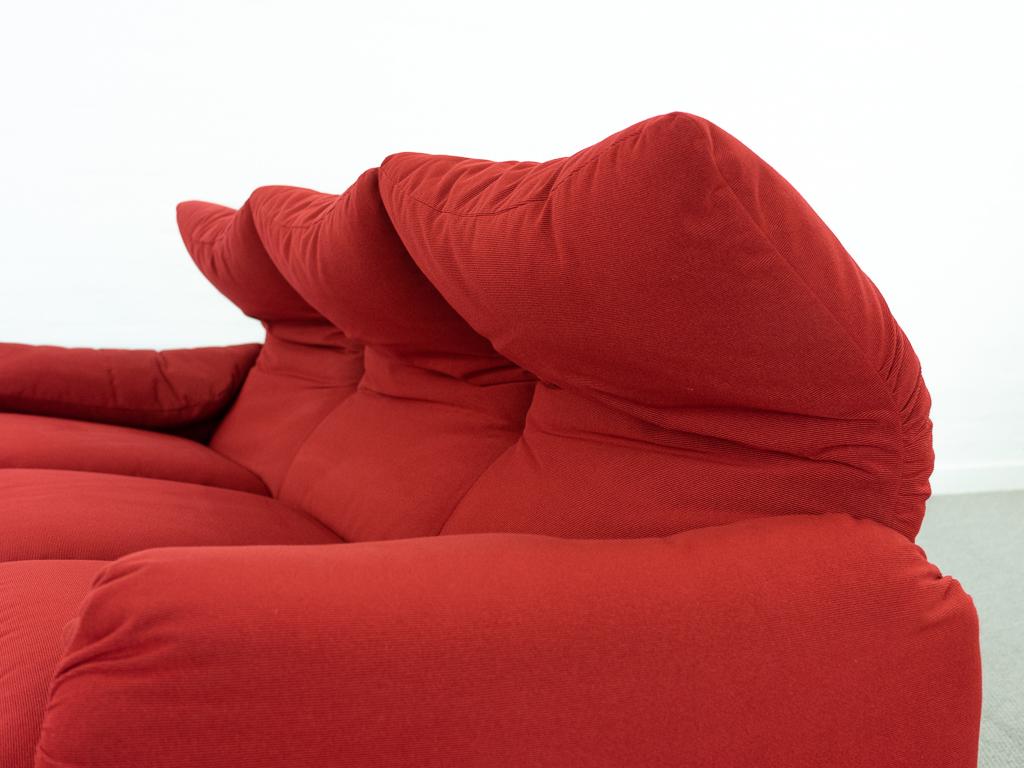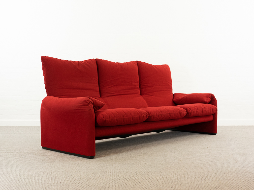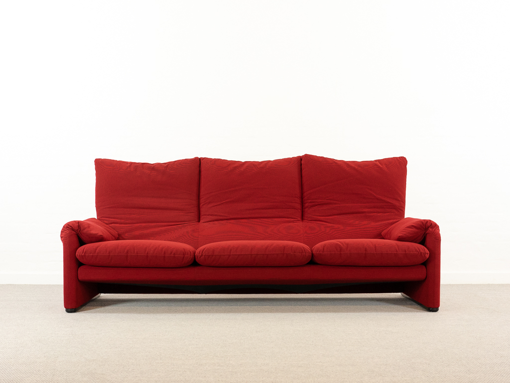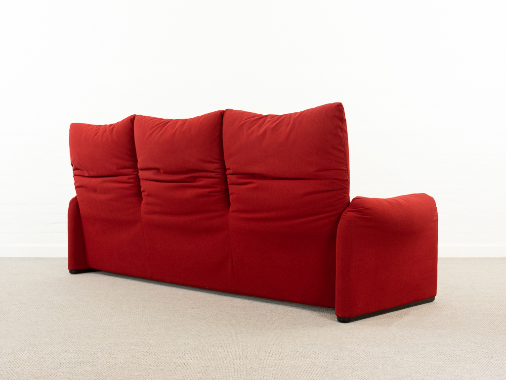 Maralunga 3-Sitzer Sofa von Cassina, entworfen 1973 von Vico Magistretti. Dieses Sofa verfügt über faltbare Rückenlehnen um verschiedene Sitzpositionen zu ermöglichen. Gepolstert im originalem rotem Cassina Soff. Das Sofa ist mit Herstelleretikett gelabelt sowie Cassina Schriftzug im Unterstoff. Höhe der niedrigen Position Rückenlehne 70cm, Höhe der hohen Position Rückenlehne: 100cm. Nichtraucher-Objekt. Guter gebrauchter Zustand.