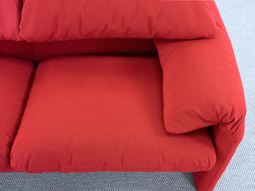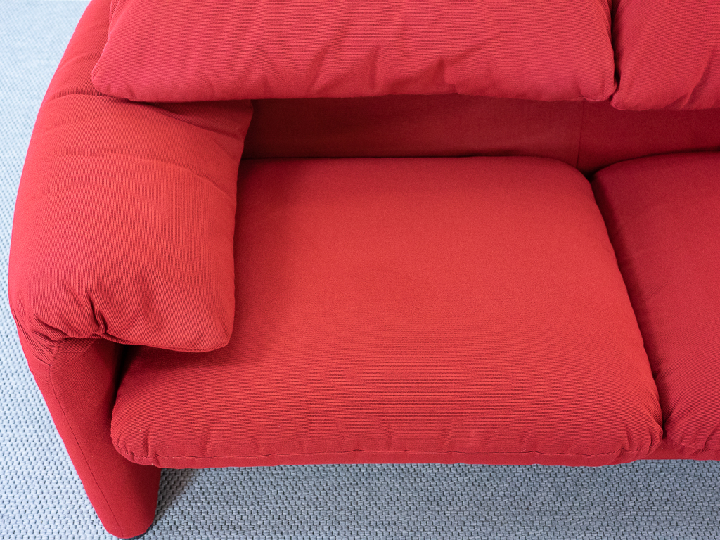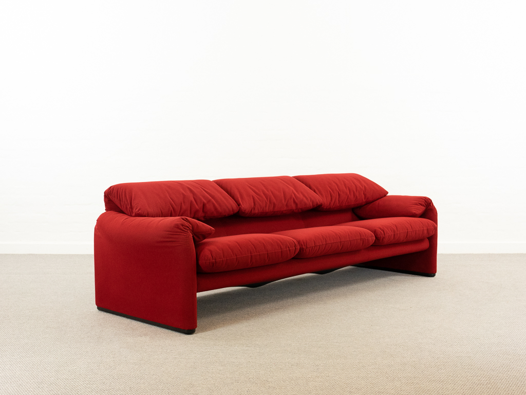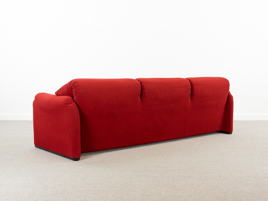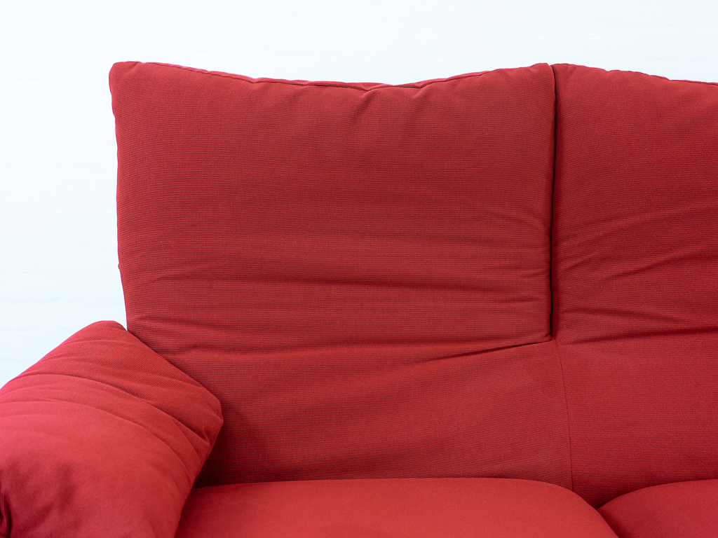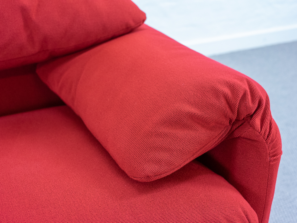 Maralunga 3-Sitzer Sofa von Cassina, entworfen 1973 von Vico Magistretti. Dieses Sofa verfügt über faltbare Rückenlehnen um verschiedene Sitzpositionen zu ermöglichen. Gepolstert im originalem rotem Cassina Soff. Das Sofa ist mit Herstelleretikett gelabelt sowie Cassina Schriftzug im Unterstoff. Höhe der niedrigen Position Rückenlehne 70cm, Höhe der hohen Position Rückenlehne: 100cm. Nichtraucher-Objekt. Guter gebrauchter Zustand.