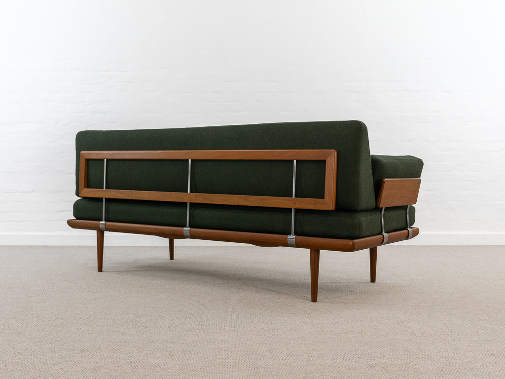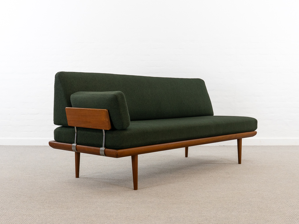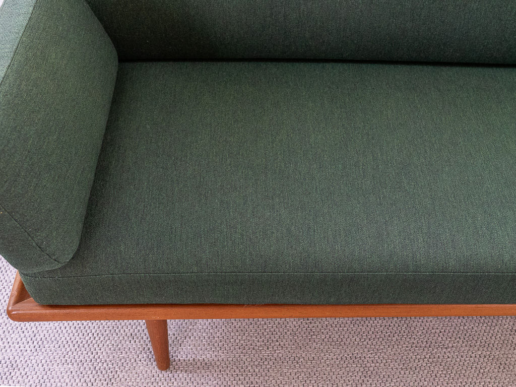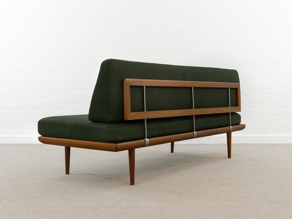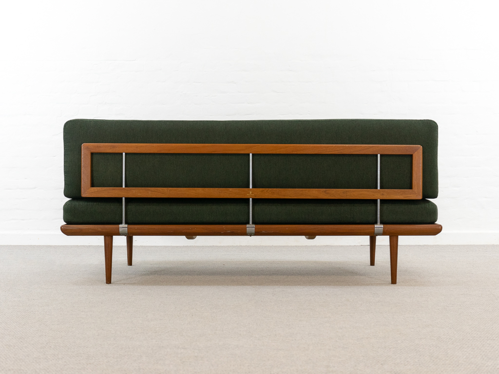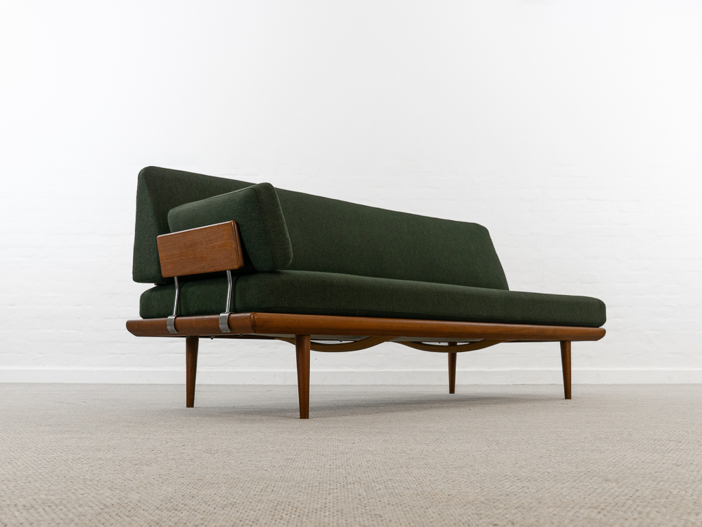 Ikonisches Minerva Sofa des renommierten dänischen Designerduos Peter Hvidt & Orla Mølgaard-Nielsen 1950er Jahre. Hersteller ist France & Daverkosen (später France & Son). Dieses Modell ist ein hervorragendes Beispiel für skandinavisches Mid-Century-Modern-Design: klare Linien, elegante Proportionen und eine perfekte Verbindung aus Funktionalität und Ästhetik.