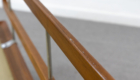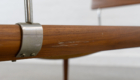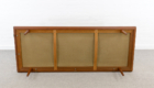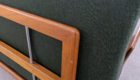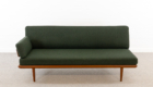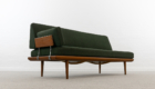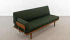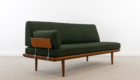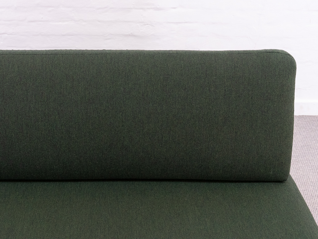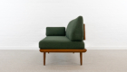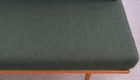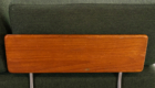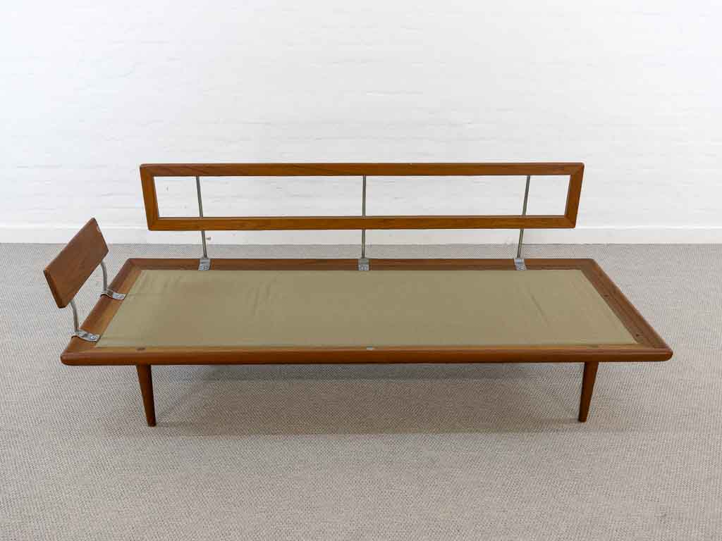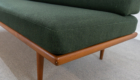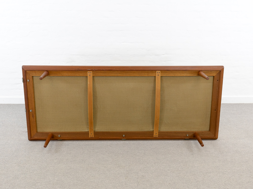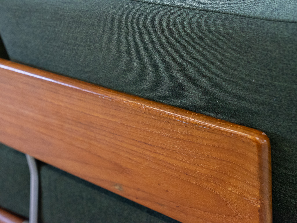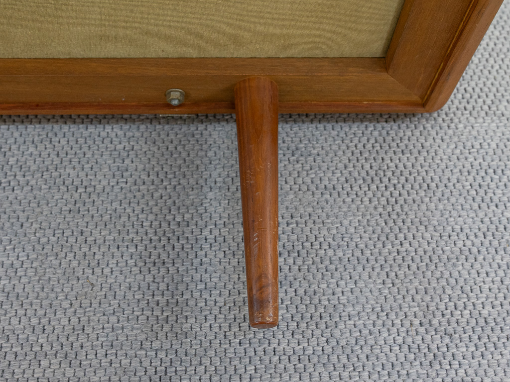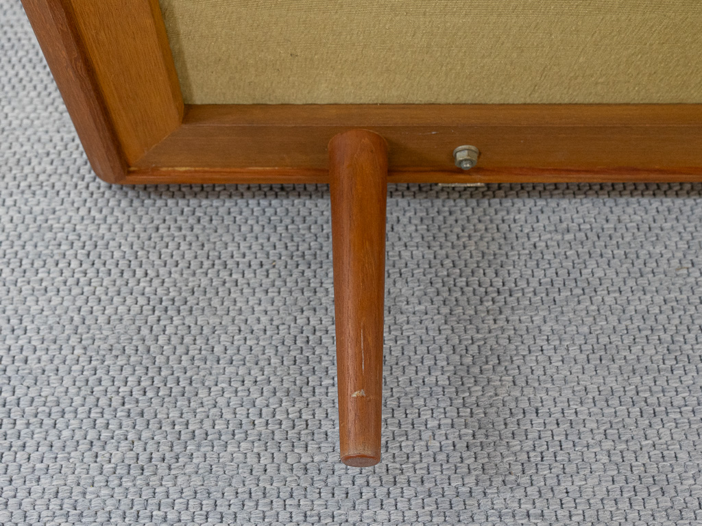 Das Sofa überzeugt durch seinen filigranen, massivhölzernen Teakrahmen mit konisch zulaufenden Beinen sowie die charakteristische seitliche Armlehne mit gepolstertem Kissen. Die reduzierte Formensprache macht das Möbel sowohl als Sofa als auch als Daybed vielseitig einsetzbar – ideal für Wohn-, Arbeits- oder Empfangsbereiche.