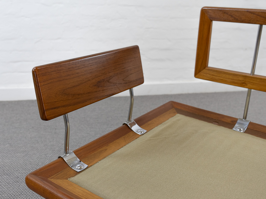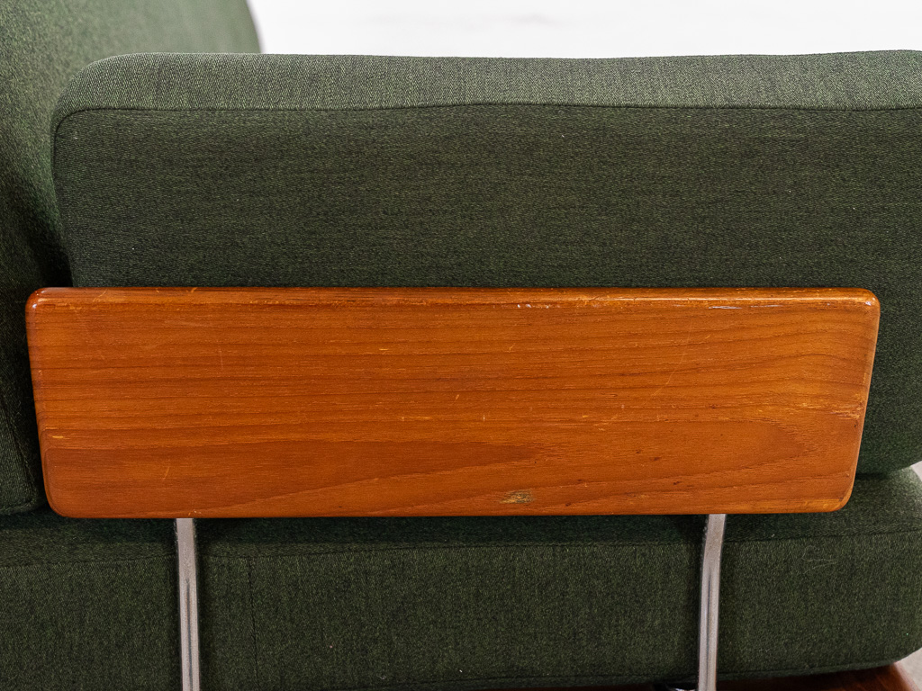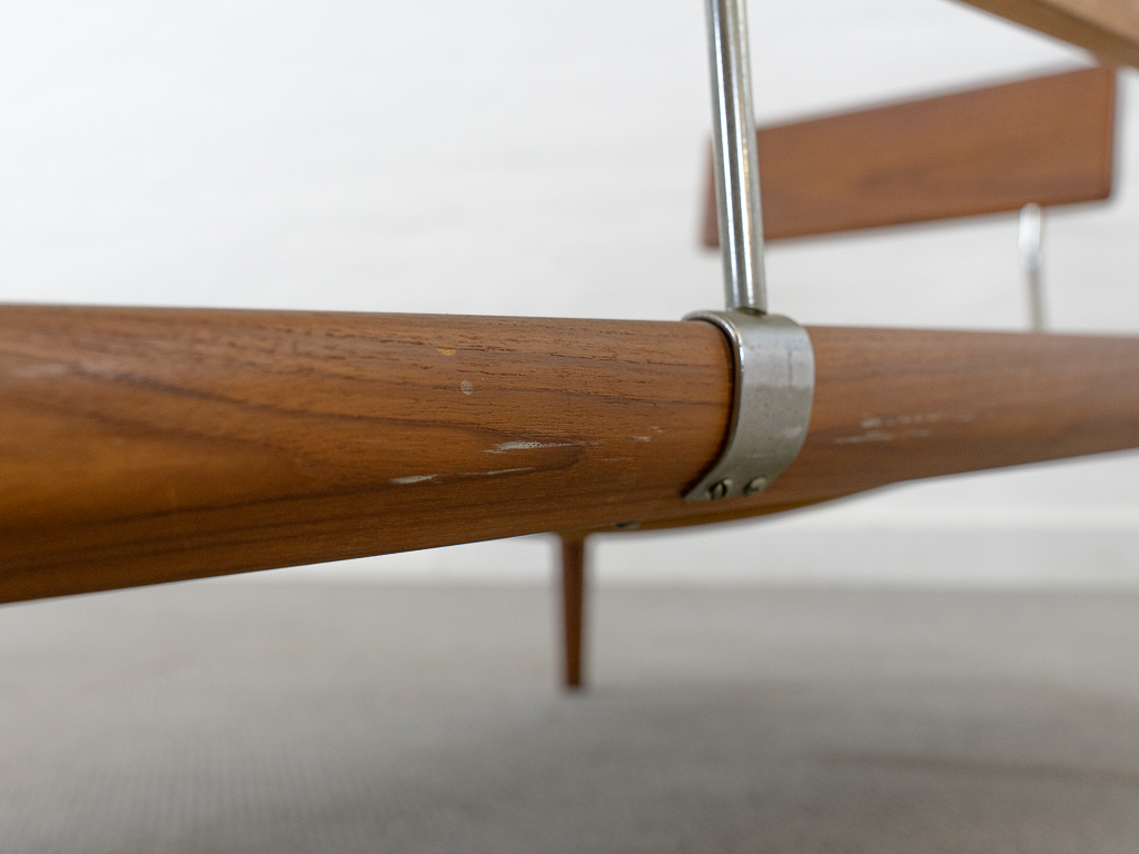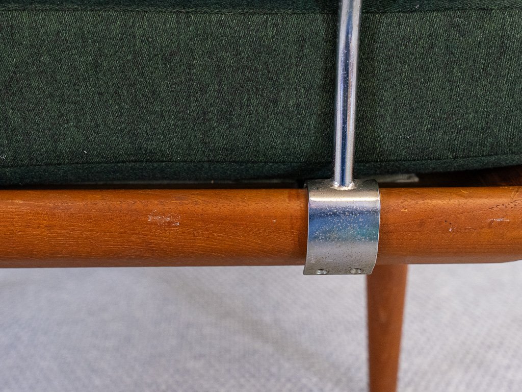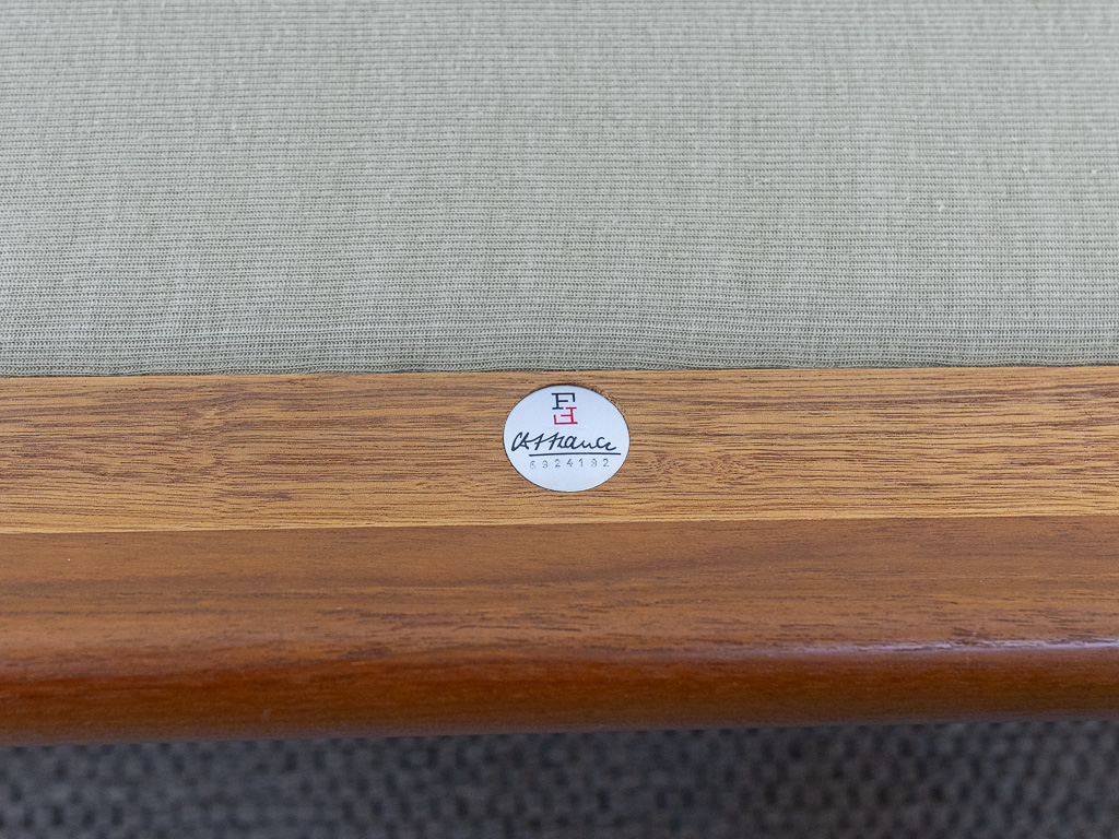 Guter bis sehr guter Vintage-Zustand. Das Teakholz zeigt eine schöne, gleichmäßige Patina mit altersbedingten, leichten Gebrauchsspuren. Keine strukturellen Schäden erkennbar. Der Stoff befindet sich in einem gepflegten Zustand. Leichte alters- und nutzungsbedingte Spuren, keine Flecken. Die Polsterung ist fest und der Sitzkomfort vernünftig angesichts des Alters. Nichtraucher-Objekt. Ideal für Sammler und Liebhaber originaler Mid-Century-Designklassiker.