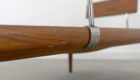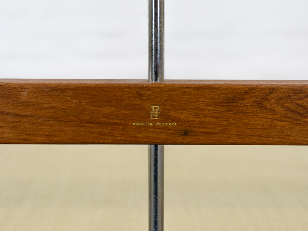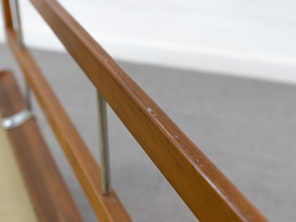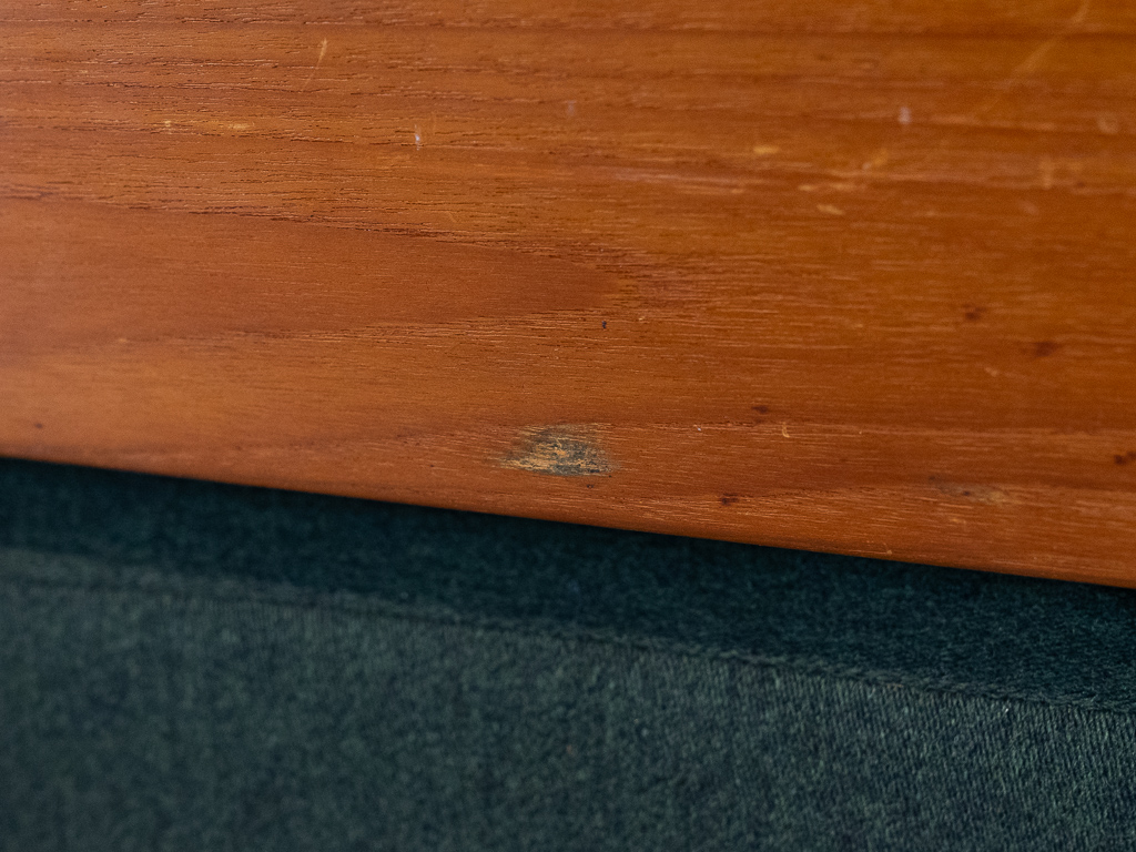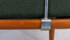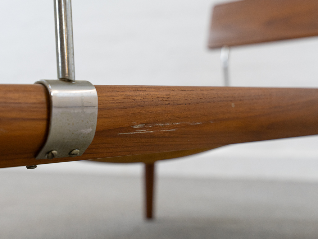 Guter bis sehr guter Vintage-Zustand. Das Teakholz zeigt eine schöne, gleichmäßige Patina mit altersbedingten, leichten Gebrauchsspuren. Keine strukturellen Schäden erkennbar. Der Stoff befindet sich in einem gepflegten Zustand. Leichte alters- und nutzungsbedingte Spuren, keine Flecken. Die Polsterung ist fest und der Sitzkomfort vernünftig angesichts des Alters. Nichtraucher-Objekt. Ideal für Sammler und Liebhaber originaler Mid-Century-Designklassiker.