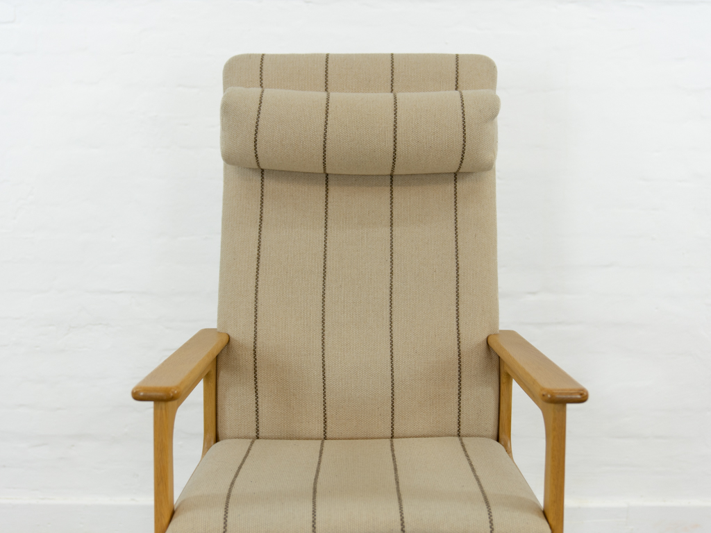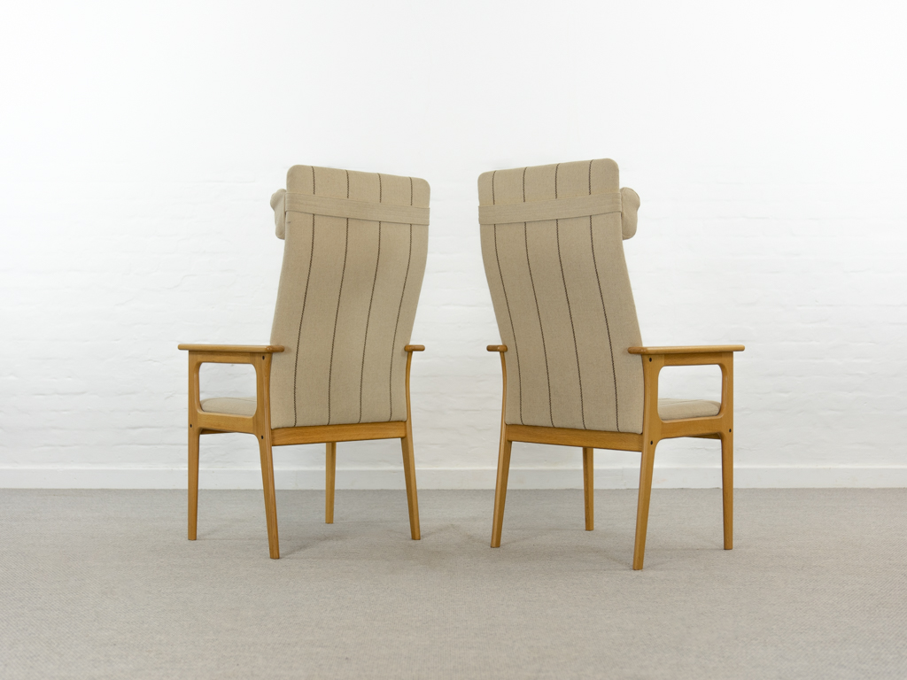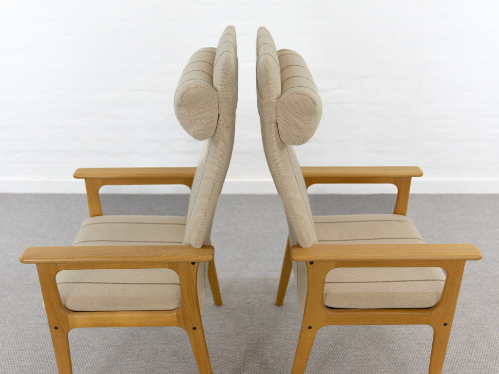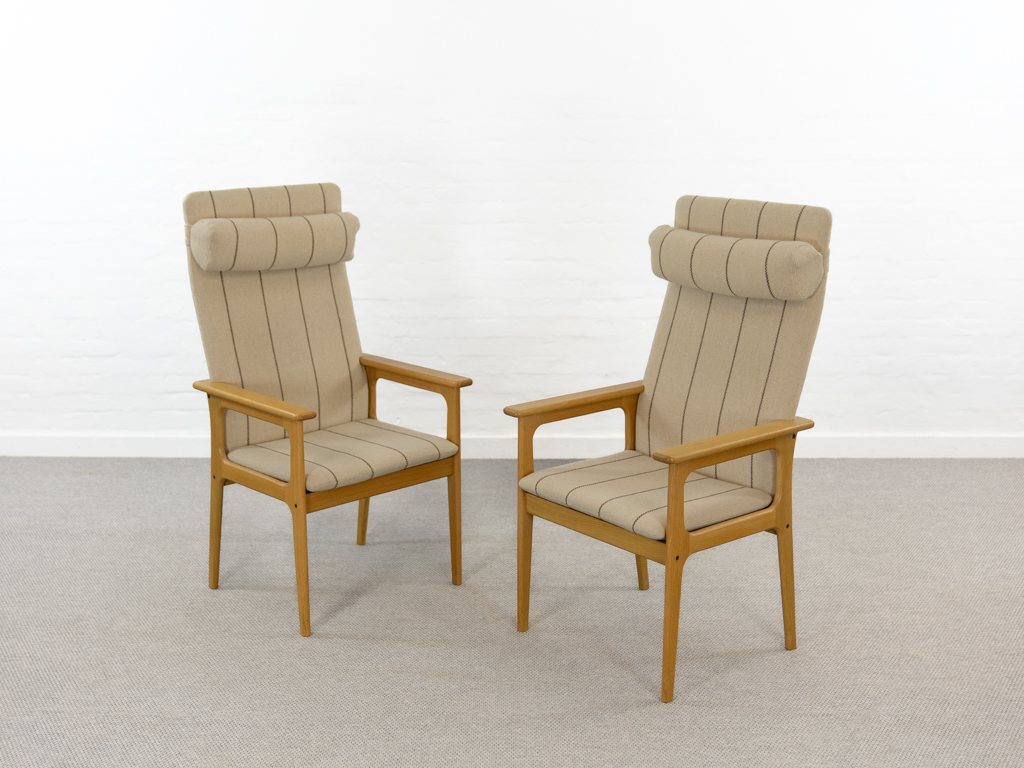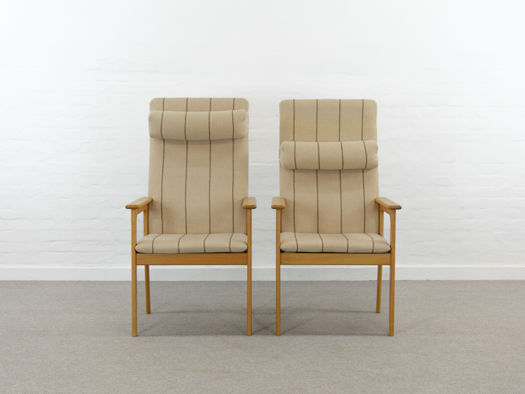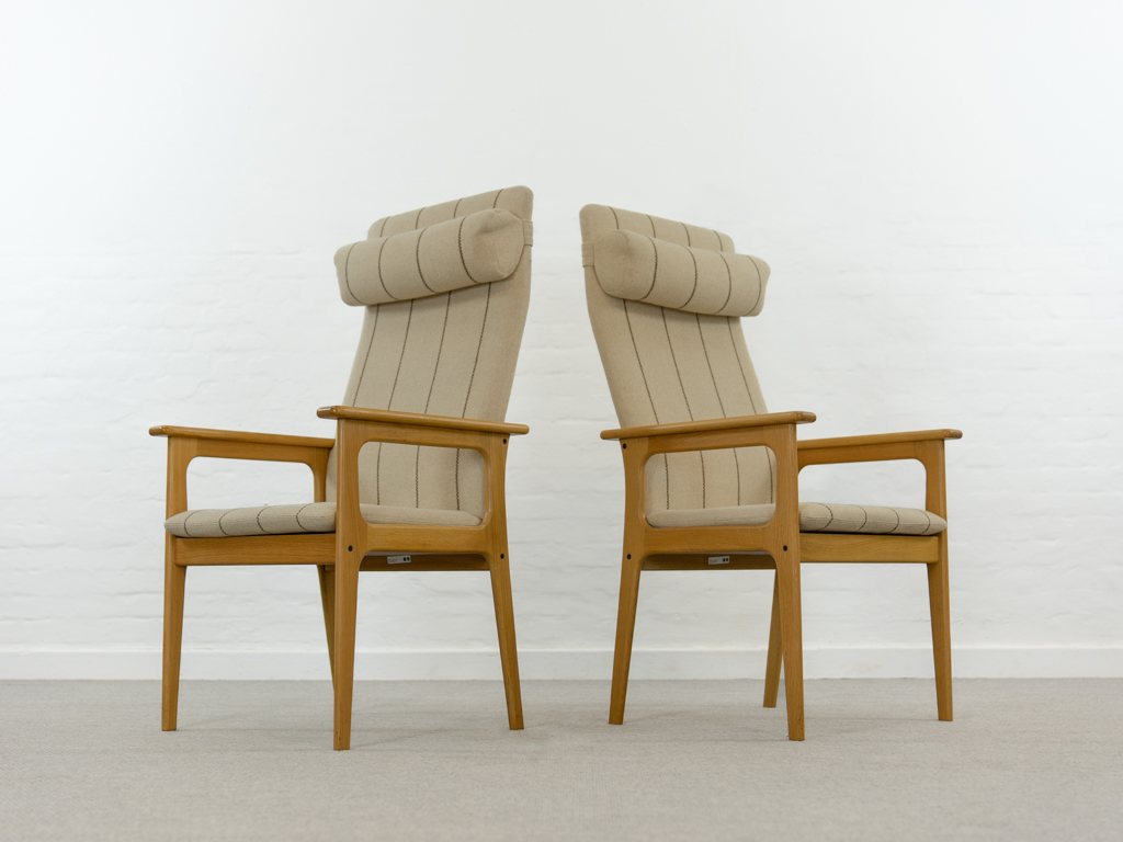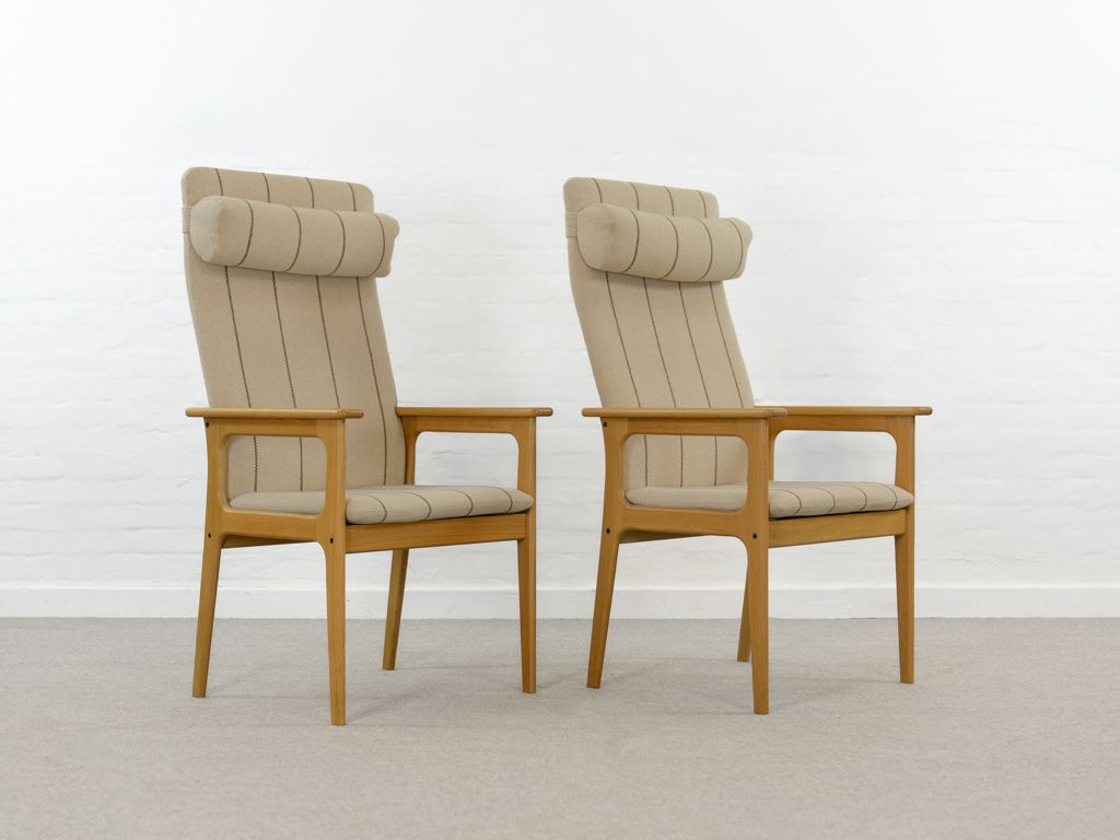 Vintage 2er Set Hochlehner Stühle von Domus Danica, Dänemark 70er. Der Entwurf wird Erik Buck zugeschrieben. Ausgeführt in Eichenholz, original bezogen mit einem gestreiftem Wollstoff. Höhenverstellbare Kopf-/ Nackenstütze. Guter gebrauchter Zustand. Unterseitig mit Herstelleretikett versehen.