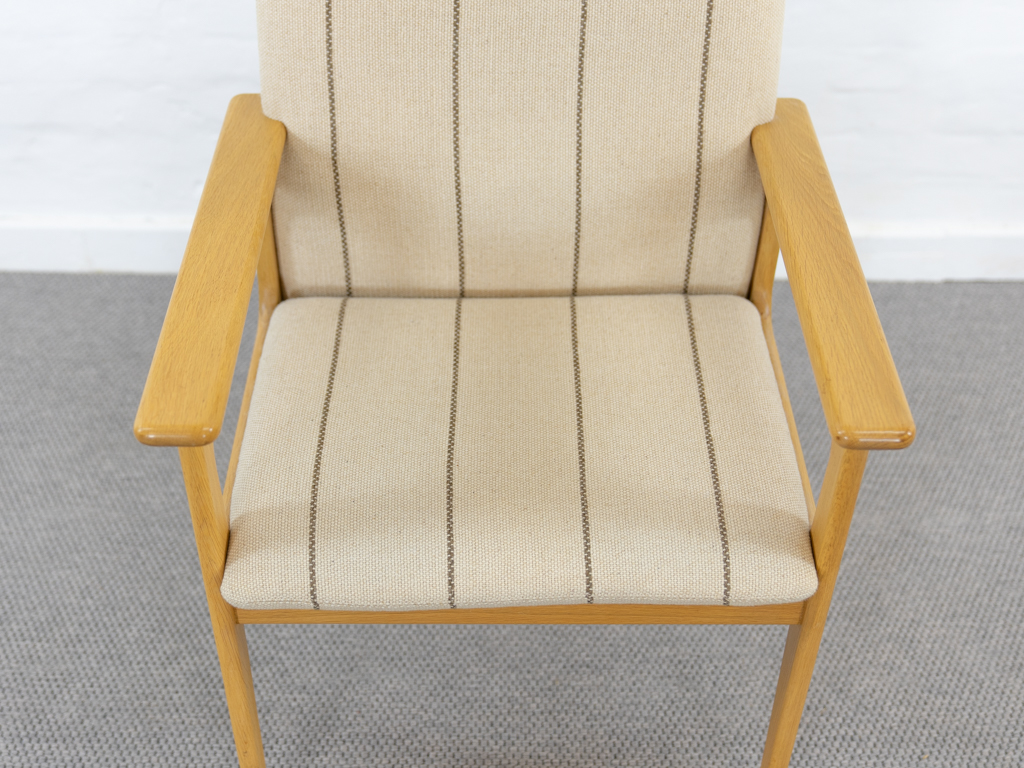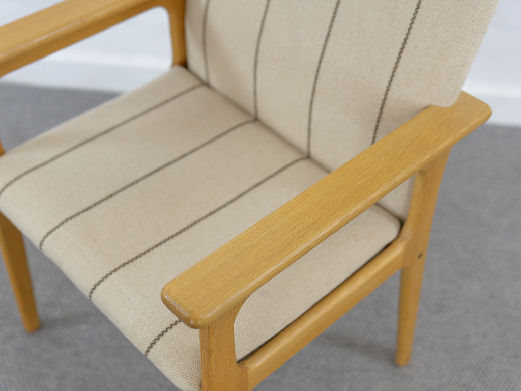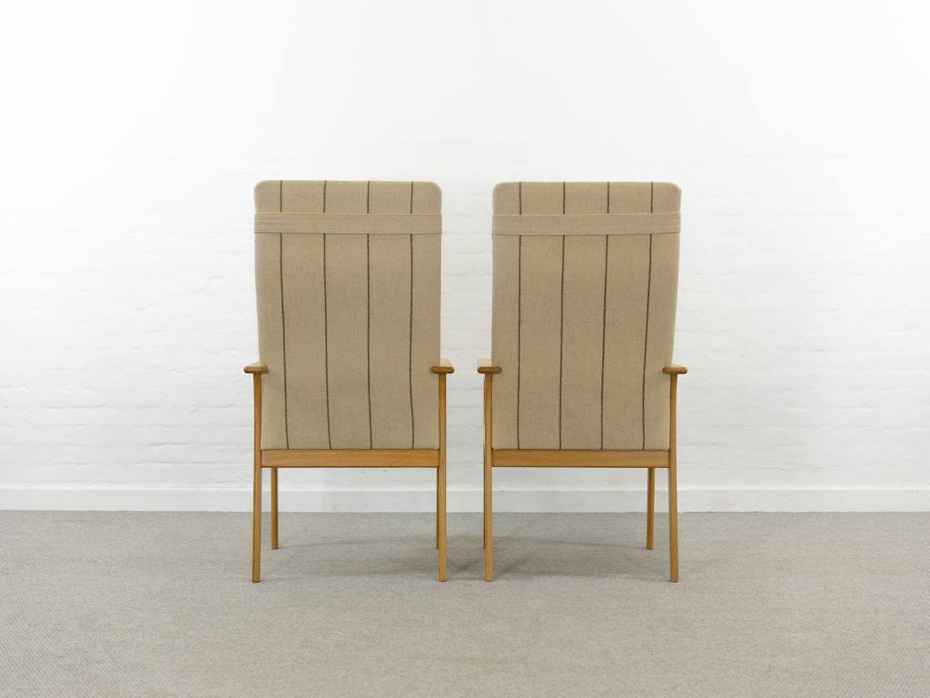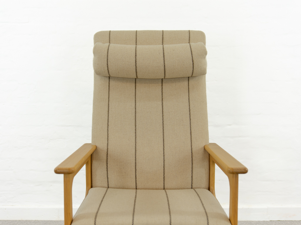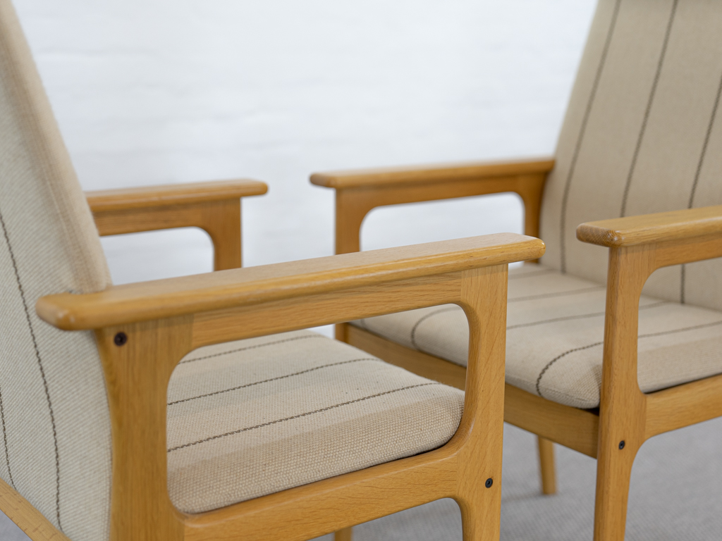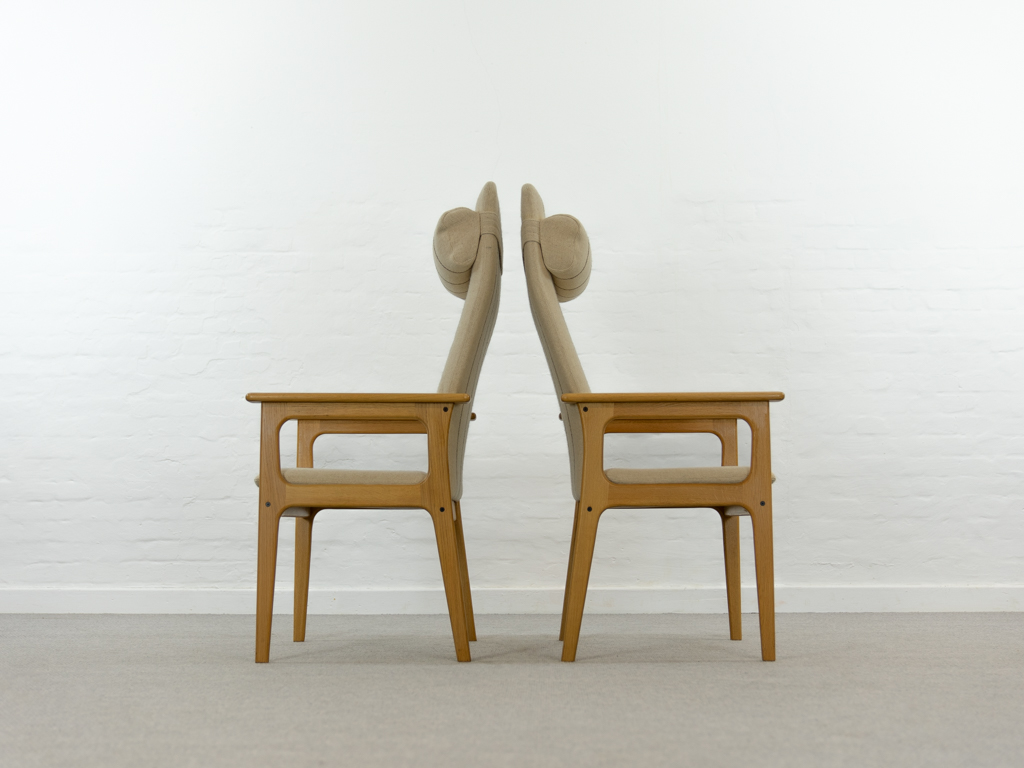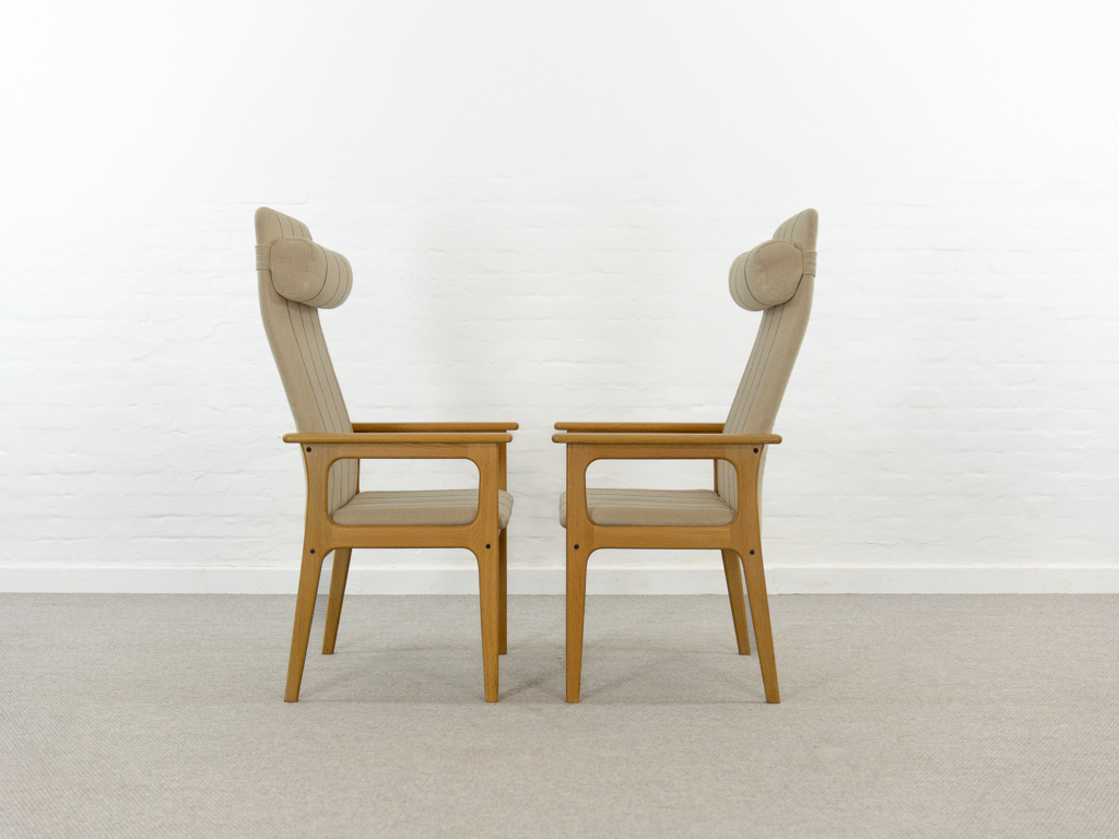 Vintage 2er Set Hochlehner Stühle von Domus Danica, Dänemark 70er. Der Entwurf wird Erik Buck zugeschrieben. Ausgeführt in Eichenholz, original bezogen mit einem gestreiftem Wollstoff. Höhenverstellbare Kopf-/ Nackenstütze. Guter gebrauchter Zustand. Unterseitig mit Herstelleretikett versehen.