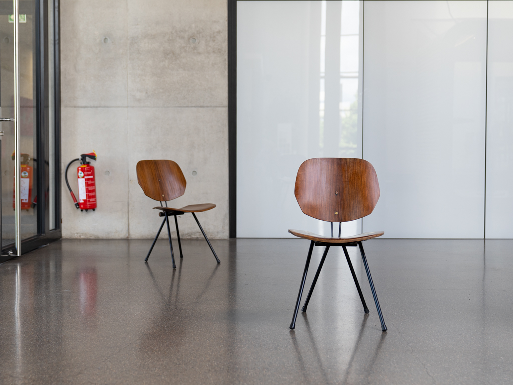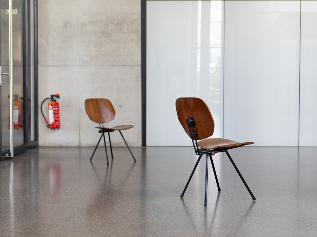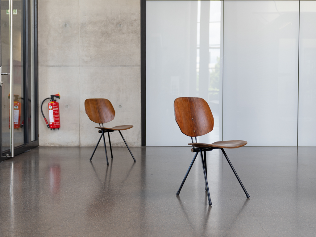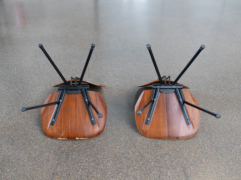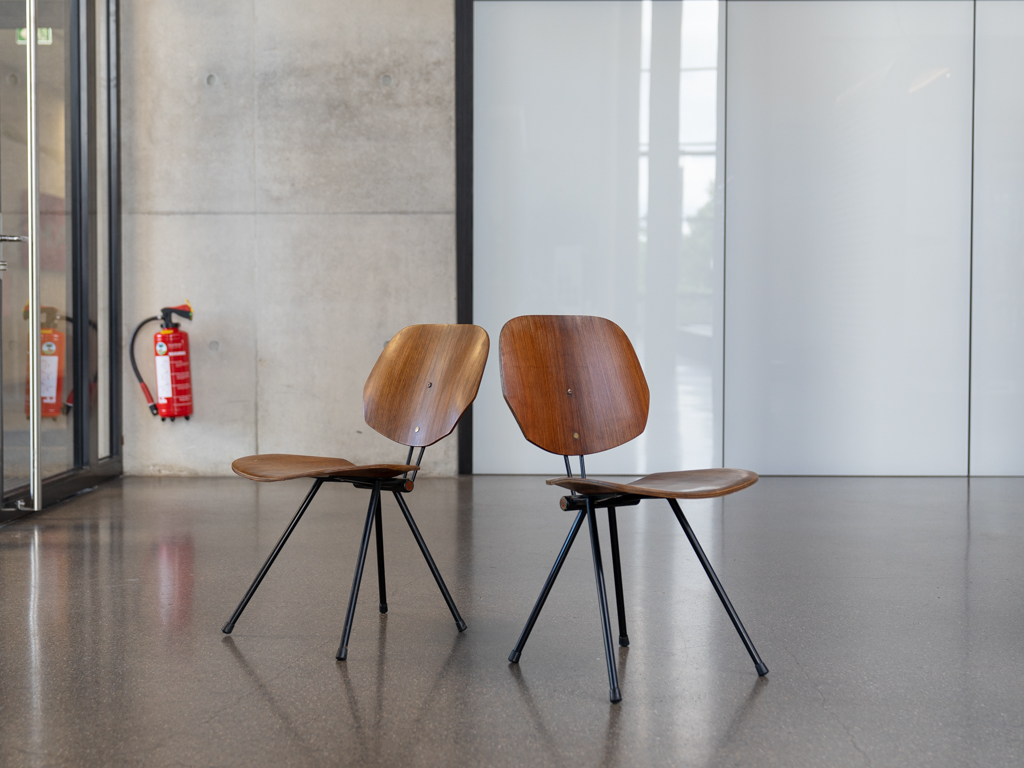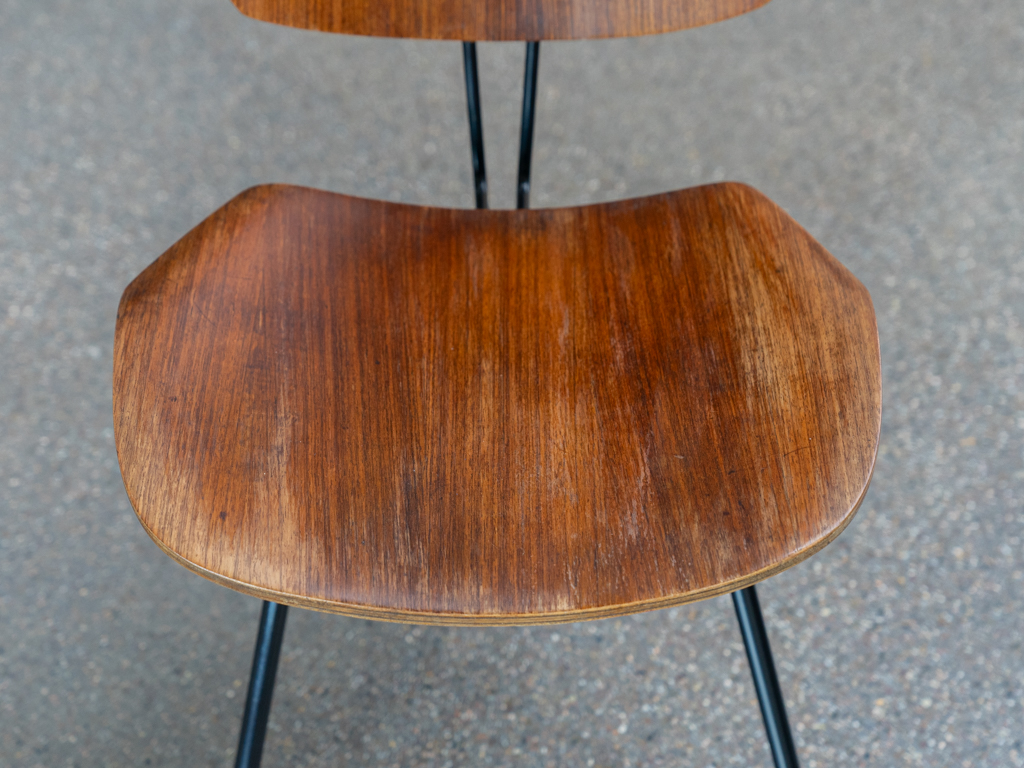 Set (2) Faltstühle, Modell S88. 1956 entworfen von Osvaldo Borsani für Tecno, Italien. Dieser Mid Century Stühle verfügen über einen schwarzen Stahlrohrrahmen mit mehrteiligem Scharnier/Gelenk. Die Beine drehen sich um einen zentralen Punkt, und die Rückenlehne lassen sich mit einem unterseitigem Druckblech entriegeln. Abmessung zusammengefaltet: 50cm x 46cm x 17cm. Sitz und Rückenlehne sind aus Schichtholz mit Teakfurnier gefertigt. Das Gestell ist aus geschwärztem Stahl. Unterseitig mit Tecno Etikett versehen und mit dem klassischem Tecno „T“ an der Seite. Gebrauchter vintage Zustand. Die Mechanik funktioniert. Furnier mit angenehmer Patina, ein Stuhl weist Flecken auf der Sitzfläche auf. Unterseitig bei einem Stuhl Furnierabplatzer. Teilweise unoriginale Verschraubung. Bitte sehen sie sich die Fotos an. Die Fotos sind mit freundlicher Unterstützung der Solarlux GmbH entstanden.