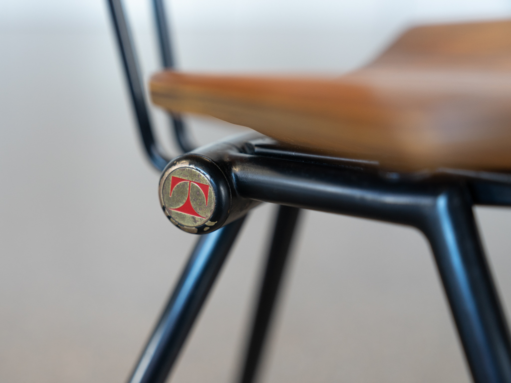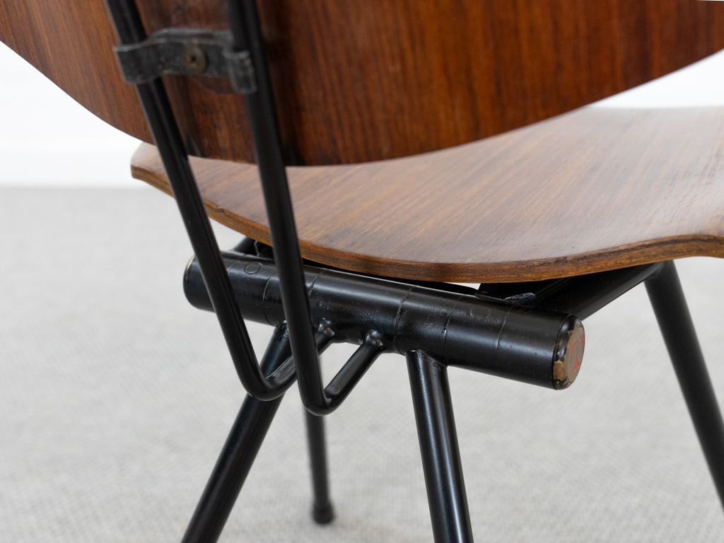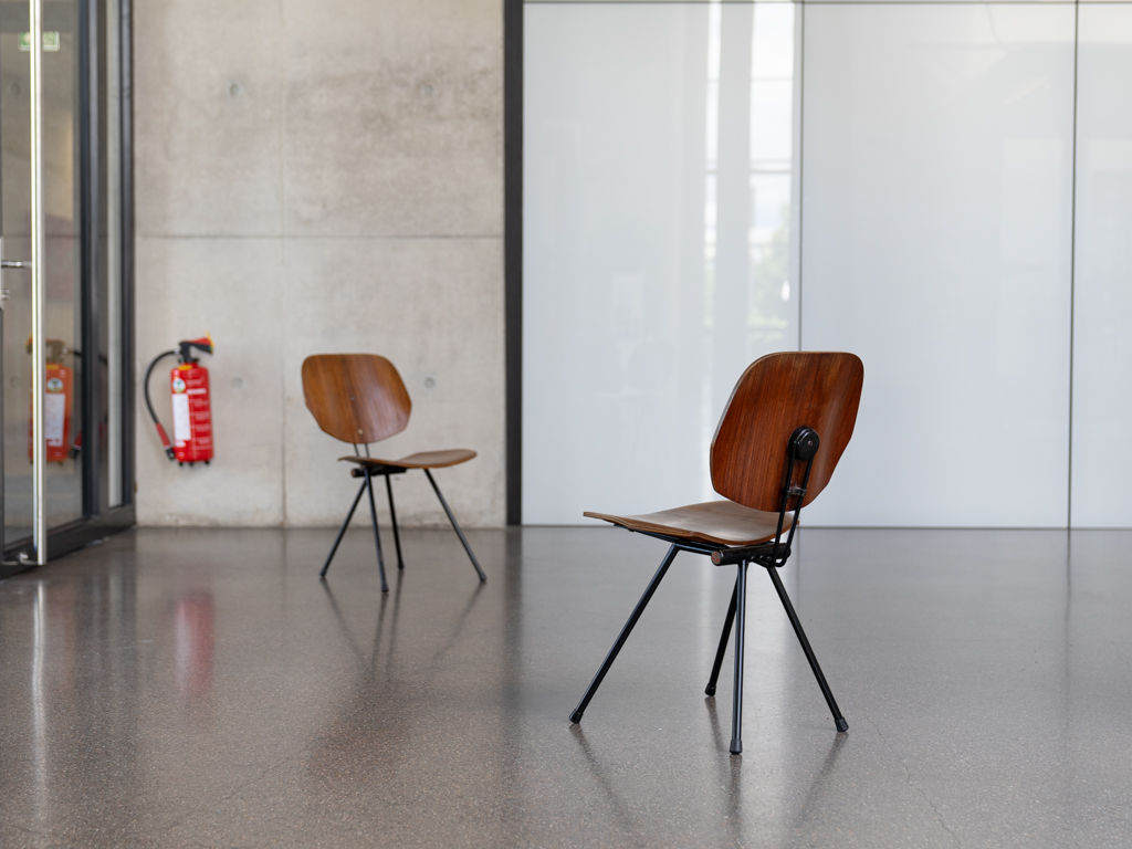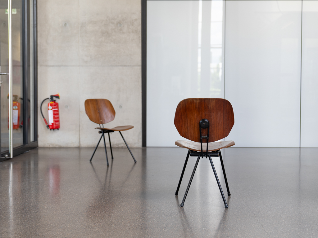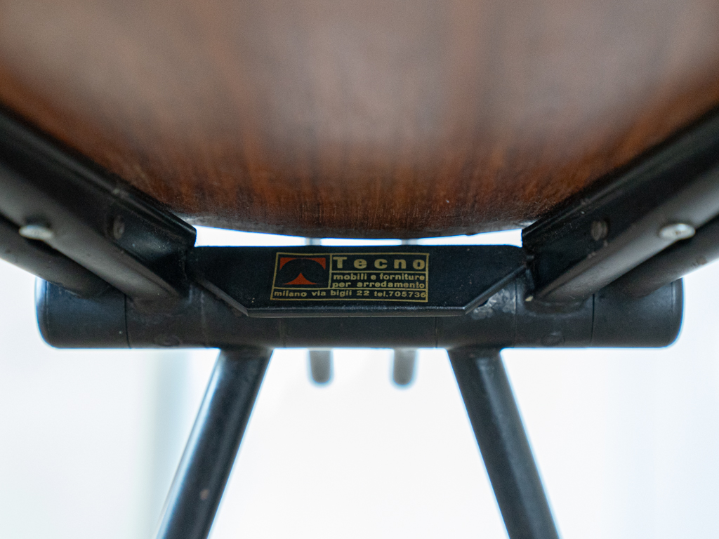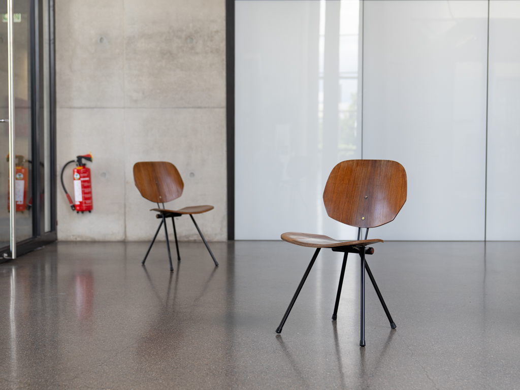 Set (2) Faltstühle, Modell S88. 1956 entworfen von Osvaldo Borsani für Tecno, Italien. Dieser Mid Century Stühle verfügen über einen schwarzen Stahlrohrrahmen mit mehrteiligem Scharnier/Gelenk. Die Beine drehen sich um einen zentralen Punkt, und die Rückenlehne lassen sich mit einem unterseitigem Druckblech entriegeln. Abmessung zusammengefaltet: 50cm x 46cm x 17cm. Sitz und Rückenlehne sind aus Schichtholz mit Teakfurnier gefertigt. Das Gestell ist aus geschwärztem Stahl. Unterseitig mit Tecno Etikett versehen und mit dem klassischem Tecno „T“ an der Seite. Gebrauchter vintage Zustand. Die Mechanik funktioniert. Furnier mit angenehmer Patina, ein Stuhl weist Flecken auf der Sitzfläche auf. Unterseitig bei einem Stuhl Furnierabplatzer. Teilweise unoriginale Verschraubung. Bitte sehen sie sich die Fotos an. Die Fotos sind mit freundlicher Unterstützung der Solarlux GmbH entstanden.