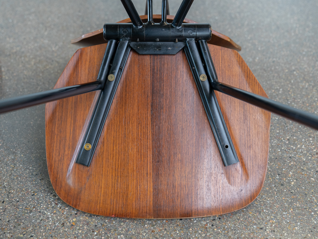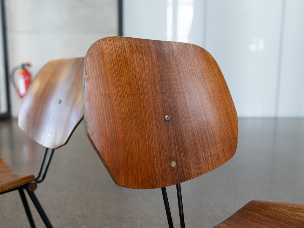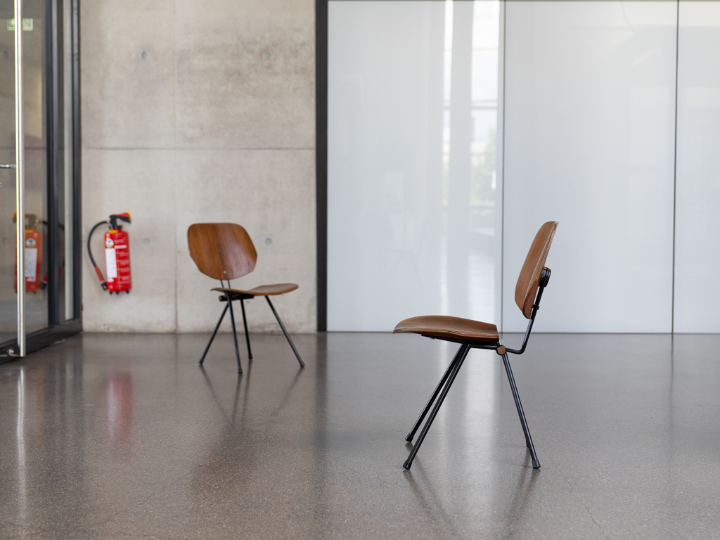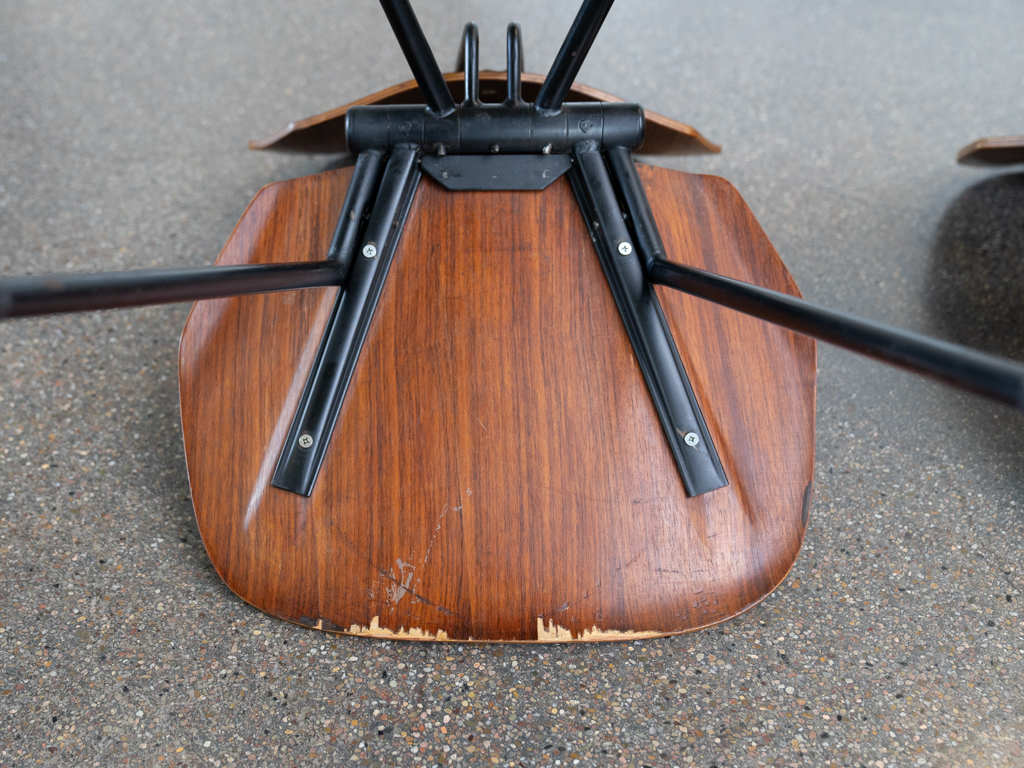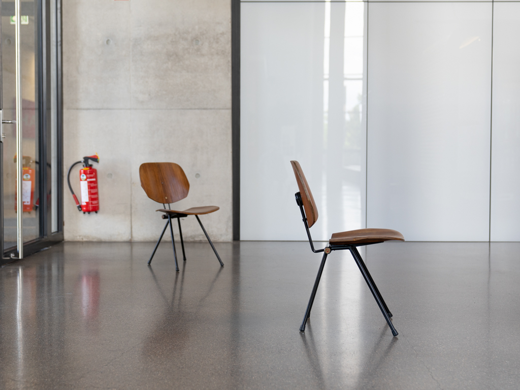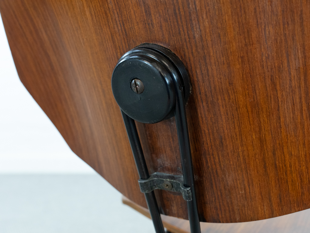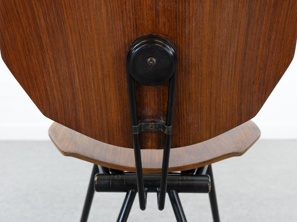 Set (2) Faltstühle, Modell S88. 1956 entworfen von Osvaldo Borsani für Tecno, Italien. Dieser Mid Century Stühle verfügen über einen schwarzen Stahlrohrrahmen mit mehrteiligem Scharnier/Gelenk. Die Beine drehen sich um einen zentralen Punkt, und die Rückenlehne lassen sich mit einem unterseitigem Druckblech entriegeln. Abmessung zusammengefaltet: 50cm x 46cm x 17cm. Sitz und Rückenlehne sind aus Schichtholz mit Teakfurnier gefertigt. Das Gestell ist aus geschwärztem Stahl. Unterseitig mit Tecno Etikett versehen und mit dem klassischem Tecno „T“ an der Seite. Gebrauchter vintage Zustand. Die Mechanik funktioniert. Furnier mit angenehmer Patina, ein Stuhl weist Flecken auf der Sitzfläche auf. Unterseitig bei einem Stuhl Furnierabplatzer. Teilweise unoriginale Verschraubung. Bitte sehen sie sich die Fotos an. Die Fotos sind mit freundlicher Unterstützung der Solarlux GmbH entstanden.
