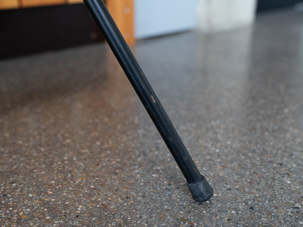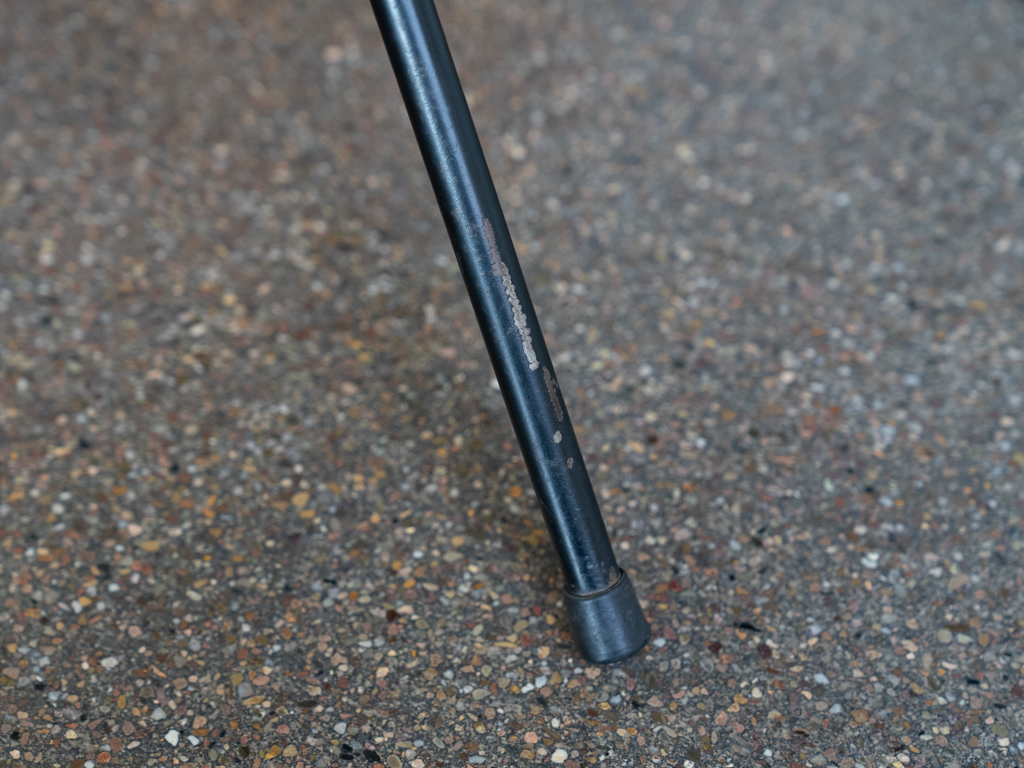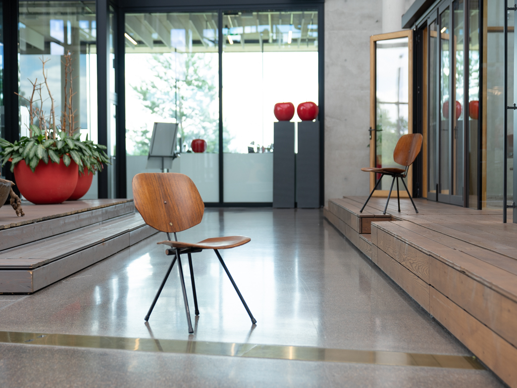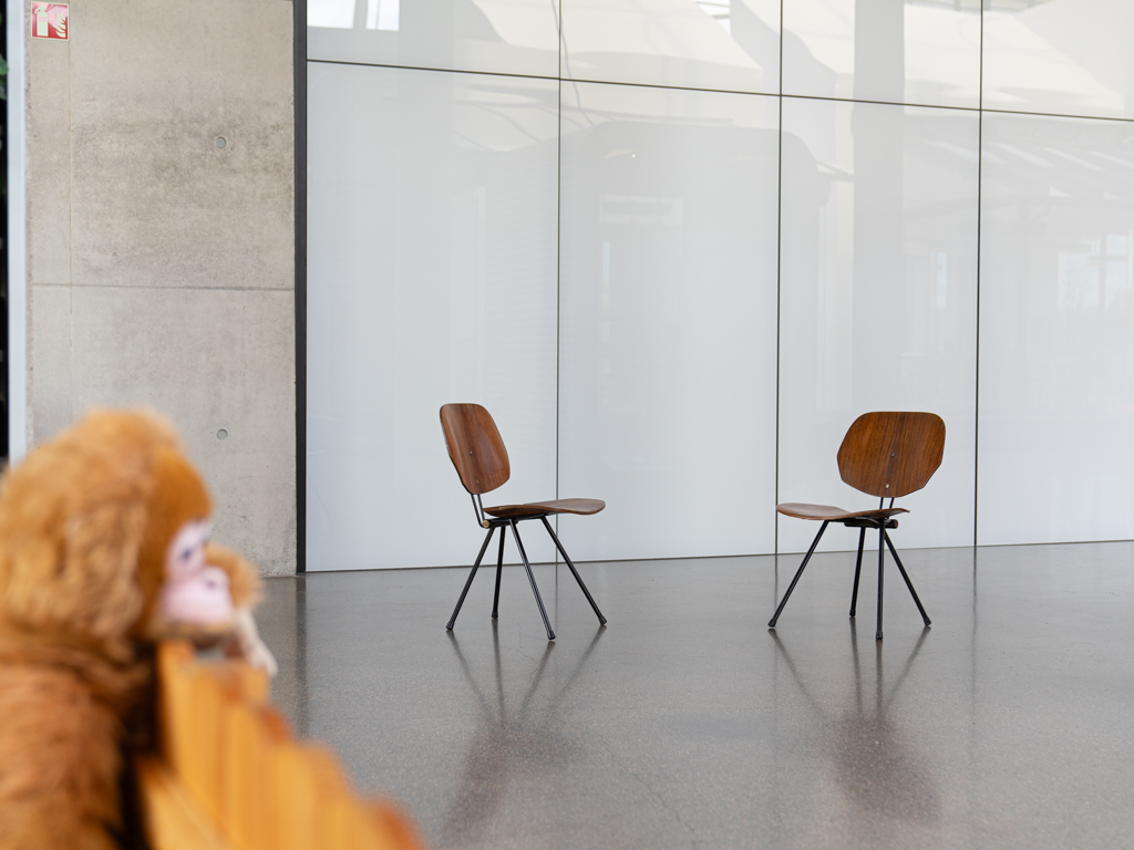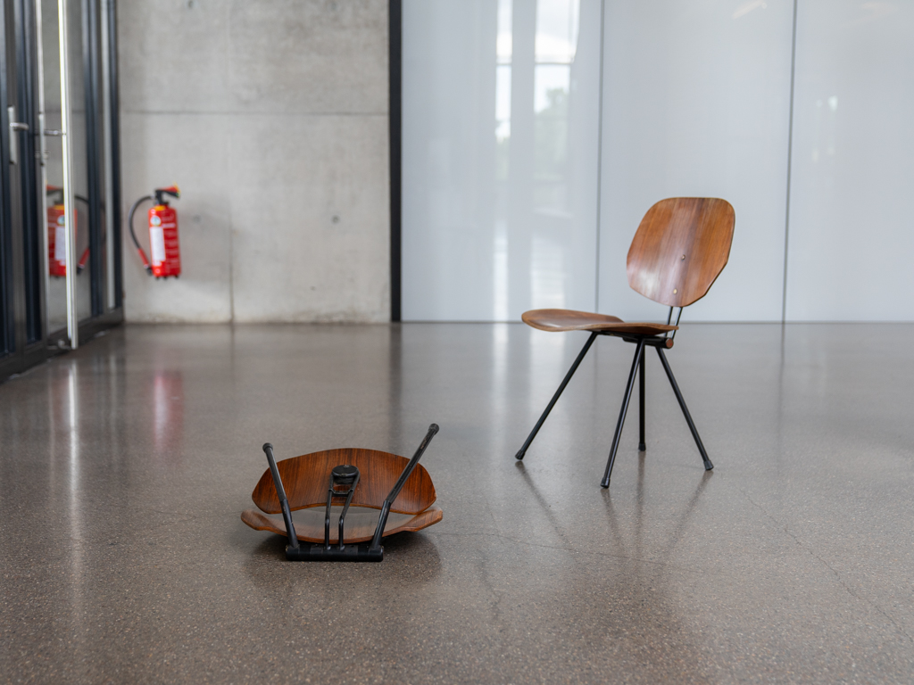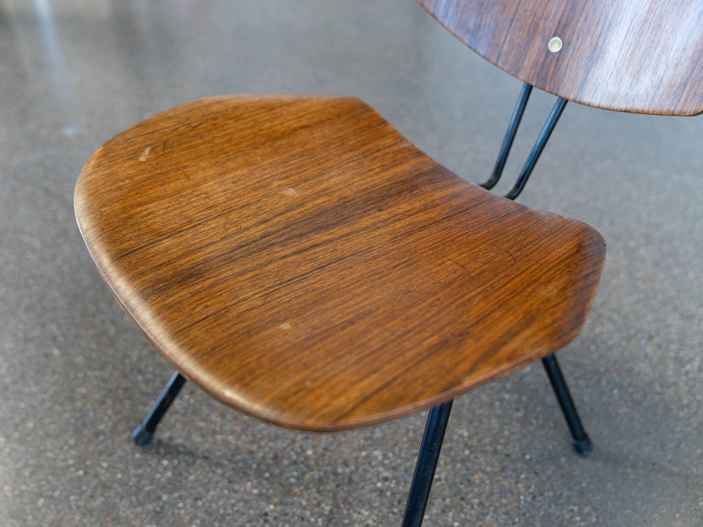 Set (2) Faltstühle, Modell S88. 1956 entworfen von Osvaldo Borsani für Tecno, Italien. Dieser Mid Century Stühle verfügen über einen schwarzen Stahlrohrrahmen mit mehrteiligem Scharnier/Gelenk. Die Beine drehen sich um einen zentralen Punkt, und die Rückenlehne lassen sich mit einem unterseitigem Druckblech entriegeln. Abmessung zusammengefaltet: 50cm x 46cm x 17cm. Sitz und Rückenlehne sind aus Schichtholz mit Teakfurnier gefertigt. Das Gestell ist aus geschwärztem Stahl. Unterseitig mit Tecno Etikett versehen und mit dem klassischem Tecno „T“ an der Seite. Gebrauchter vintage Zustand. Die Mechanik funktioniert. Furnier mit angenehmer Patina, ein Stuhl weist Flecken auf der Sitzfläche auf. Unterseitig bei einem Stuhl Furnierabplatzer. Teilweise unoriginale Verschraubung. Bitte sehen sie sich die Fotos an. Die Fotos sind mit freundlicher Unterstützung der Solarlux GmbH entstanden.