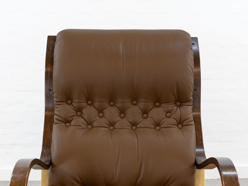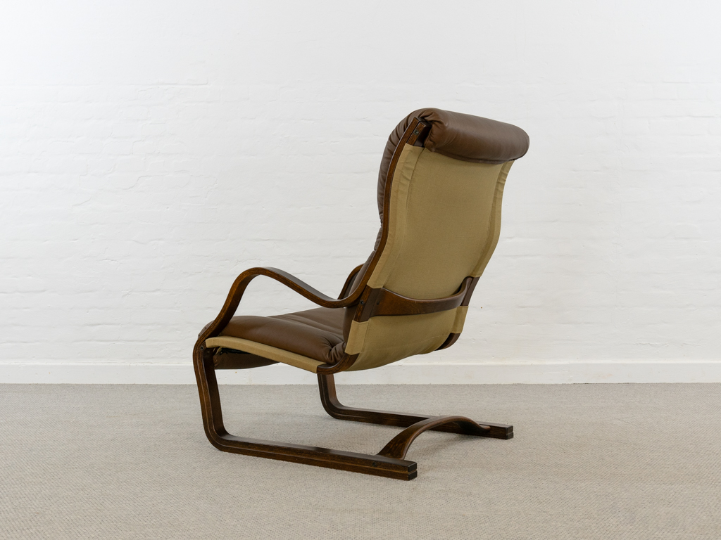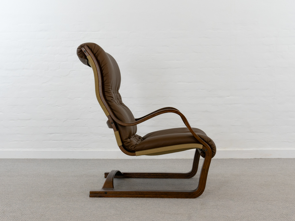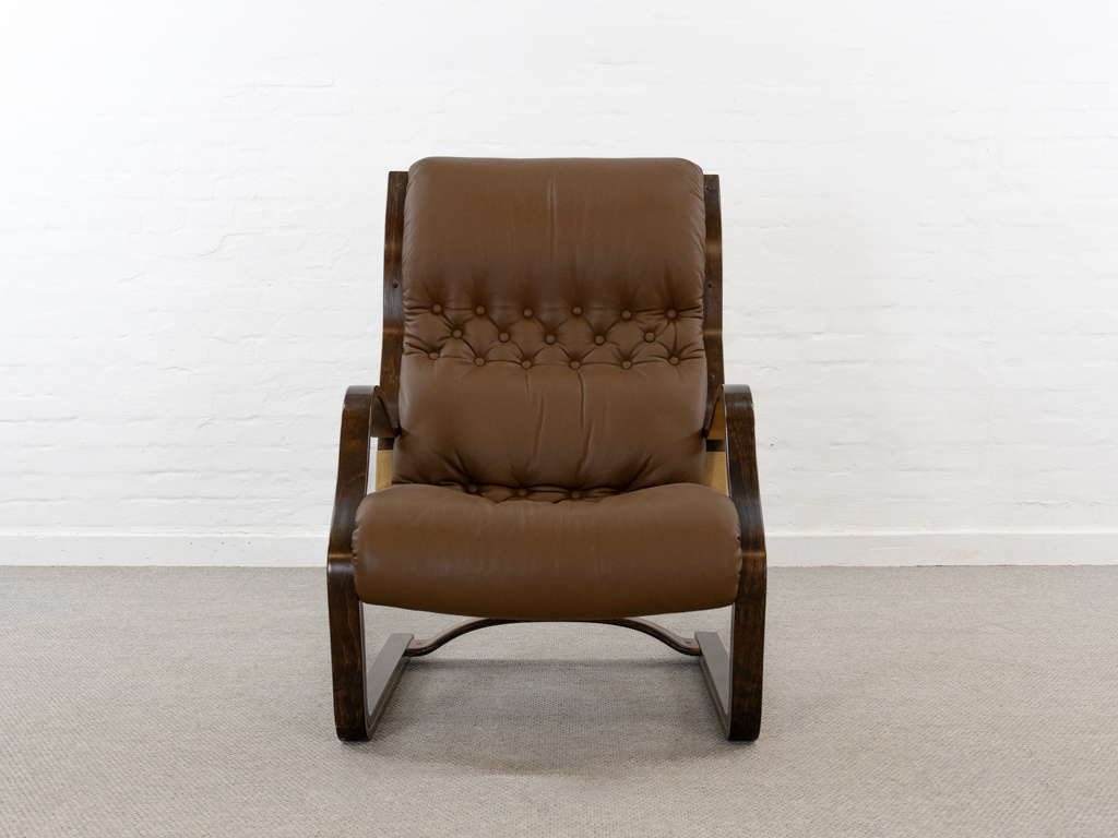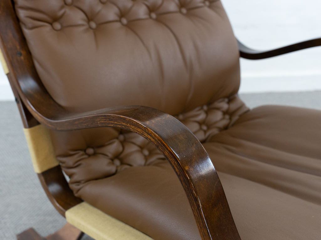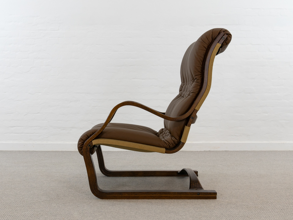 Koivutaru Freischwinger Sessel. Designed 1977 von Esko Pajamies für Asko, Finnland. Bezogen in originalem braunem geknöpftem Leder. Der perfekte Kaminsessel. Tolle Bugholzform der Armlehnen und des Gestells. Gebeiztes Birkenholz – Finnisch: Koivua. Der Sessel diente Ikea als Inspiration für den bekannten Poäng Entwurf. Sehr guter gebrauchter Zustand. Nichraucherobjekt. Maße: H. 100cm, B. 67.5cm, T. 90cm.