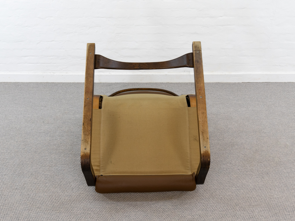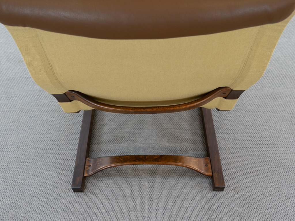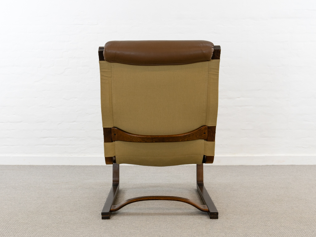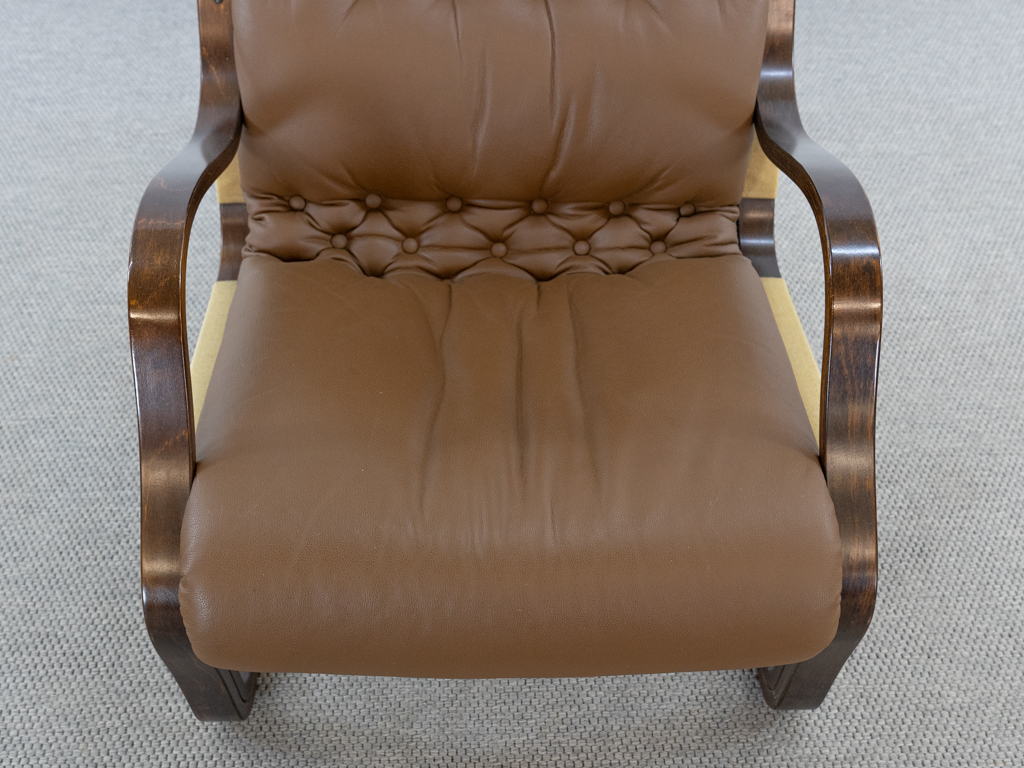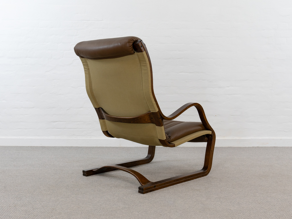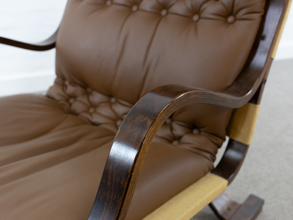 Koivutaru Freischwinger Sessel. Designed 1977 von Esko Pajamies für Asko, Finnland. Bezogen in originalem braunem geknöpftem Leder. Der perfekte Kaminsessel. Tolle Bugholzform der Armlehnen und des Gestells. Gebeiztes Birkenholz – Finnisch: Koivua. Der Sessel diente Ikea als Inspiration für den bekannten Poäng Entwurf. Sehr guter gebrauchter Zustand. Nichraucherobjekt. Maße: H. 100cm, B. 67.5cm, T. 90cm.