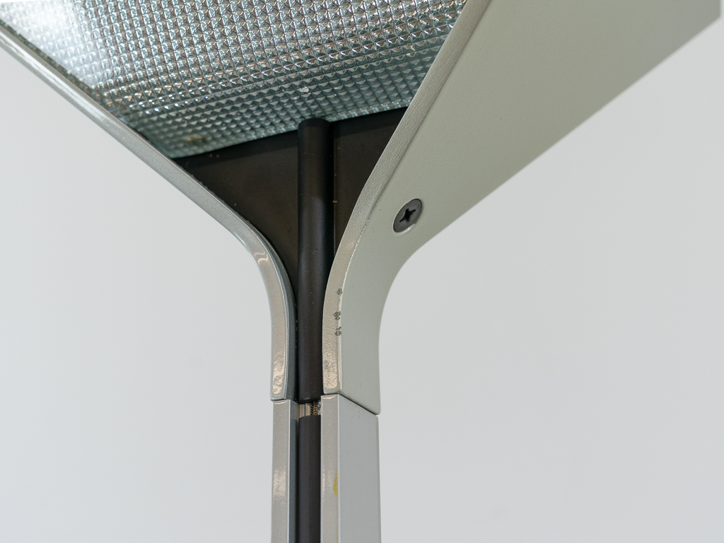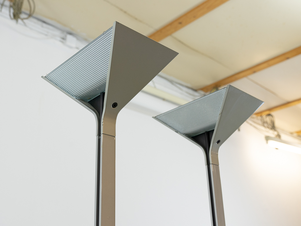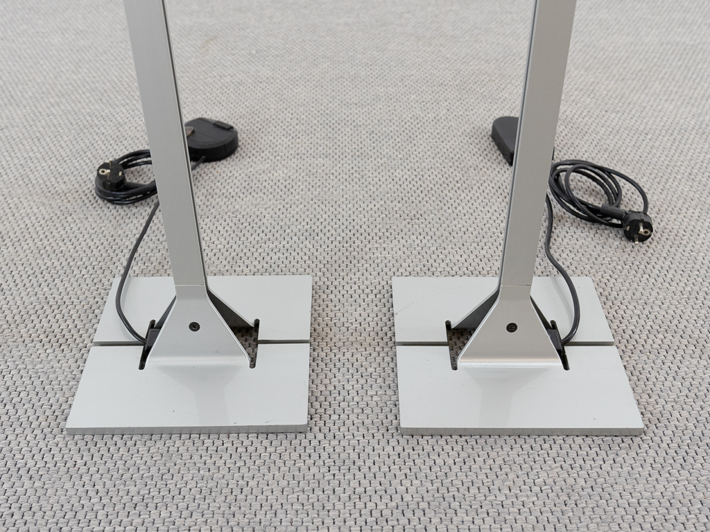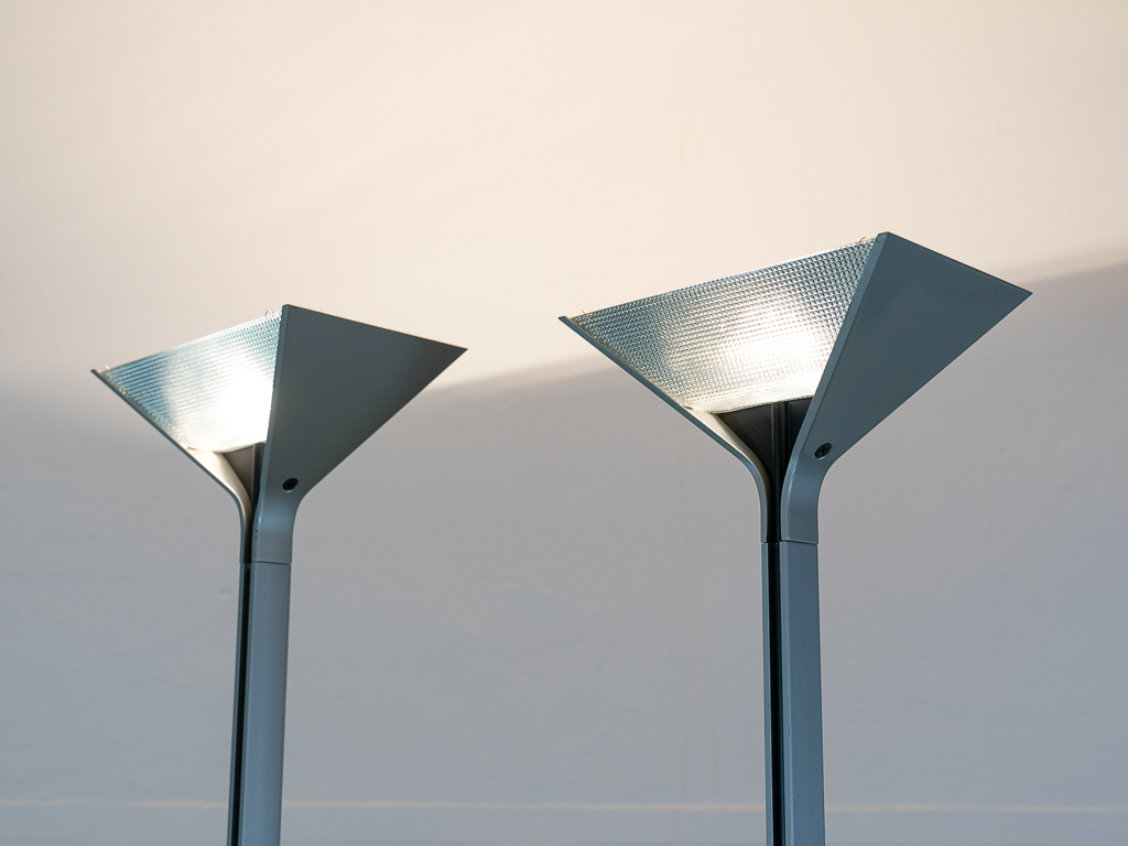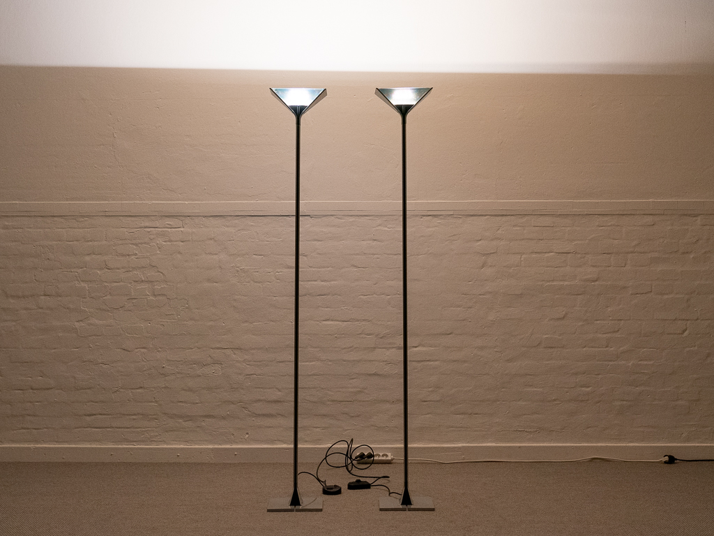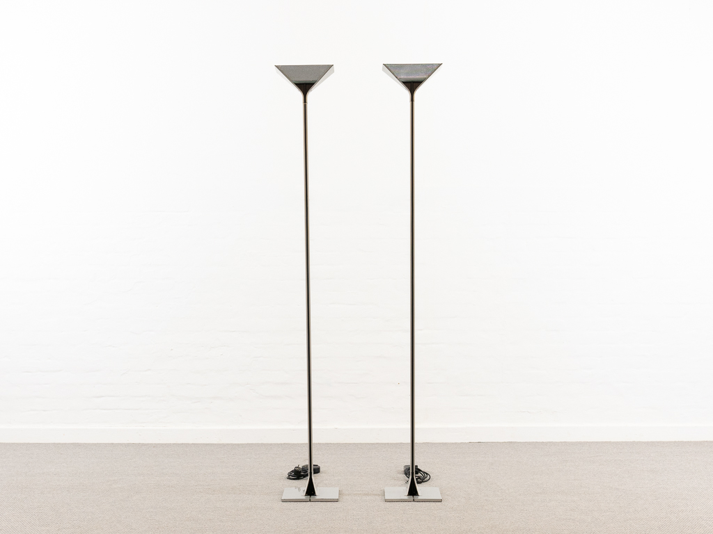 Set (2) Papillona Stehleuchten-Deckenfluter Modell 750 in silber. Entworfen 1975. Aluminium-/Metallkonstuktion mit eingesetzten prismatischen Gläsern. Beide Lampen am Fusschalter dimmbar. Maße: Fuß 26x26cm, Höhe 1,92m. Guter vintage Zustand, Alters-und Gebrauchsspuren vorhanden. Flos Logo im Fuss und im Schirm. Beide Lampen wurden auf LED umgerüstet und erhielten neue Ausschalter/Dimmer.