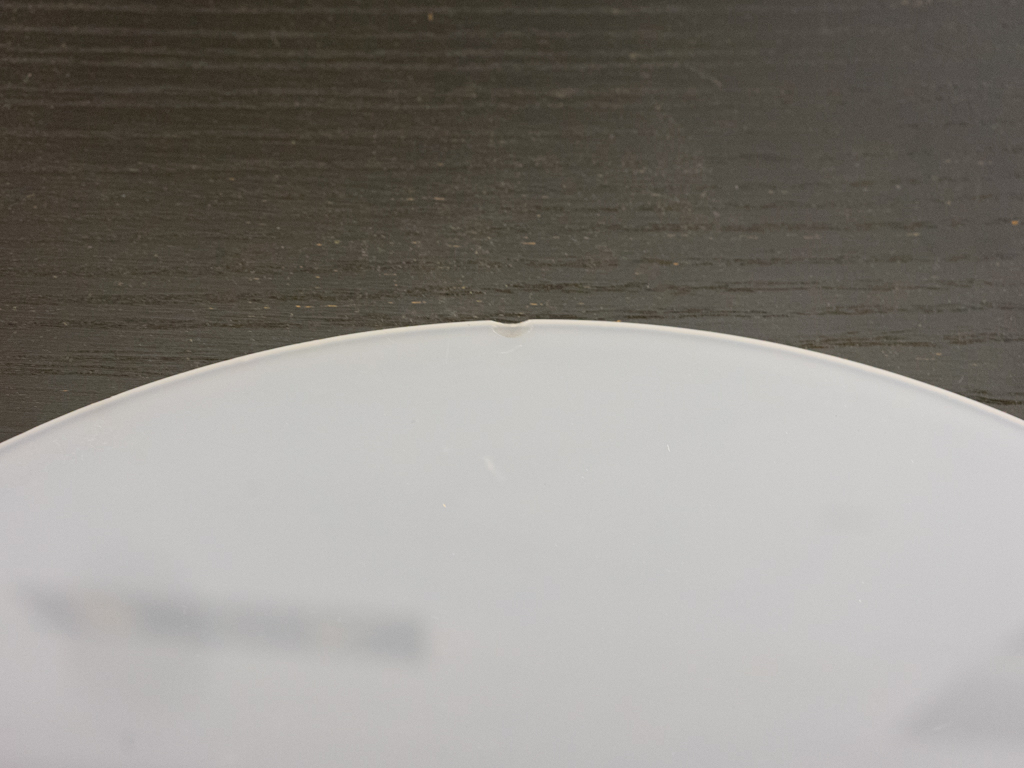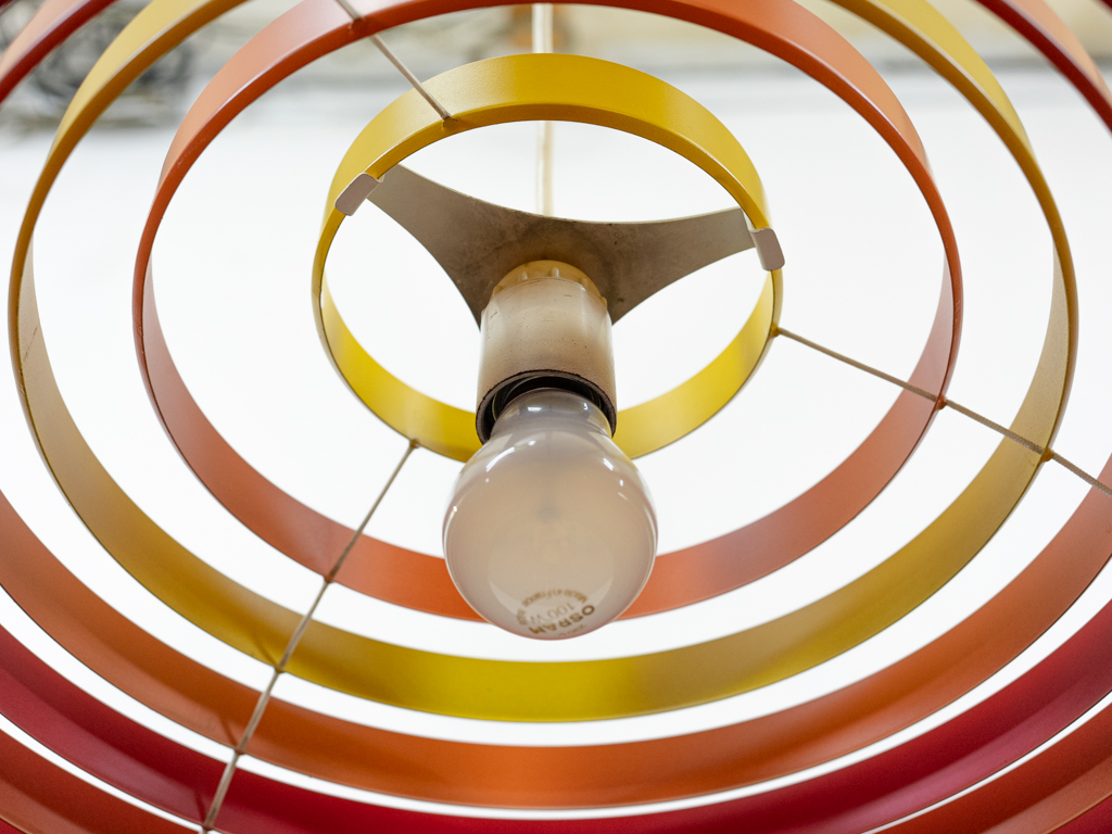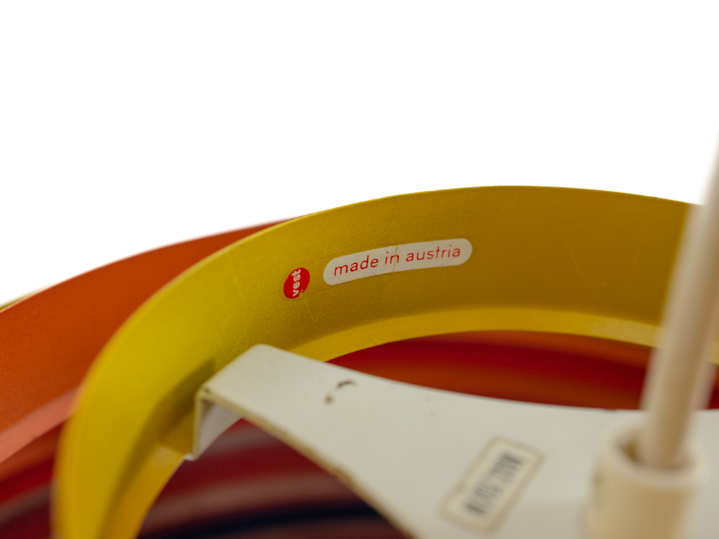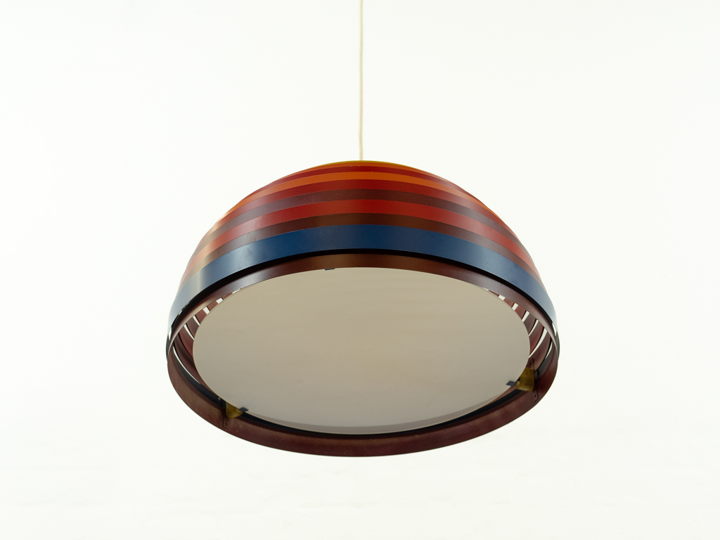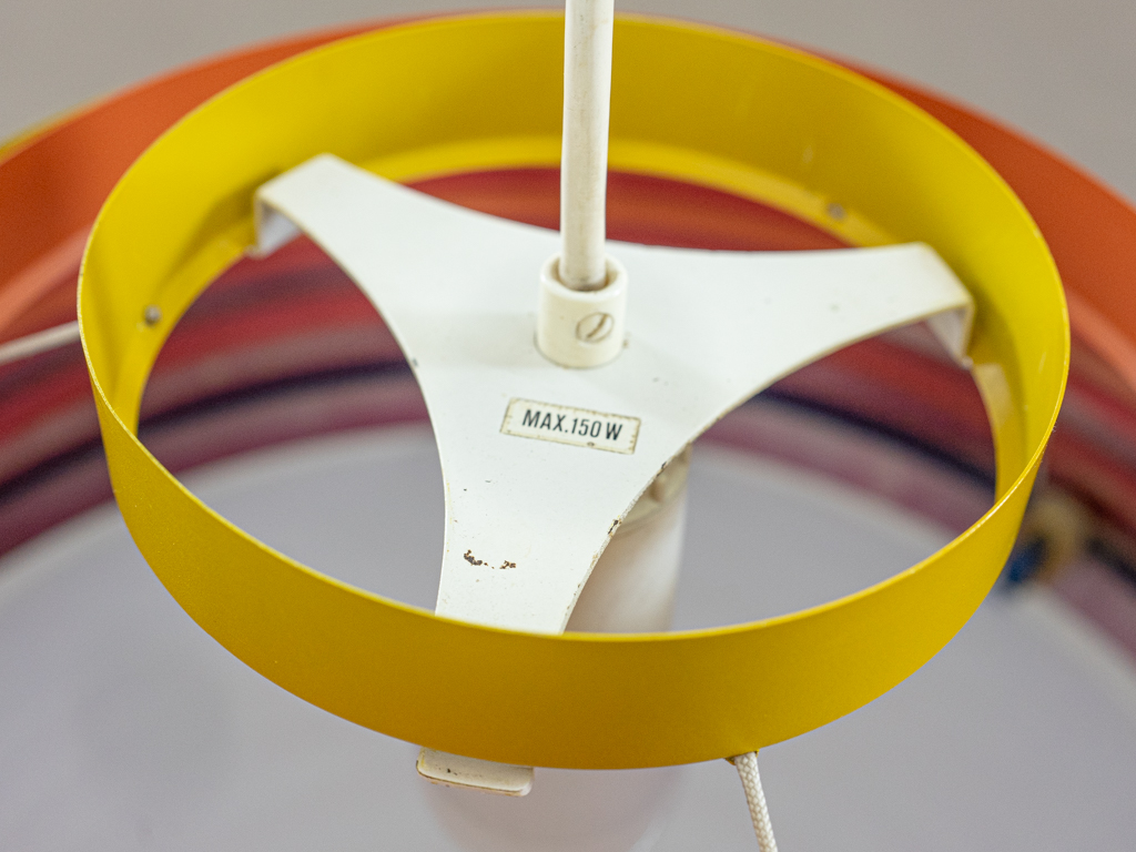 Deckenleuchte von Wilhelm Vest, Österreich. Die Lampe ist aus verschiedenfarbigen Metallringe aufgebaut die an 3 Nylonschnüren aufgehängt sind. Der untere Abschluss besteht aus einem Diffusor aus opaken Plexiglas. Maße: Durchmesser. 45cm, Schirmhöhe: 25.5cm, Abhängehöhe ca. 190cm. Kein Baldachin vorhanden. Kleinere Alters- und Gebrauchsspuren. Der Diffusor weist einen minimalen nicht sichtbaren Chip auf.