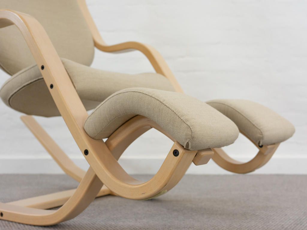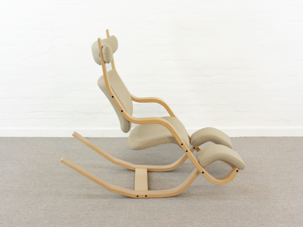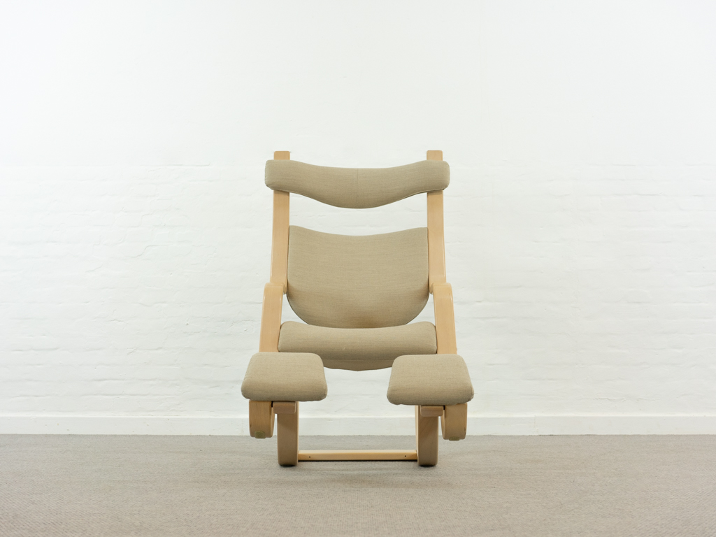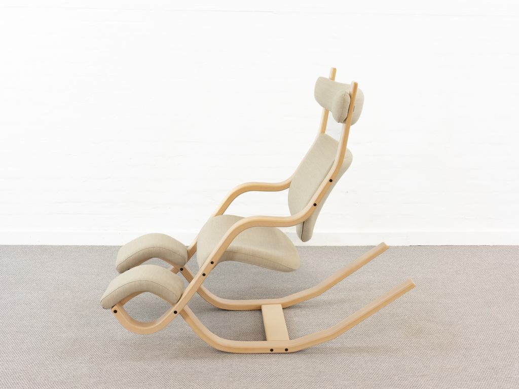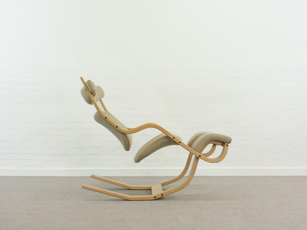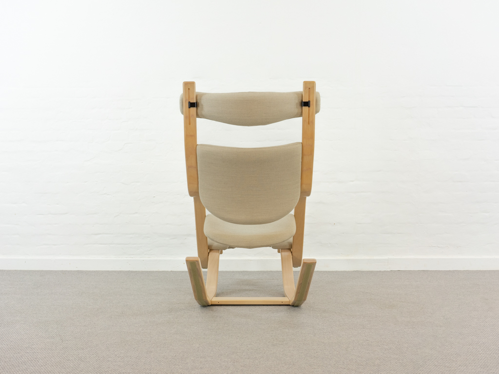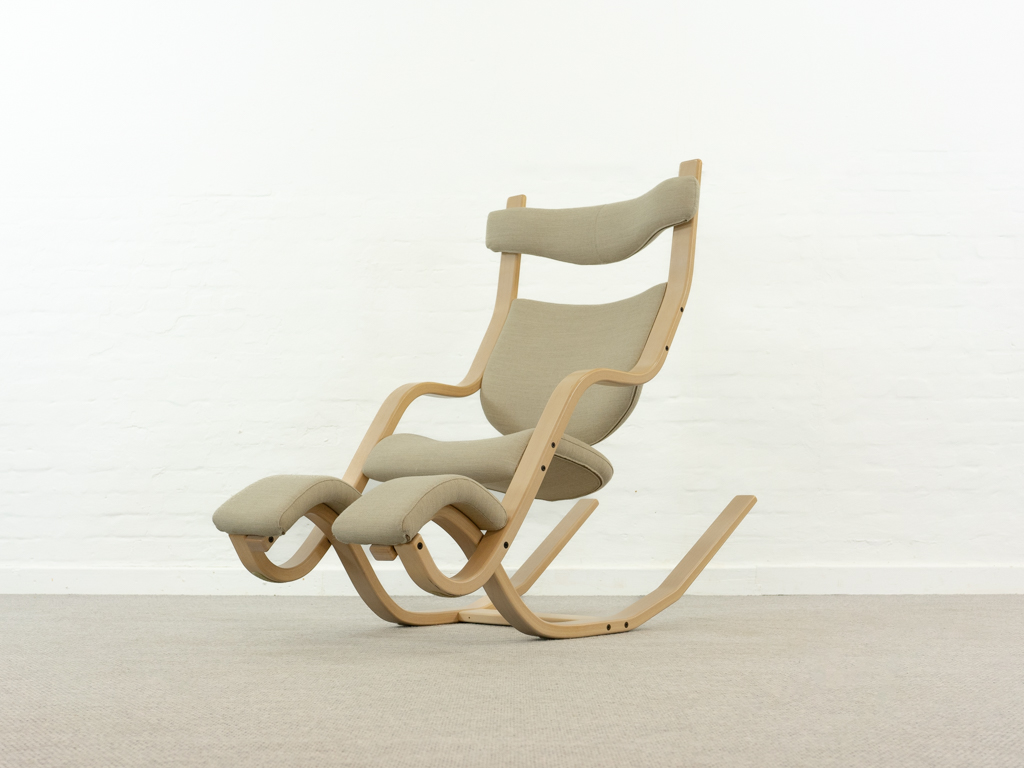 Gravity Balans Sessel, entworfen 1983 von Peter Opsvig für Varier, Norwegen. Dieser Sessel offeriert vier verschiedene Sitzpositionen von kniend bis vollständig zurückgelehnt. Sie müssen nur Ihr Körpergewicht verlagern, um in die verschiedenen Positionen zu gelangen. Von der bequemen Arbeitshaltung am Tisch bis hin zur völlig zurückgelehnten Schwebeposition. Sehr guter gebrauchter Zustand. Laminierte Buche und hellgrauer Bezug. Peter Opsvig ist bekannt für den sehr erfolgreichen Tripp-Trapp Kinderstuhl von Stocke. Nichtraucherobjekt.