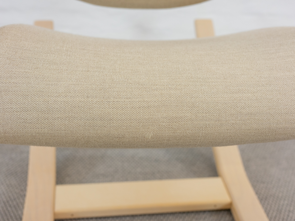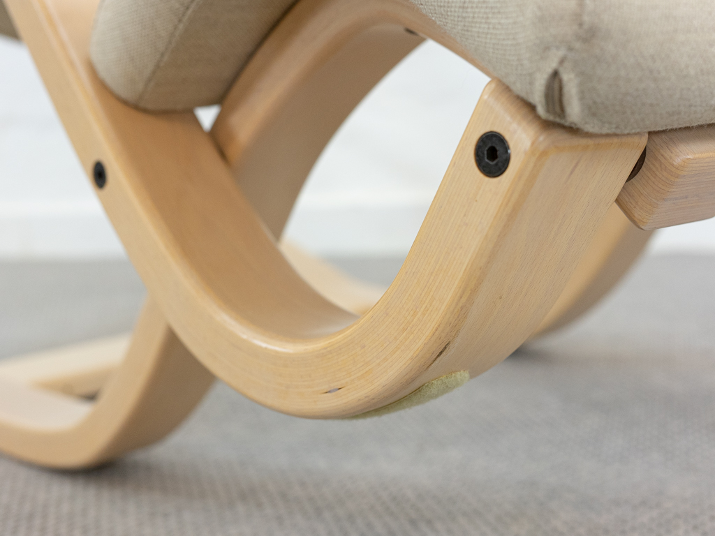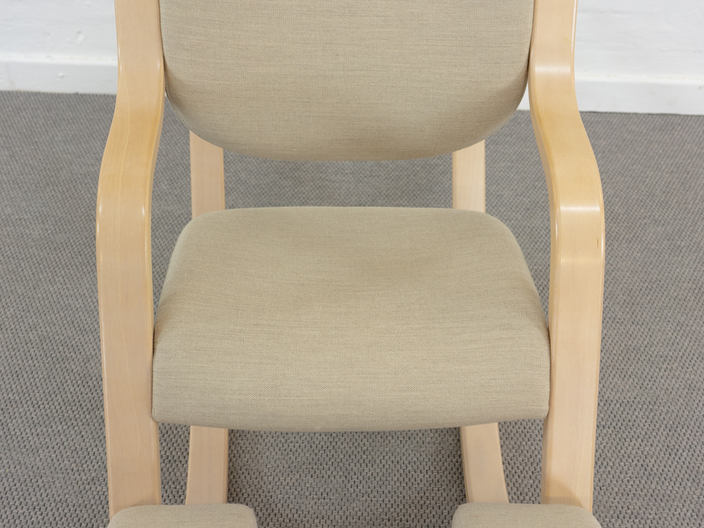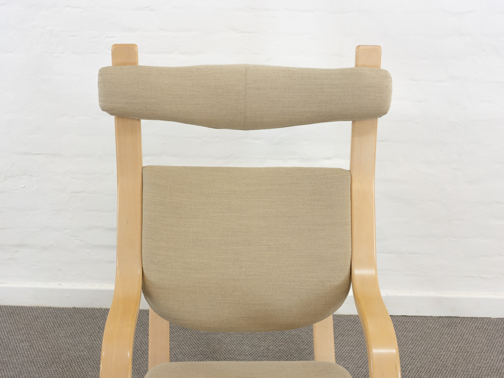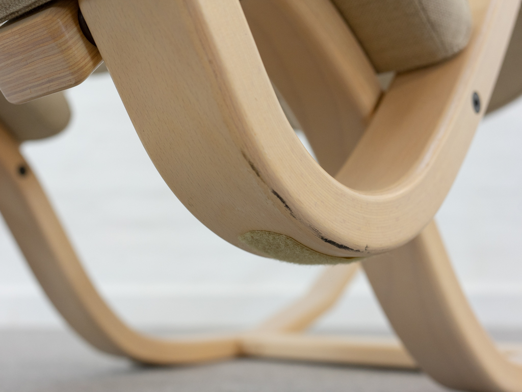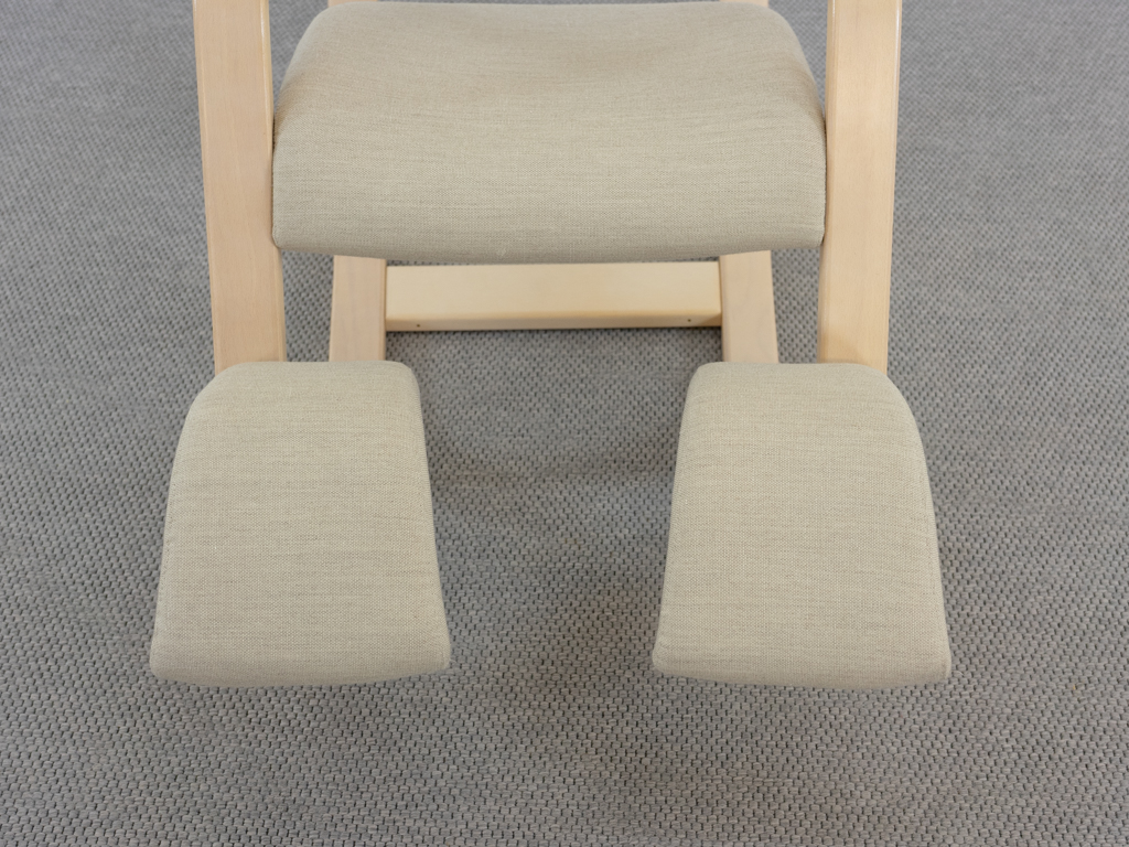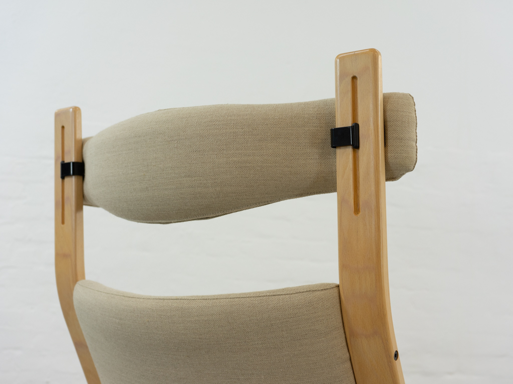 Gravity Balans Sessel, entworfen 1983 von Peter Opsvig für Varier, Norwegen. Dieser Sessel offeriert vier verschiedene Sitzpositionen von kniend bis vollständig zurückgelehnt. Sie müssen nur Ihr Körpergewicht verlagern, um in die verschiedenen Positionen zu gelangen. Von der bequemen Arbeitshaltung am Tisch bis hin zur völlig zurückgelehnten Schwebeposition. Sehr guter gebrauchter Zustand. Laminierte Buche und hellgrauer Bezug. Peter Opsvig ist bekannt für den sehr erfolgreichen Tripp-Trapp Kinderstuhl von Stocke. Nichtraucherobjekt.